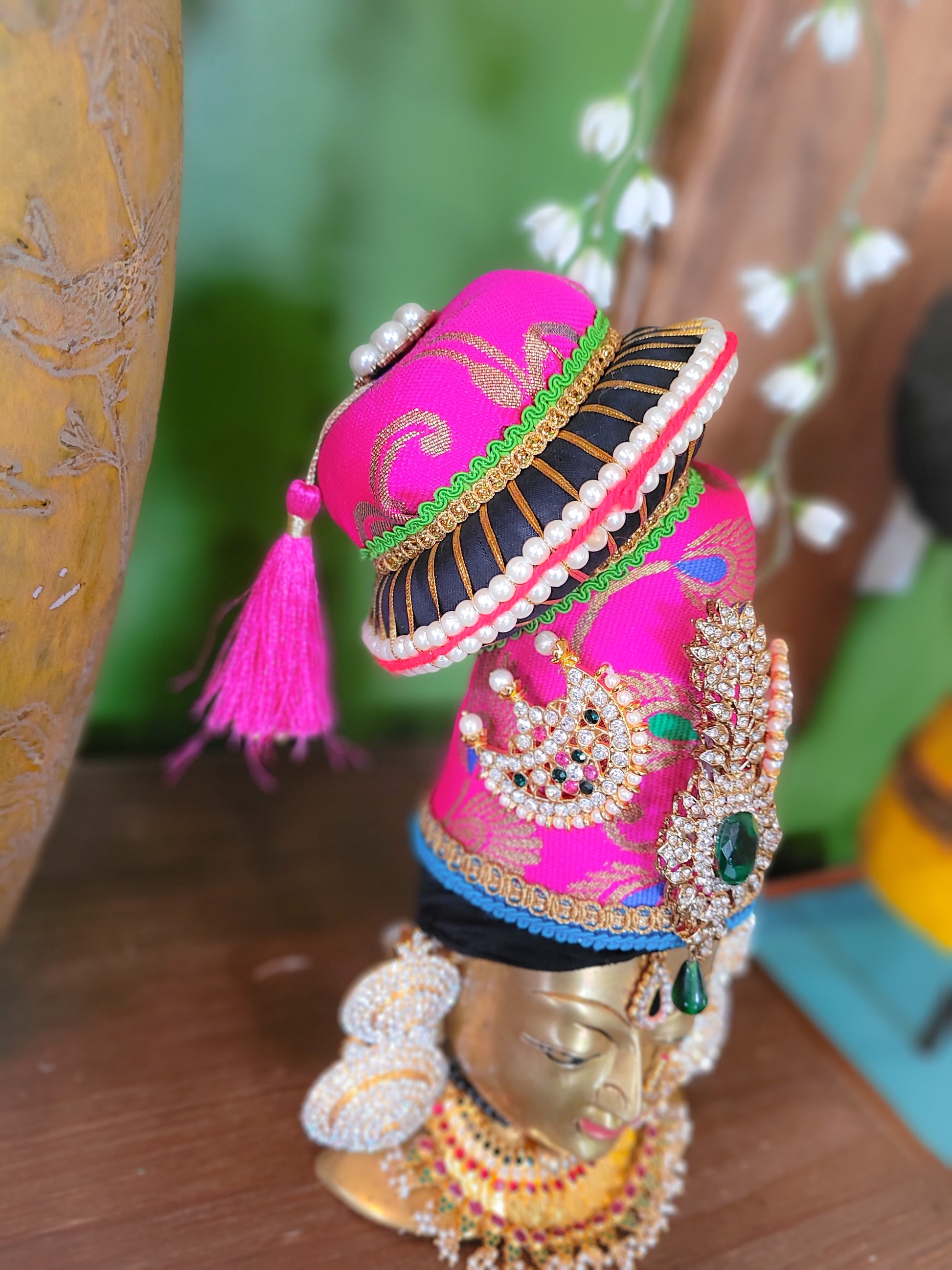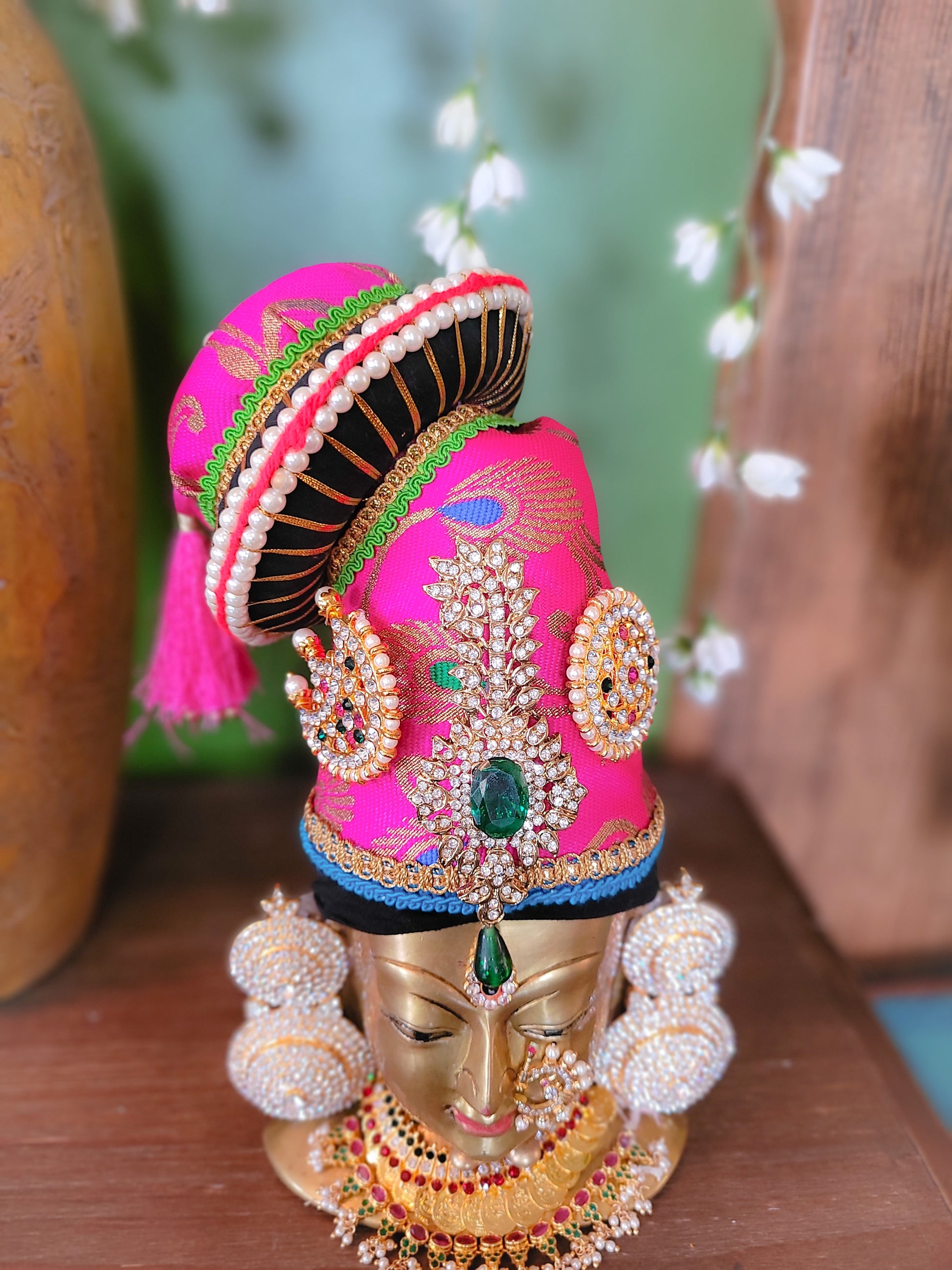 Adorn your Ammavaru idol with royal grace using the Vastra Kirita, a traditional Banaras-style crown that embodies timeless elegance and divine splendor. Intricately handcrafted with rich Banarasi fabric, zari work, and embellishments, this crown is perfect for invoking the regal presence of the Goddess during Navratri, Varalakshmi Vratam, or daily pooja rituals.