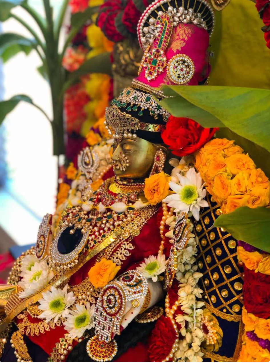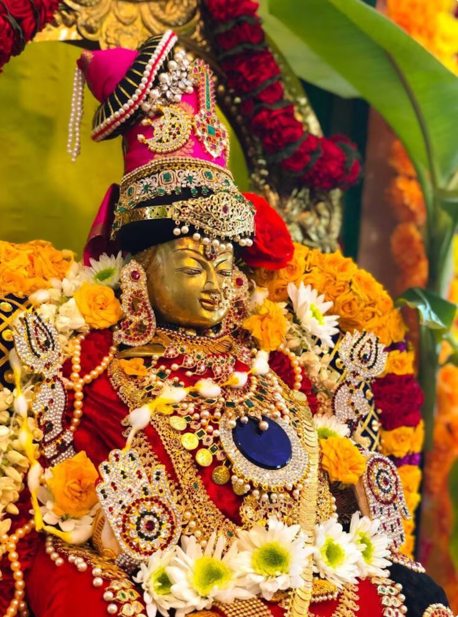 Place the crown slightly tilted back on the deity’s head to allow the detailing to show clearly, and surround the idol with fresh flowers like jasmine or roses to enhance the divine aura. Use warm lighting or a brass lamp nearby to bring out the sheen in the fabric.