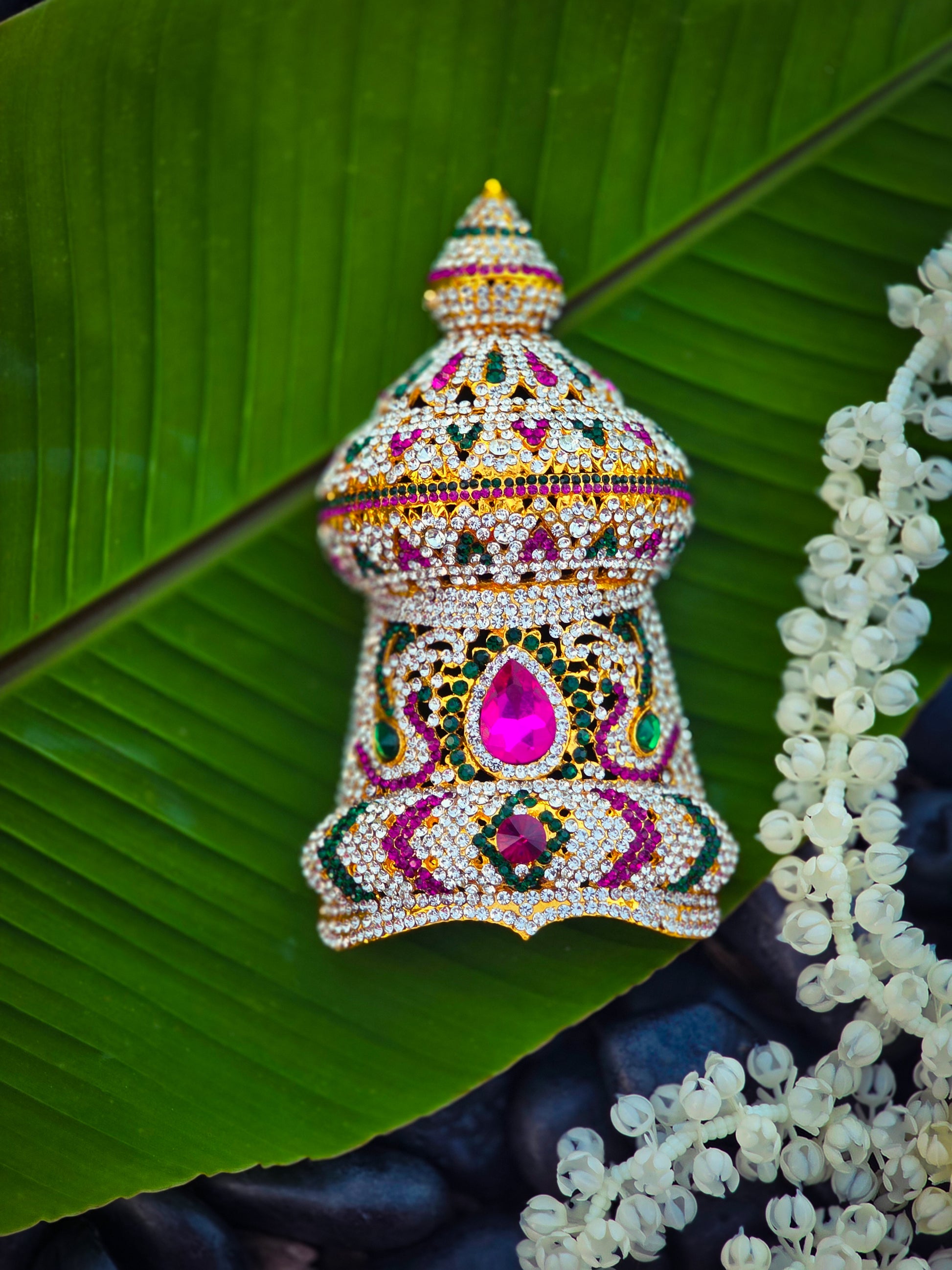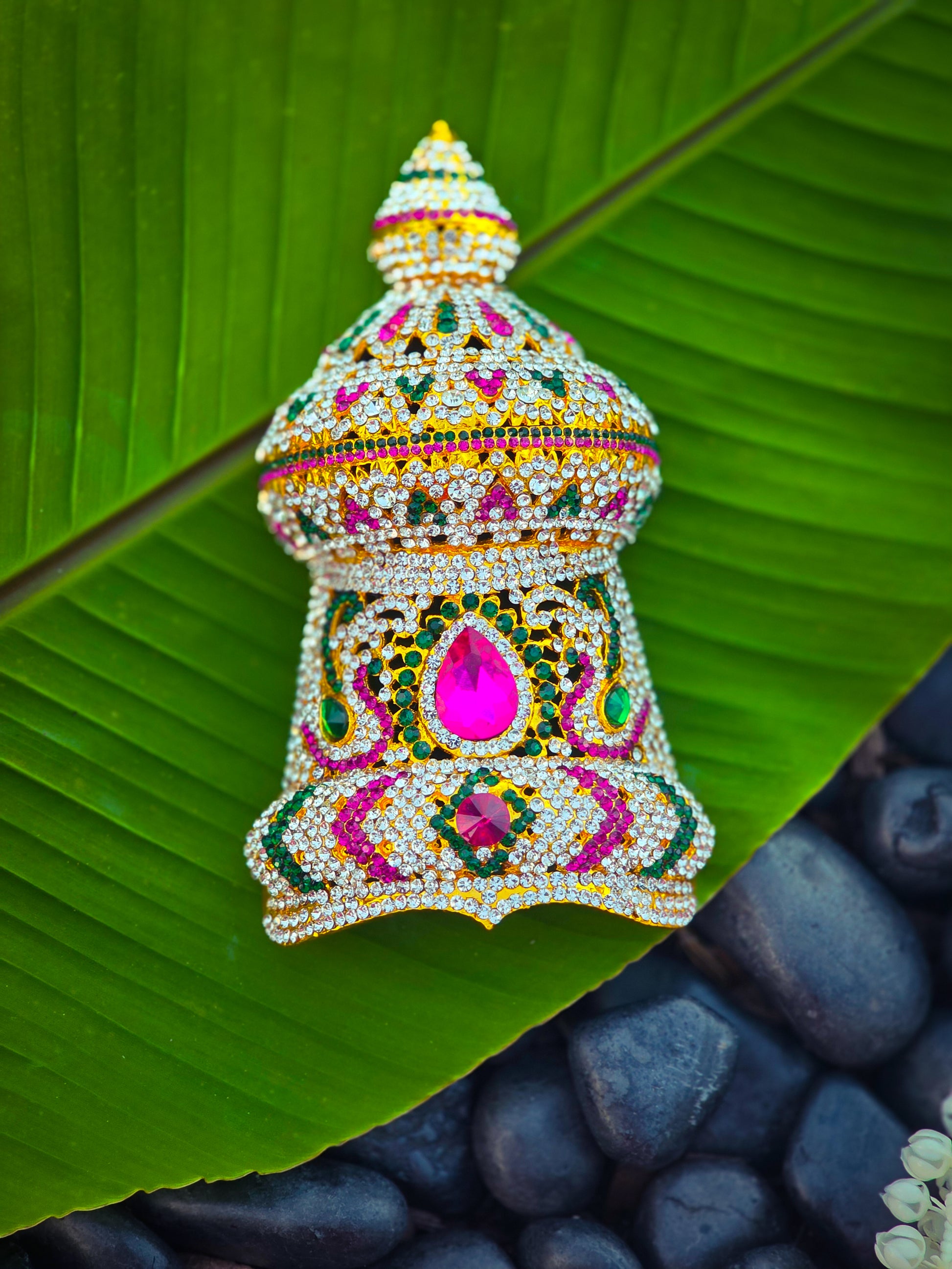 Adorn your beloved deity with the Ratna Kiritam – a stunning stone-studded crown that radiates divinity and splendor. Handcrafted with intricate detailing and vibrant stones, this crown brings a regal aura to your pooja setup. Each element is thoughtfully designed to reflect traditional temple artistry while adding a touch of color and grace to your idol.