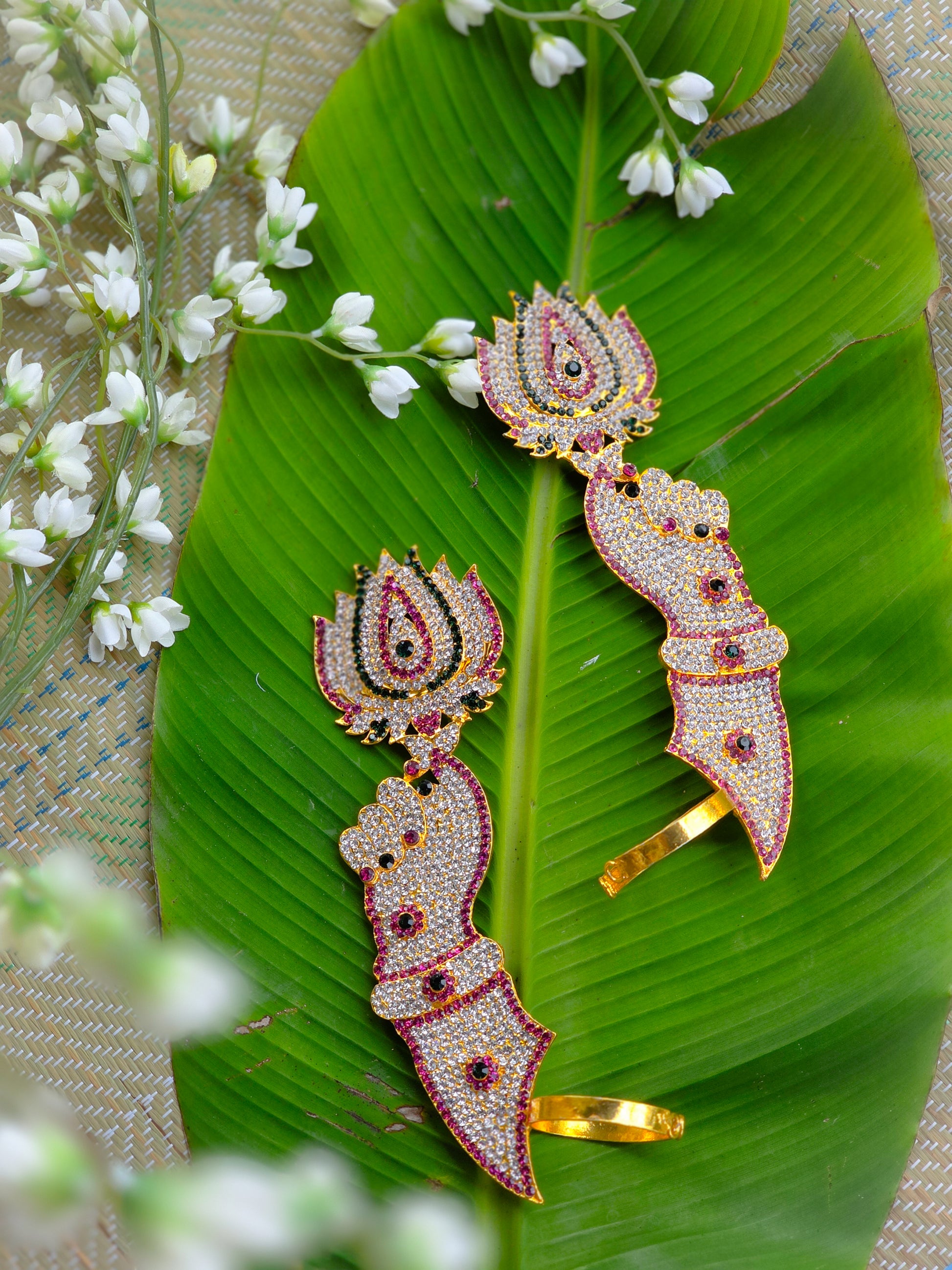 Position the Stone Lotus Hands slightly forward on either side of your deity idol to symbolize divine offerings or blessings. These pair beautifully with idols of Lakshmi, Saraswati, or Vishnu, especially when placed alongside a crown (mukut), armlets (vanki), and lotus base (padma peetam).