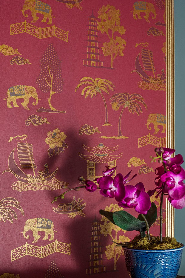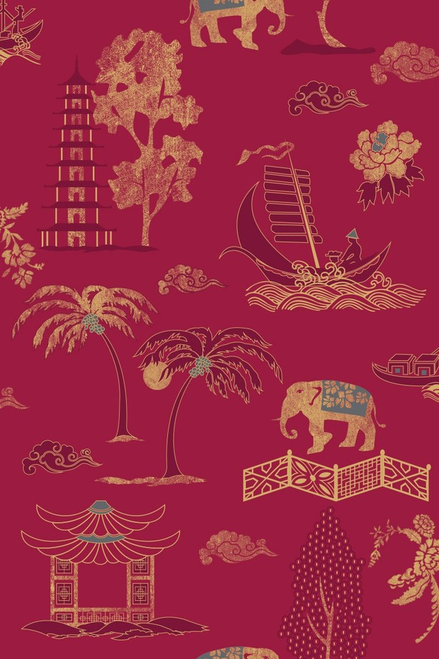 Rendered in a rich Chinoiserie style, August Moon invites you on a dreamlike journey through a land of pagodas, elephants, sailboats, and swaying palms. Delicate clouds drift across the scene as the August moon hides just out of sight, lending a sense of wonder and quiet movement to the design.