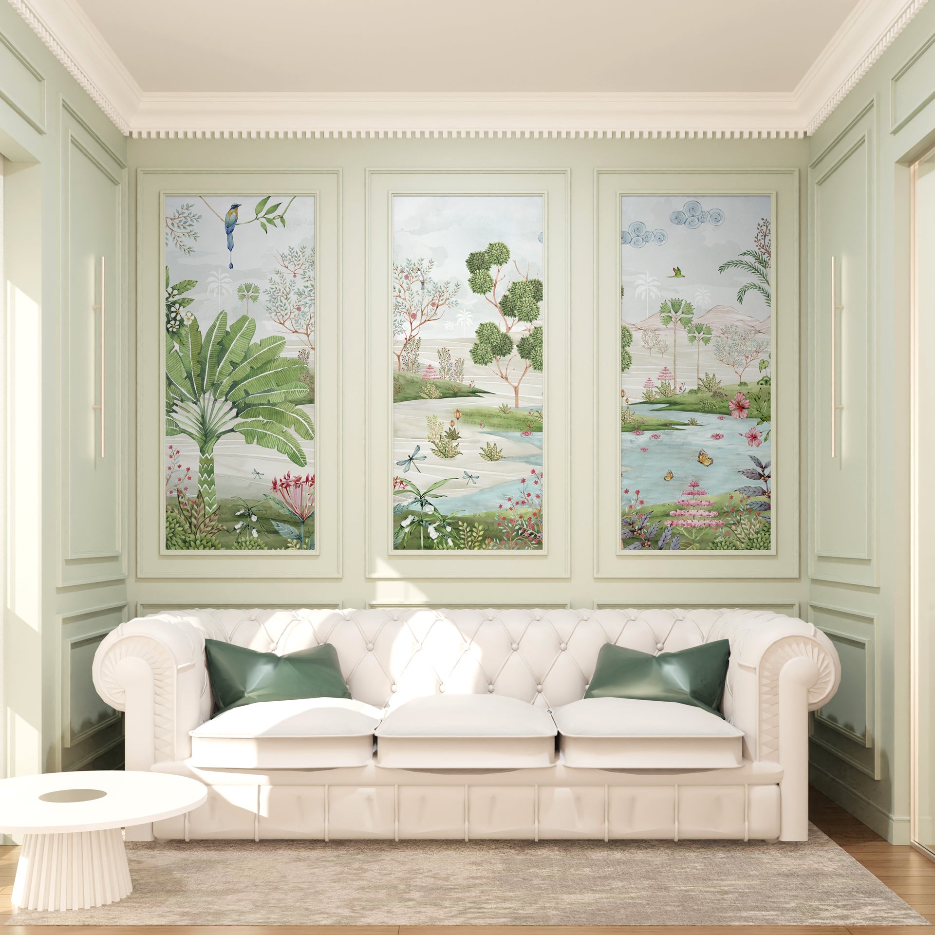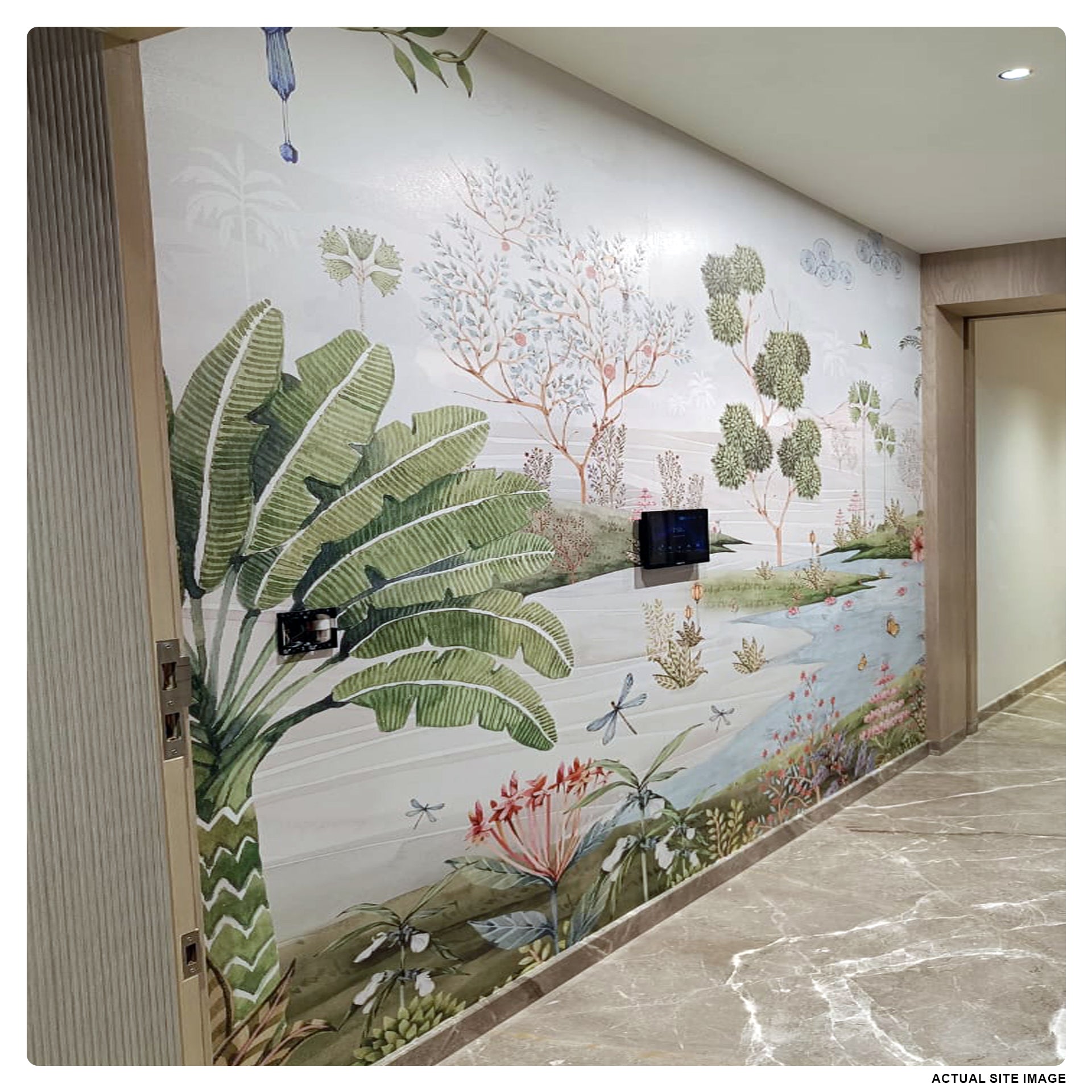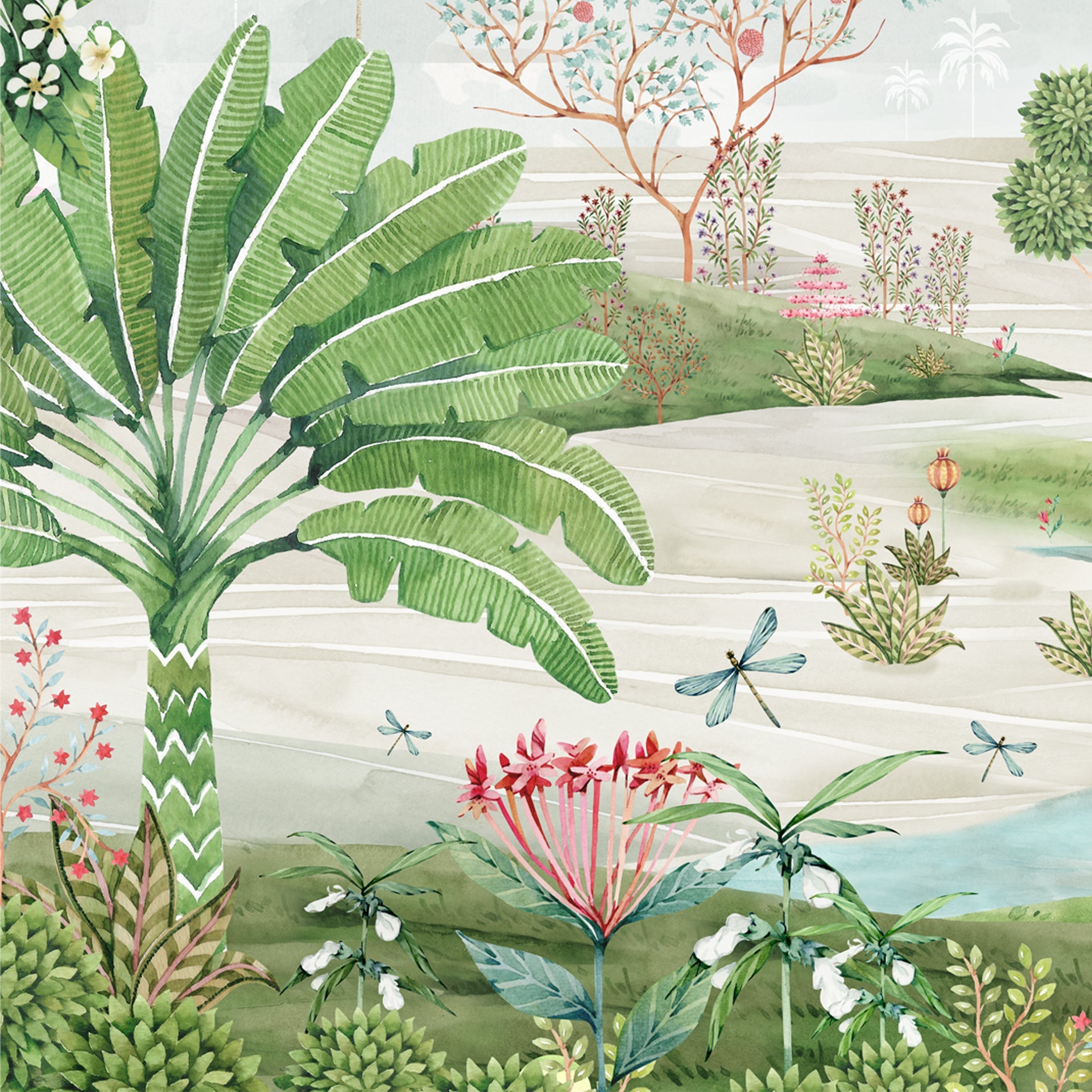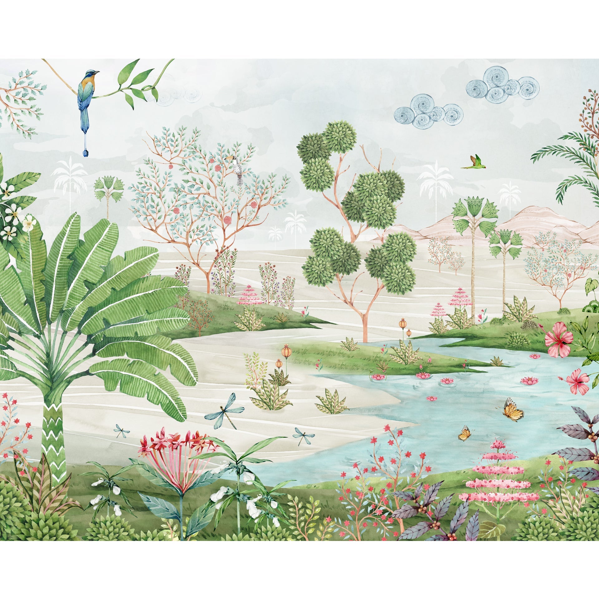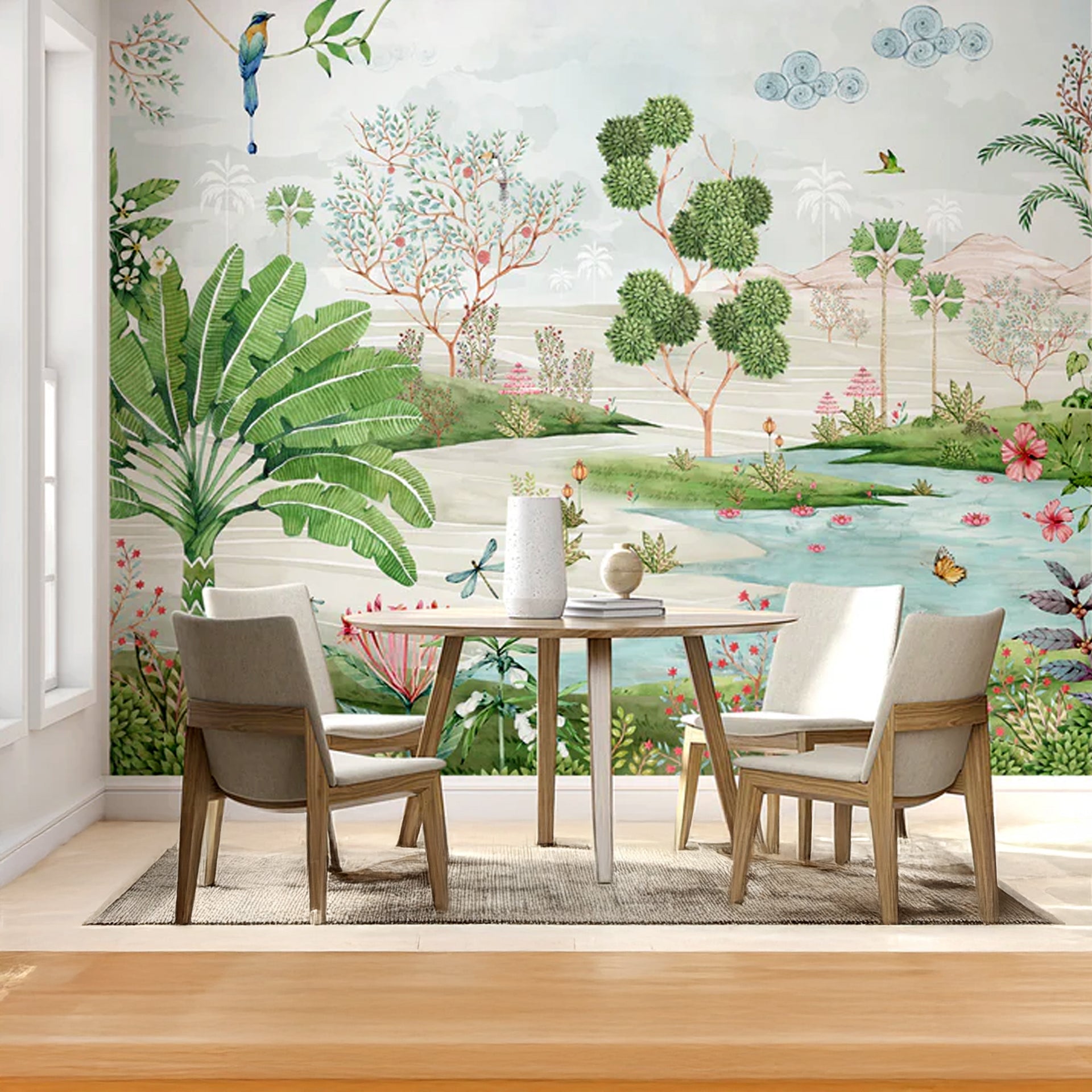 Custom Hand-painted Bali Tropical Mural Wallpaper with lush coconut trees, vibrant butterflies, tranquil lakes, blooming flowers, and exotic birds, it’s the perfect choice for a farmhouse or tropical-style retreat. Ideal for those seeking Bali-inspired wall decor or tropical mural wallpaper for villas, resorts, or countryside homes.