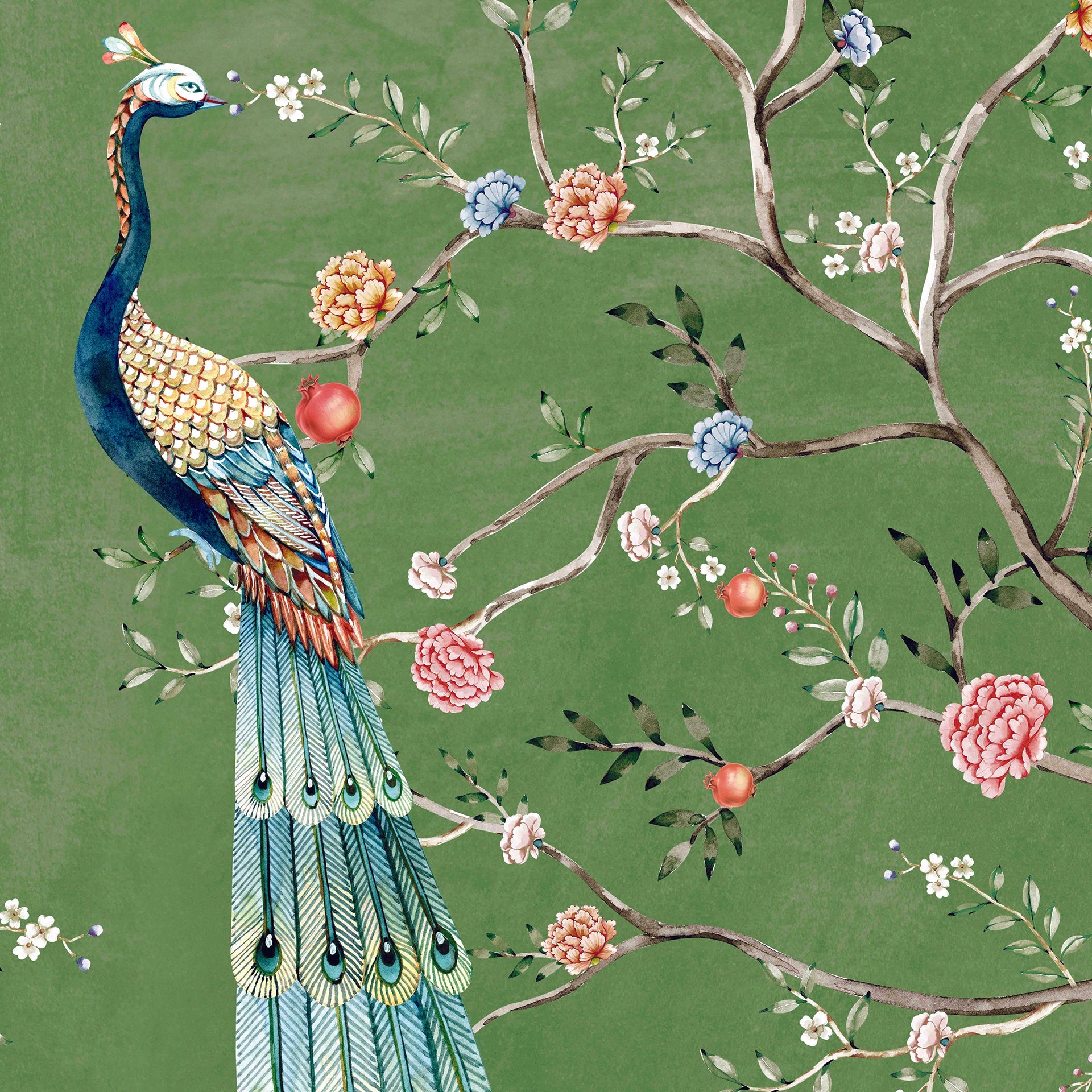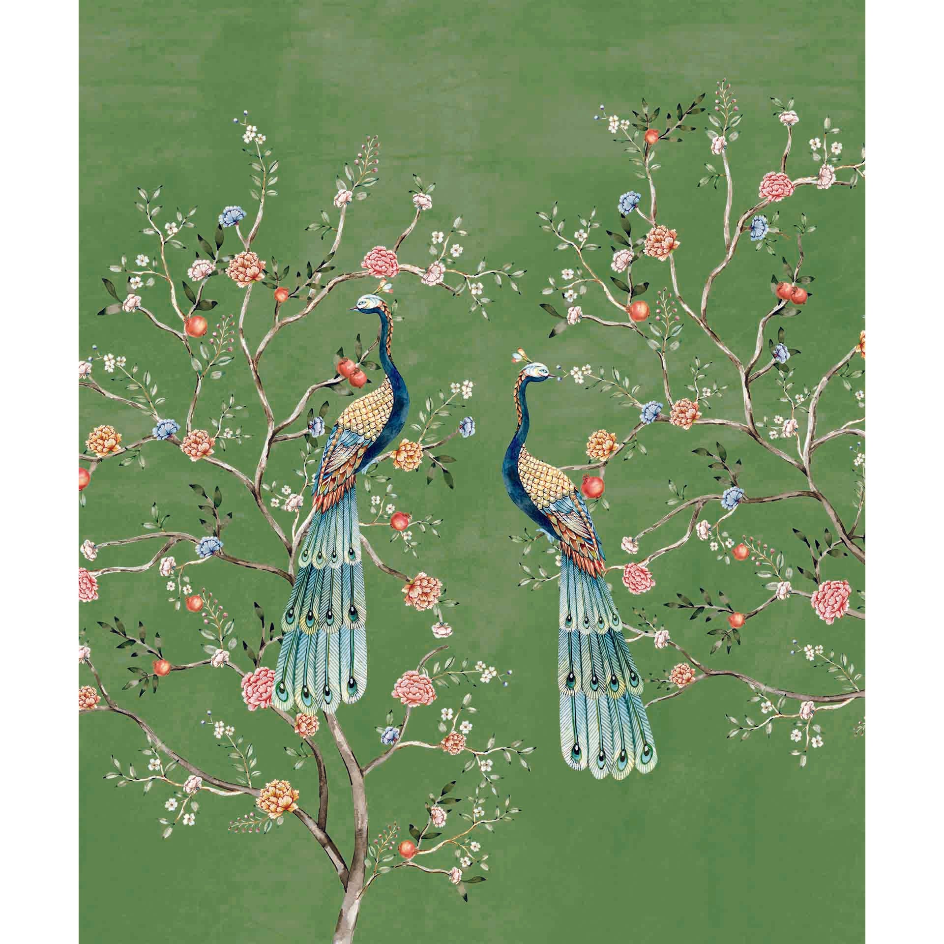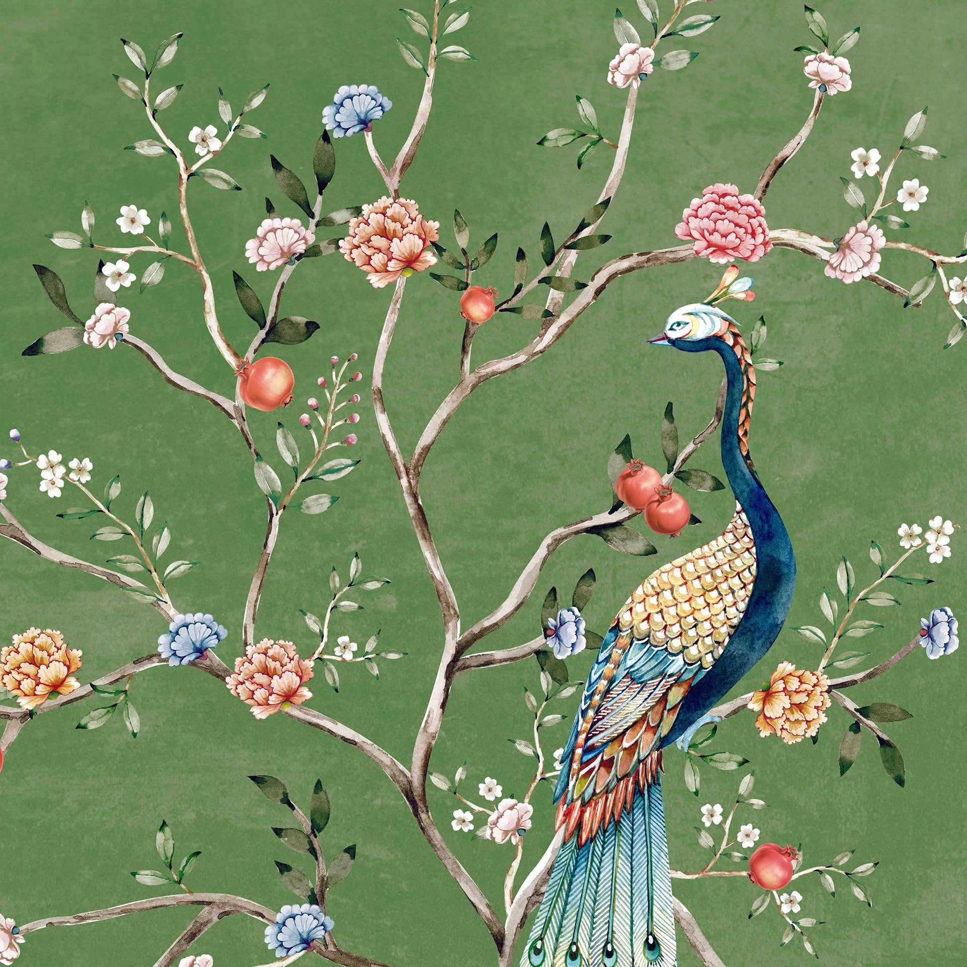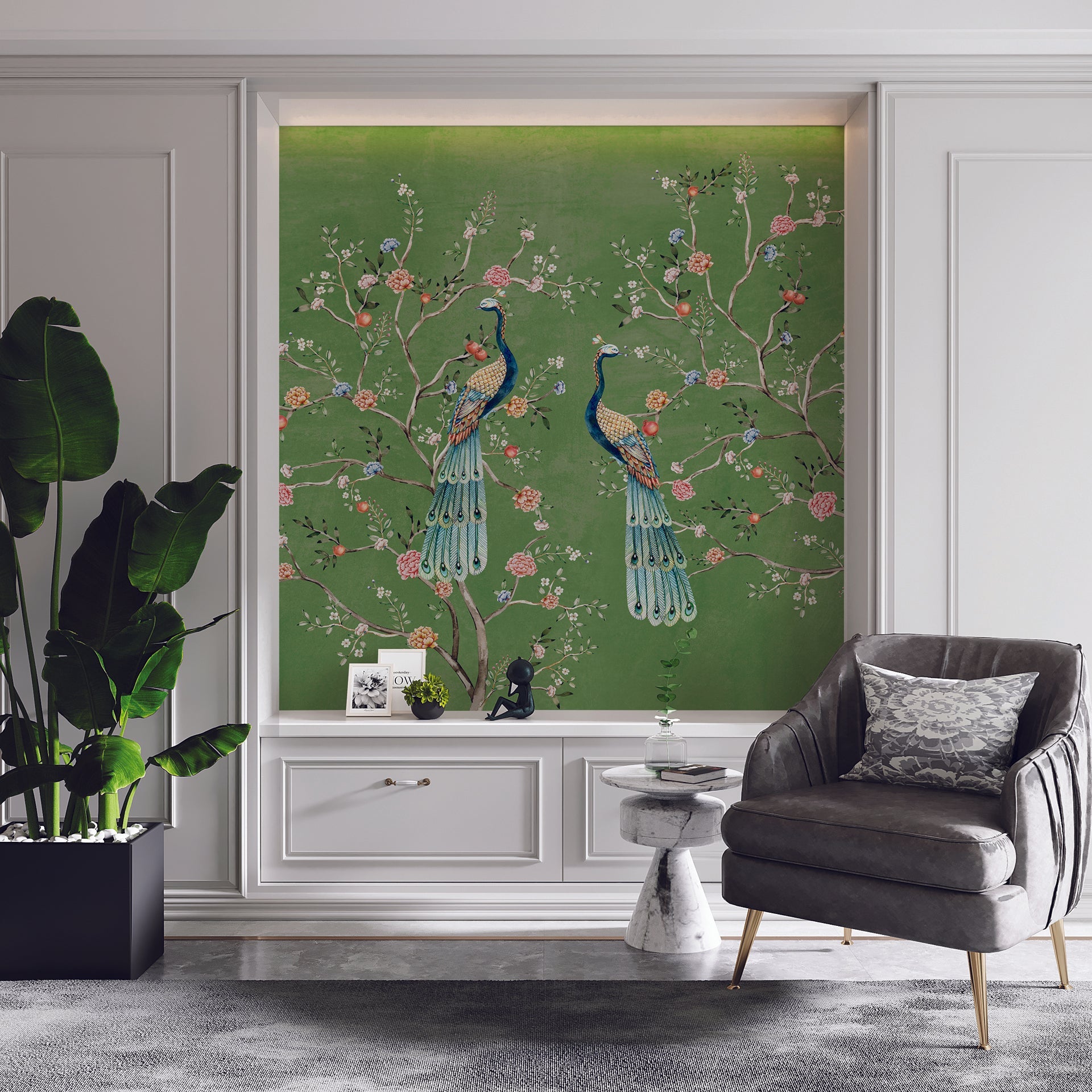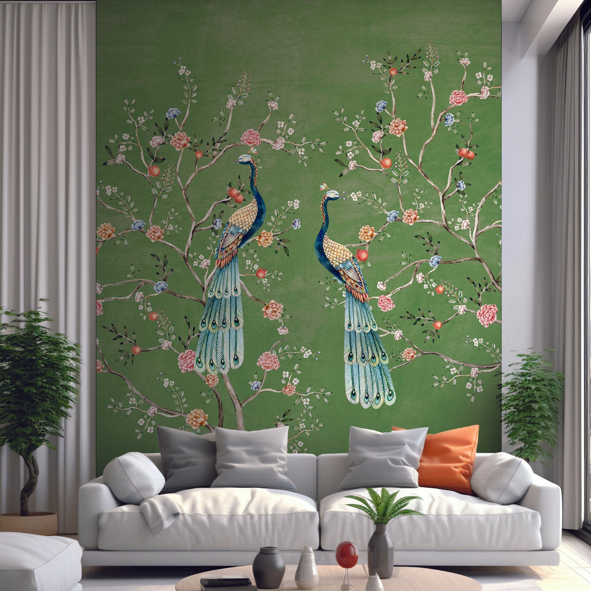 Beautiful Peacocks on flower branches set against a soothing green background, this design brings a serene, nature-inspired charm to any room. Perfect for living rooms, bedrooms, or accent walls, this wallpaper adds a luxurious and timeless touch to your decor.