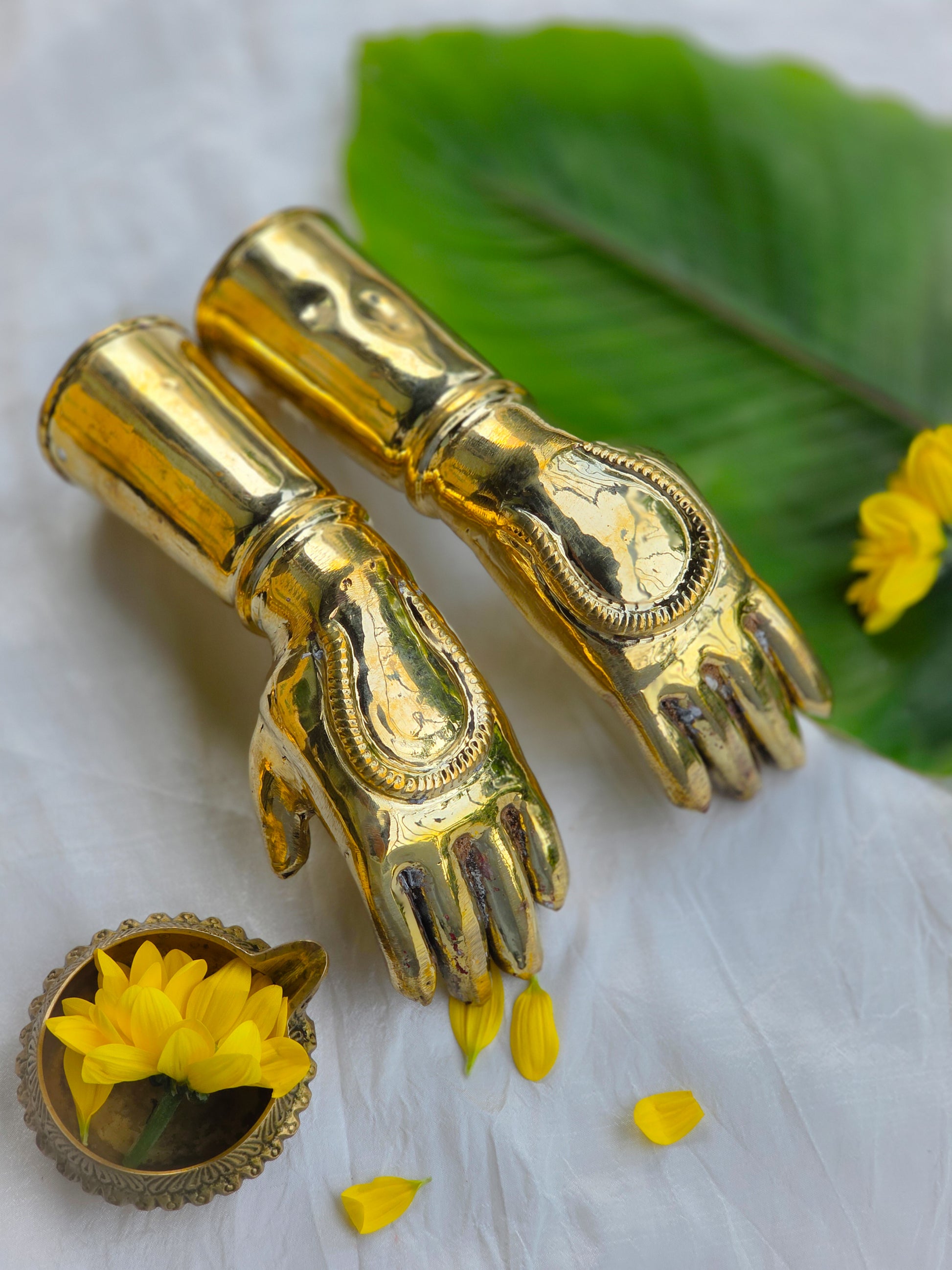 These side hands look divine hen paired with silk vastram and fresh flower malas. Add a soft spotlight or oil lamp glow to highlight the metallic shine and intricate detailing of the brass.
