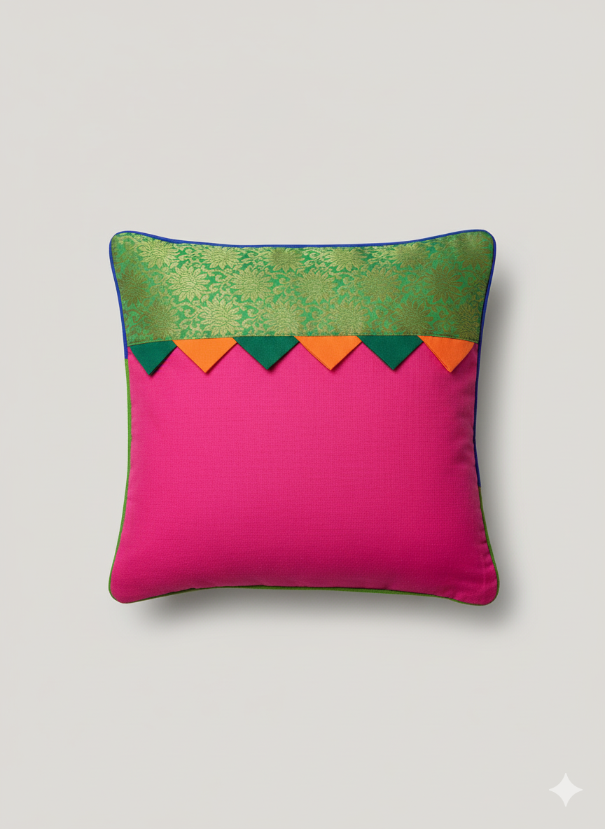 A harmony of old-world textiles and modern design, this brocade cushion collection brings the beauty of traditional silk weaves into contemporary living. Inspired by festive pattu borders and vintage zari motifs, each cushion blends jewel-toned fabrics with crisp patchwork layouts that feel both nostalgic and stylish. The shimmering threads echo heritage craftsmanship, while the bold color play and clean geometry make them effortlessly at home in today’s interiors — a vibrant fusion of culture, comfort, and modern aesthetics.