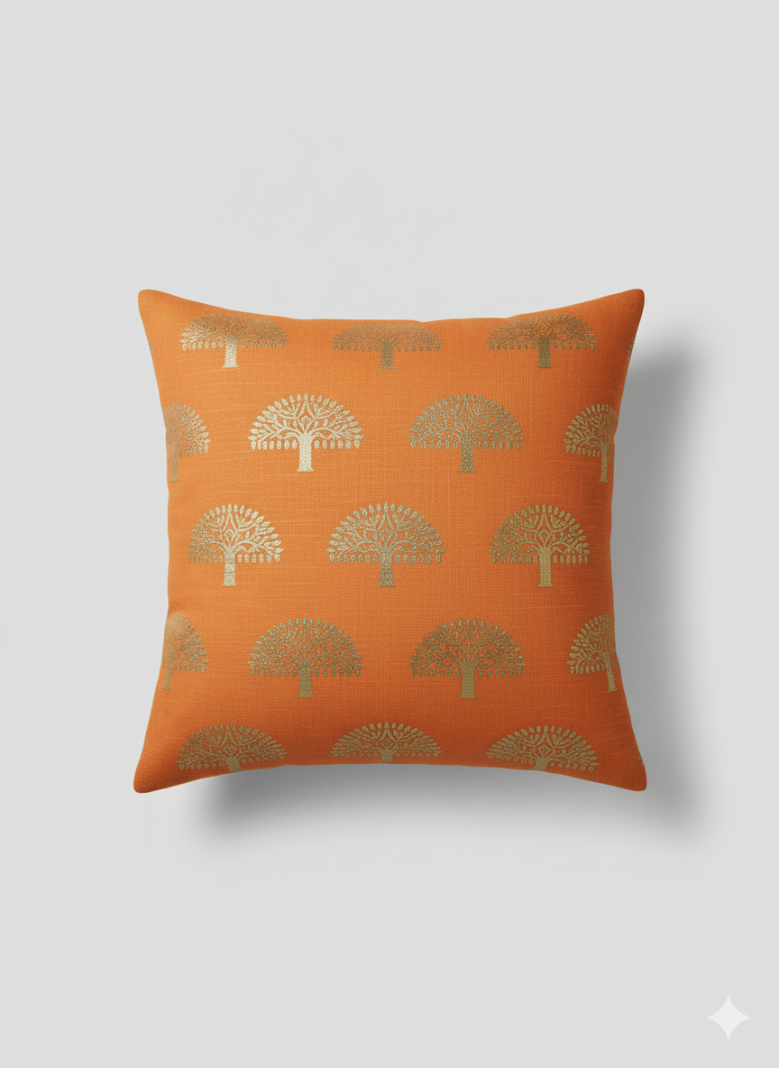 A symbol of prosperity and calm, the Hiranmaya Taru cushion blends the warmth of traditional motifs with the elegance of contemporary silk décor. Set against a vibrant saffron-orange base, each golden tree blooms like a miniature artwork—radiating abundance, balance, and festive charm. The silk-finish fabric adds a soft sheen, making this piece a refined accent for modern homes that still hold space for heritage touches.