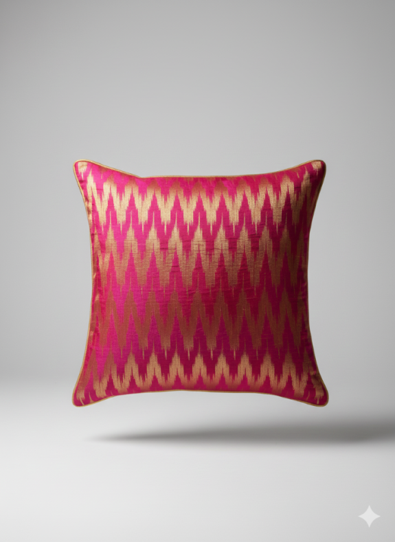 A celebration of richness and refinement, the Kanaka Mugdha collection brings together the timeless glow of traditional gold motifs with the sleek sophistication of modern silk decor. Every cushion cover pairs luminous zari-inspired prints with contemporary silhouettes, creating decor accents that feel both festive and effortlessly stylish. Whether layered into everyday living spaces or reserved for special occasions, this curation adds a touch of regal charm without overpowering the room—making heritage feel beautifully modern.