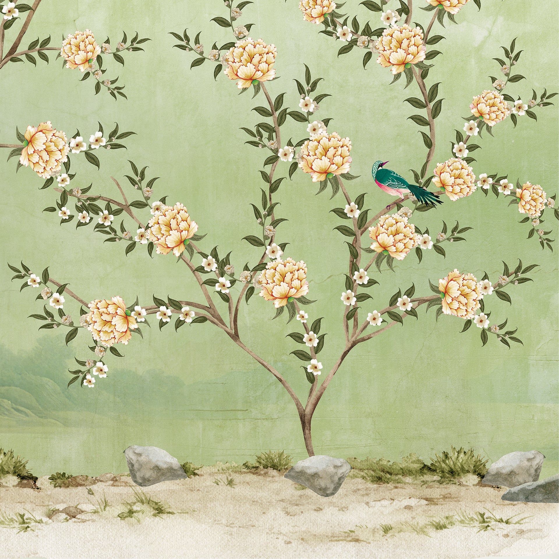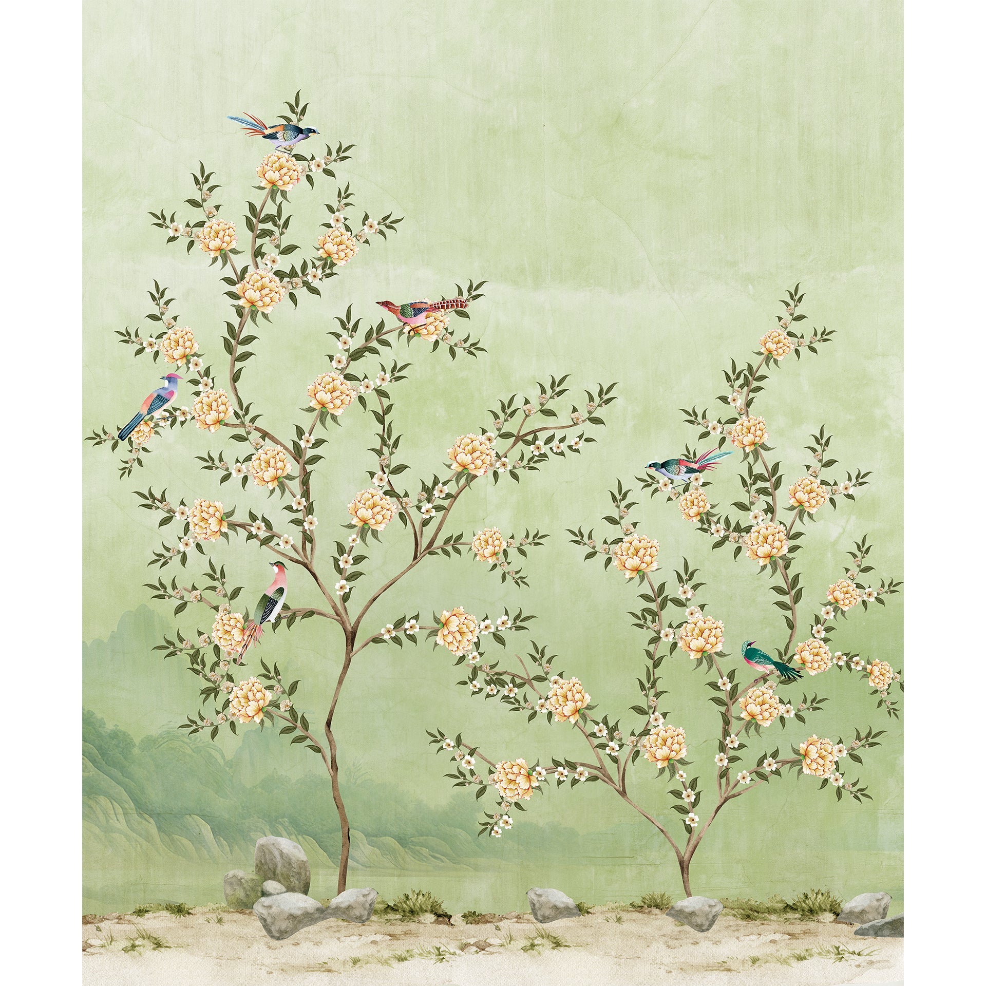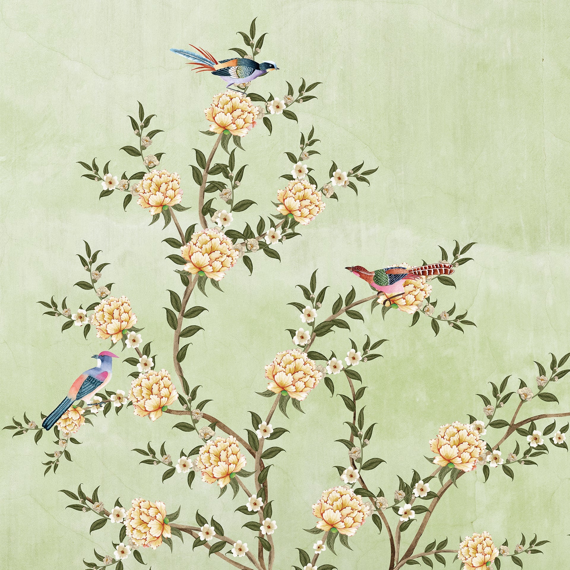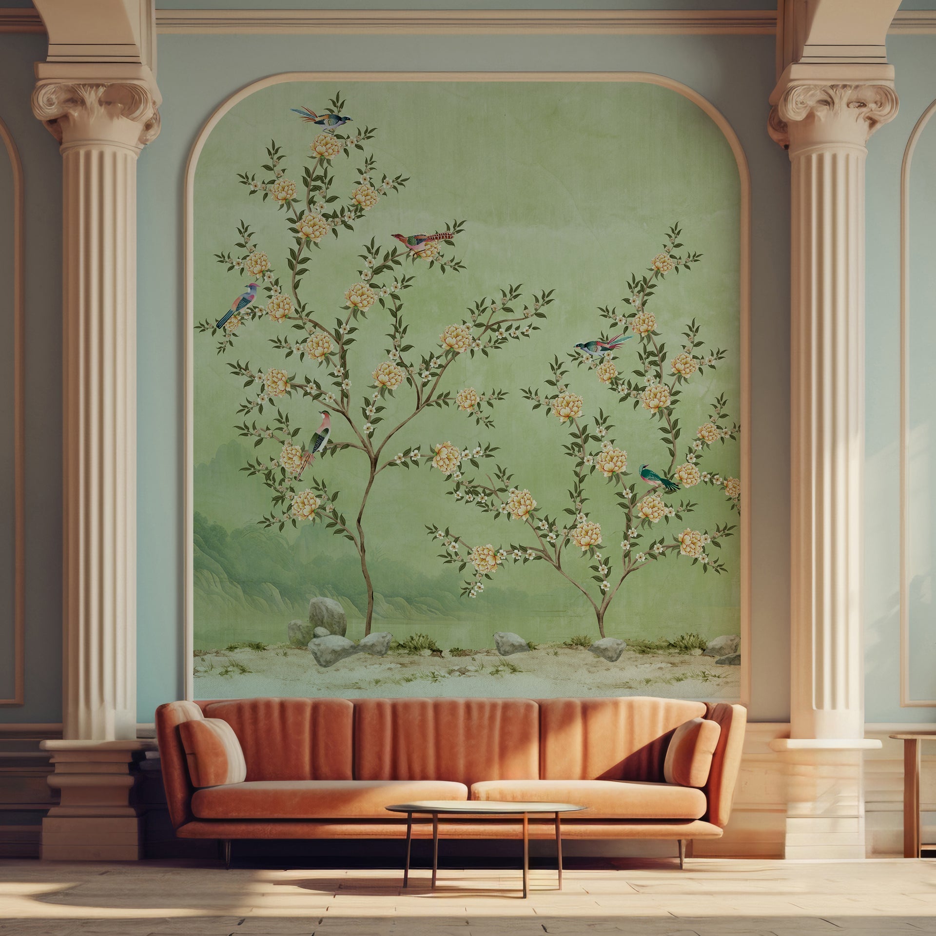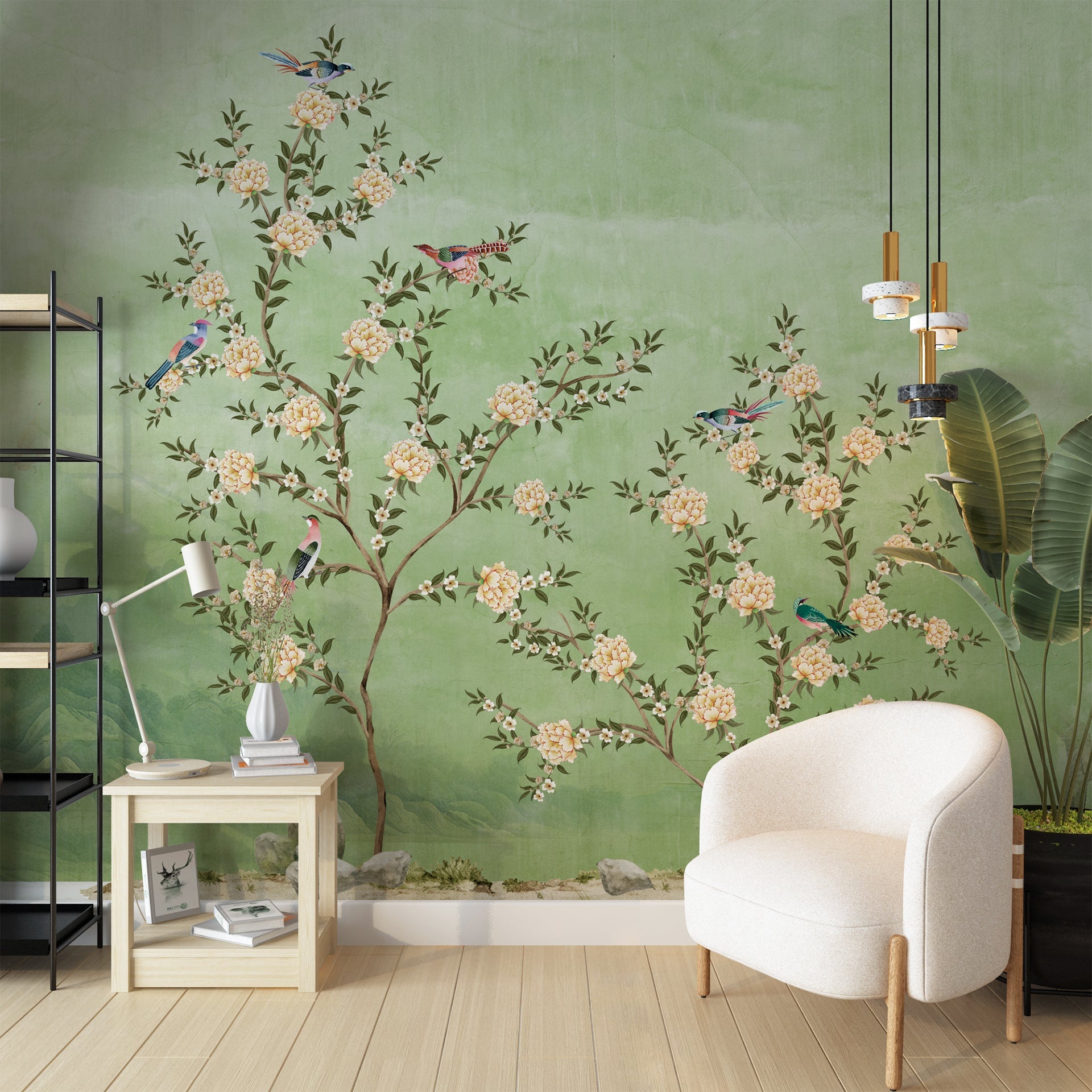 Asian-style floral wallpaper featuring delicate birds in soft pastel hues. Perfect for calming bedrooms, statement dining room wall or elegant living rooms, this design blends nature-inspired motifs with subtle color tones to create a timeless and peaceful wall accent. Ideal for feature walls or full-room decor.