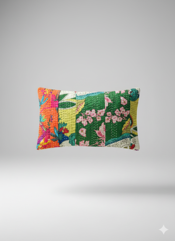 Chitra Sugandhika brings together vibrant kantha patchwork in a lively mix of greens, oranges, yellows, and florals—each segment echoing the charm of hand-stitched artistry. The cushion carries a playful, heritage-rooted aesthetic, uplifted by a modern patch-panel layout that feels both organic and joyful. With its soft kantha texture and colorful botanical motifs, it instantly adds warmth and personality to any setting.