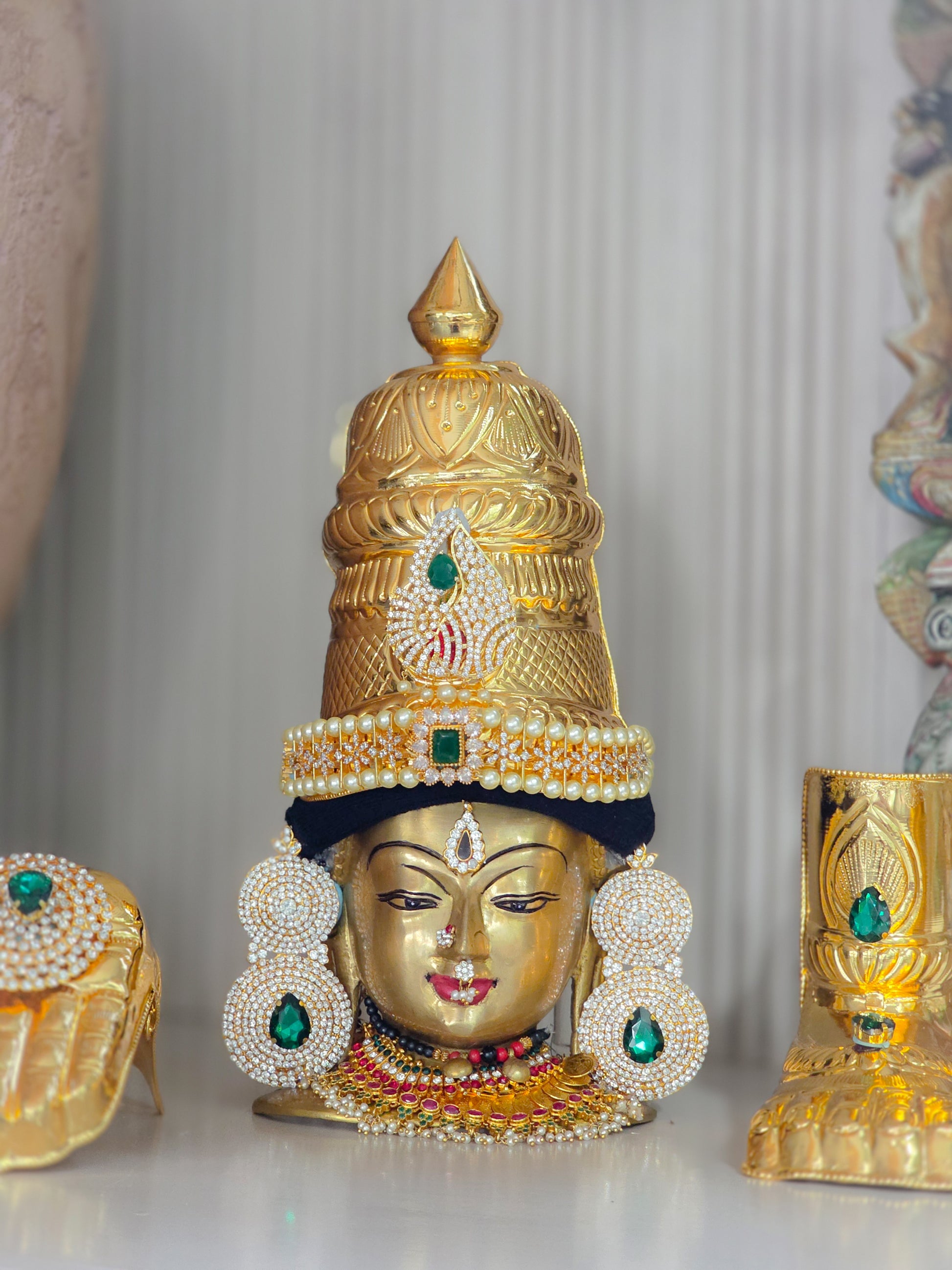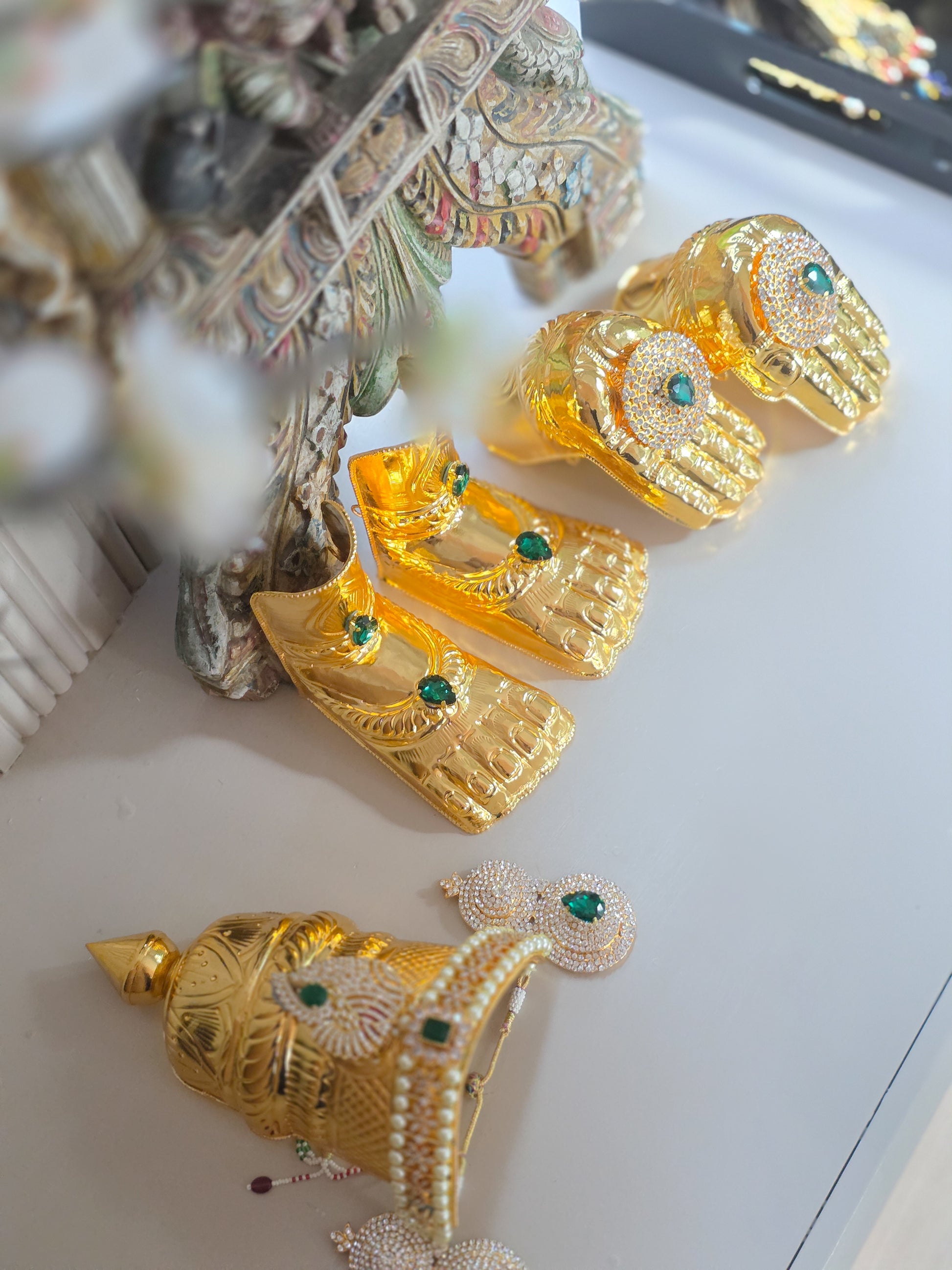 Inspired by the gentle radiance of the moon and the rare beauty of Green diamonds, the Rohini Kiritam is a crown of subtle luxury and divine femininity. Crafted with shimmering green diamond like stones pendant and choker set in a traditional crown base, this piece embodies grace, love, and celestial charm — perfect for goddesses like Ammavaru, Lakshmi, or Lalitha Devi.