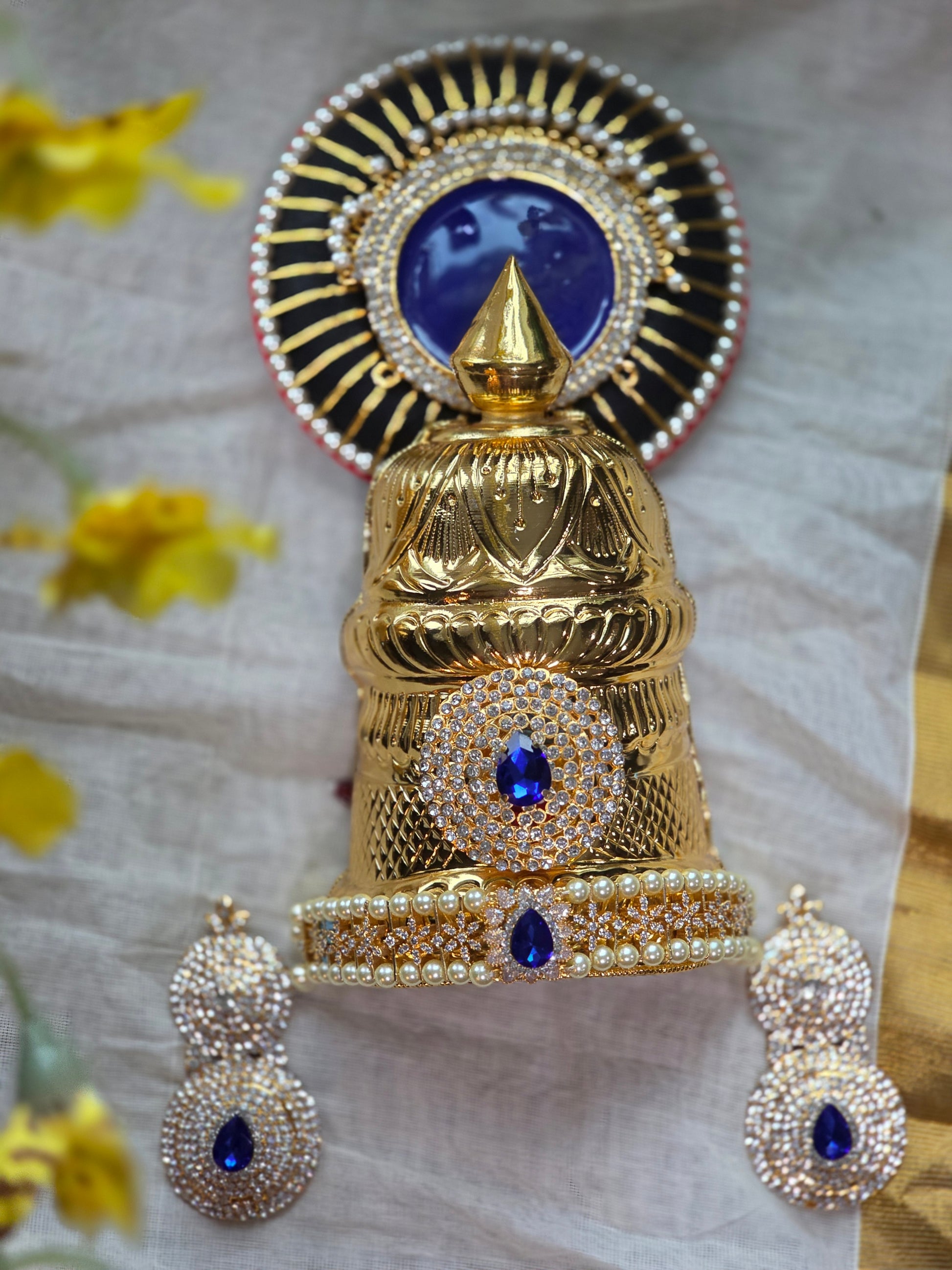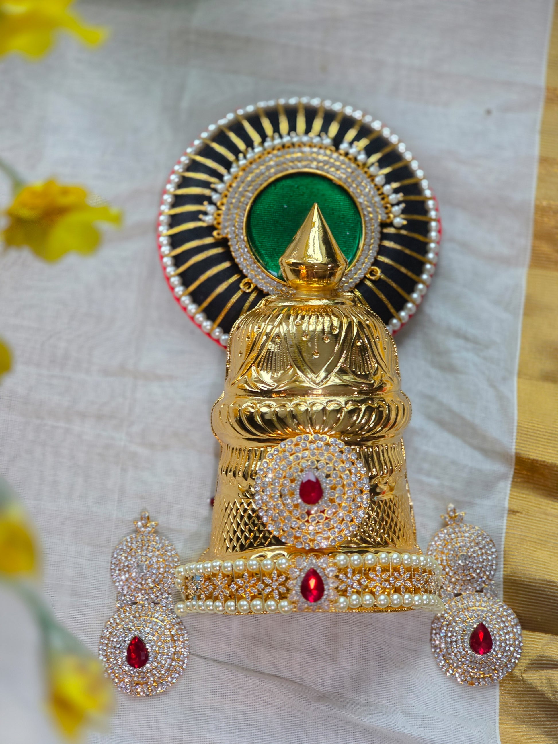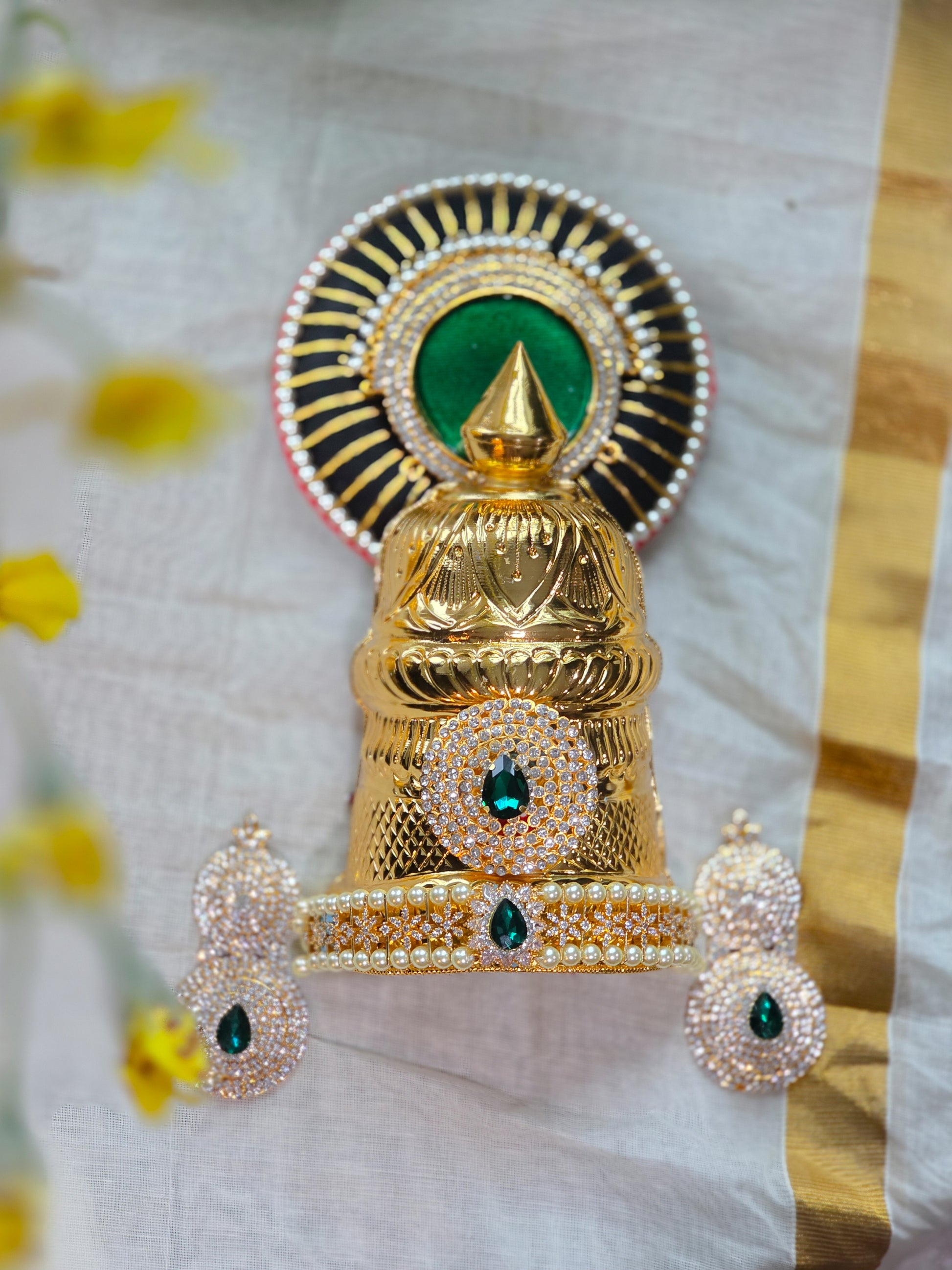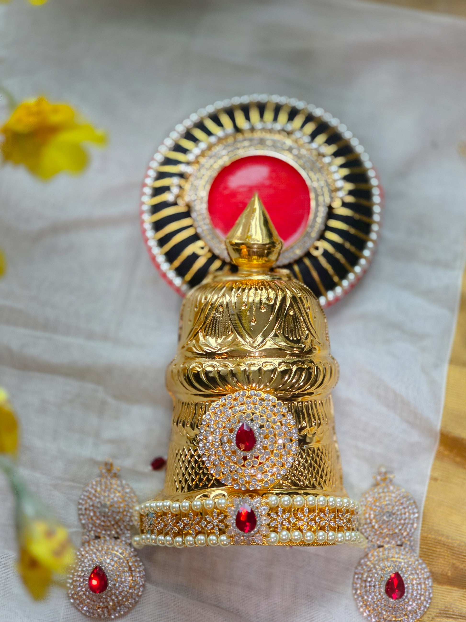 Introducing Ratna Bindu Kiritam, a regal crown that blends the brilliance of gold with the lush green beauty of emeralds. Designed to bring grandeur to your deity alankaram, this handcrafted piece is studded with green marakata stones and gold-finish detailing, symbolizing prosperity, purity, and divine protection. A perfect fit for Ammavaru, Lakshmi, or Balaji alankarams.
