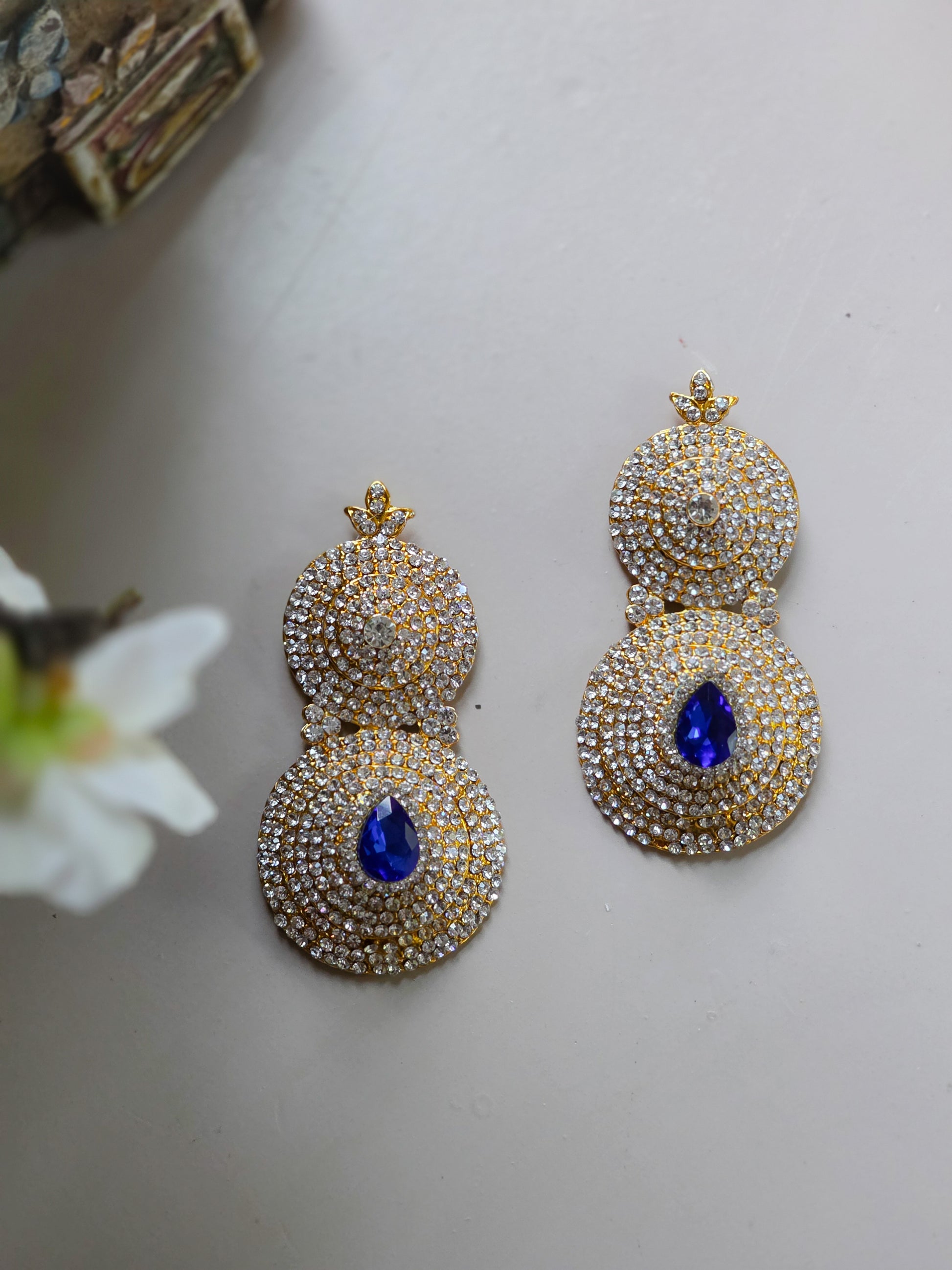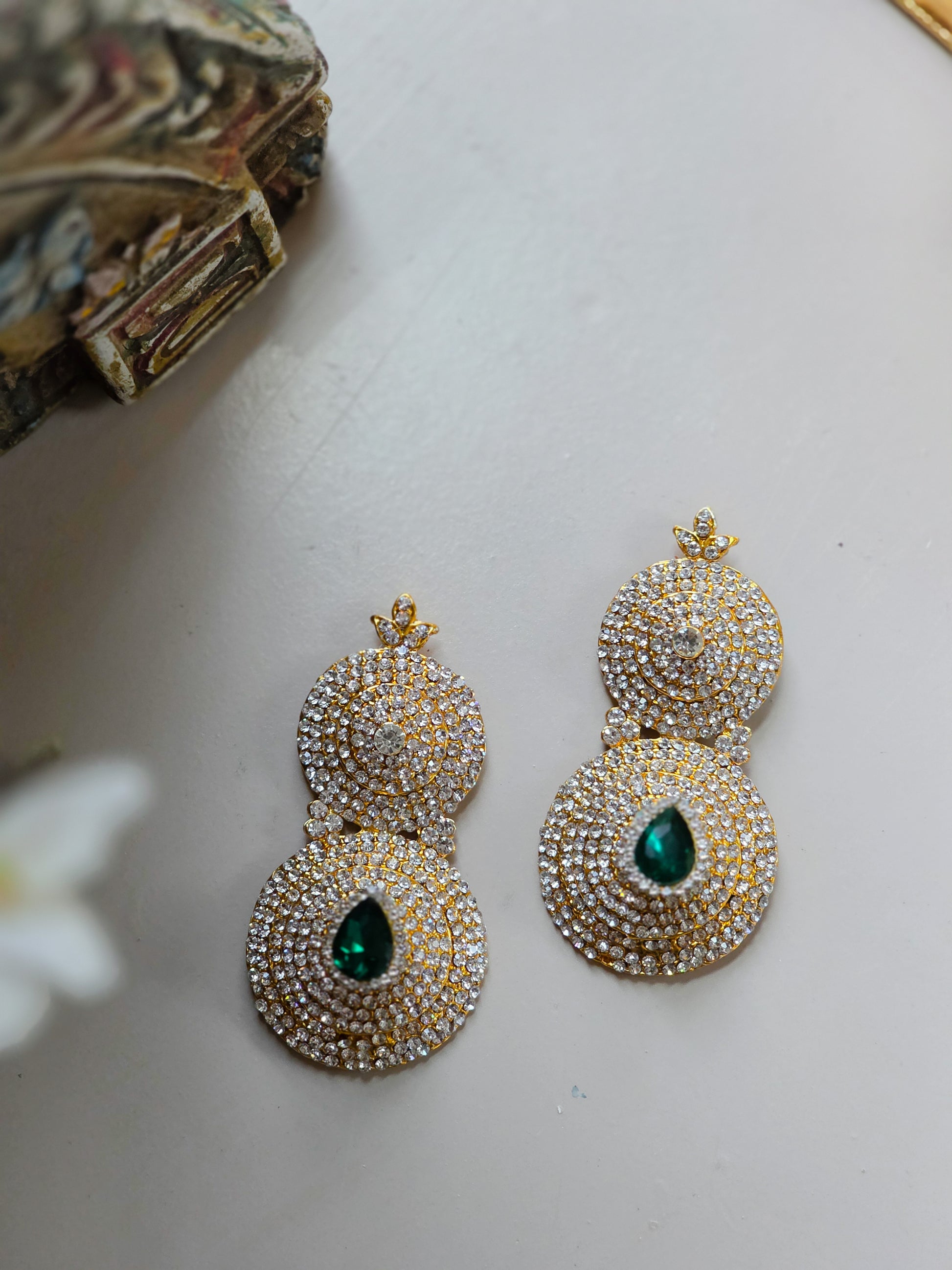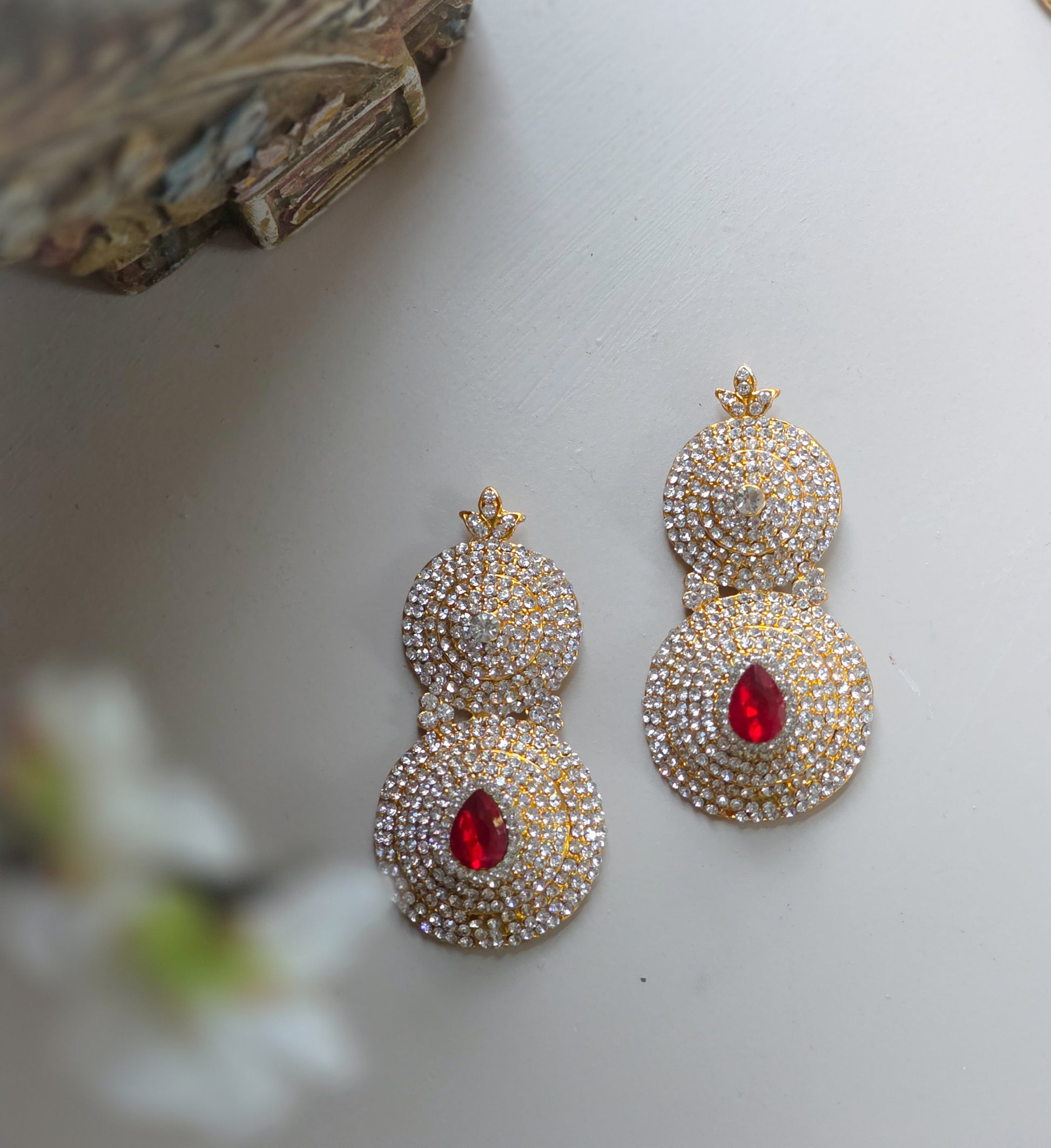Grace your Ammavaru idol with the "Ratna Bindu" collection earrings, personally curated by Divya herself.. Designed to add a divine touch, these earrings feature intricate detailing and a classic circular shape that complements any alankaram. Whether for daily pooja or festive adornment, these earrings bring timeless elegance to your sacred space.