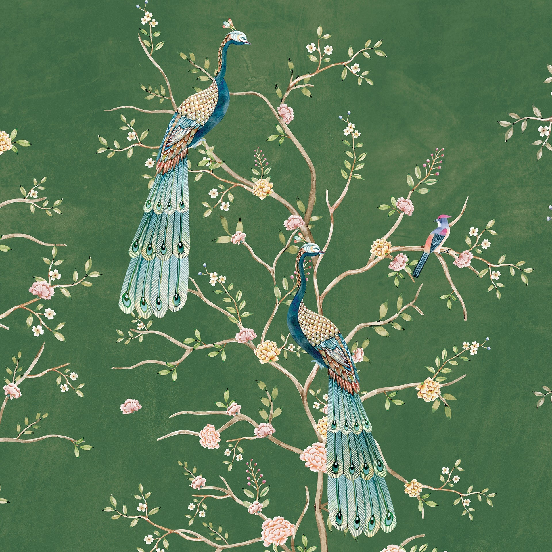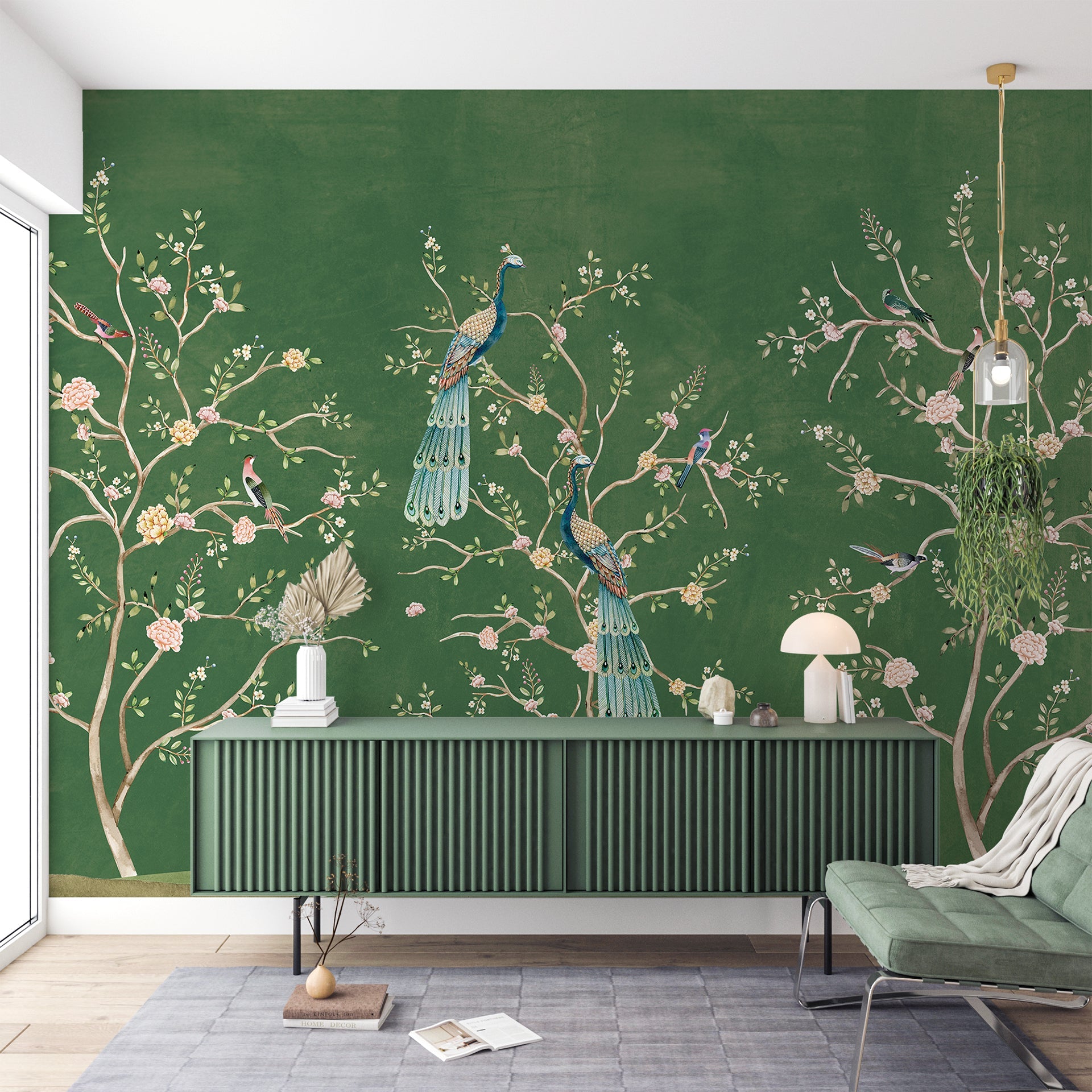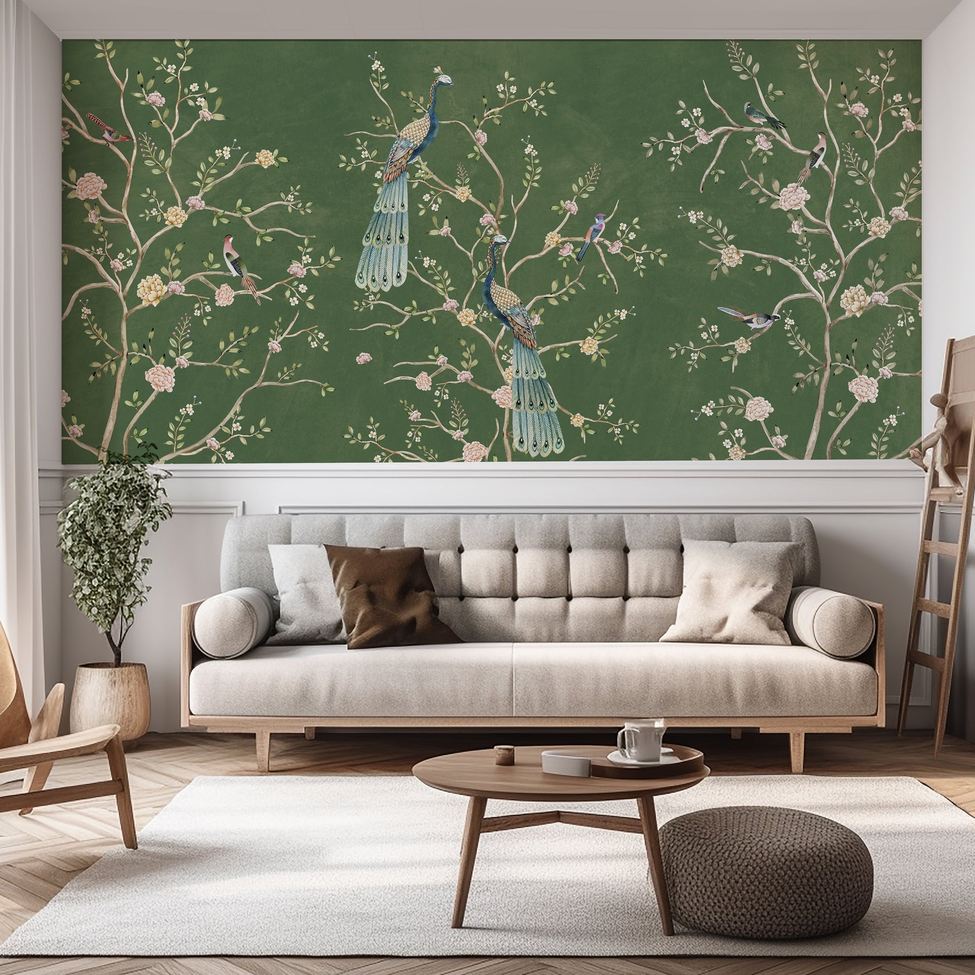 Dark Chinoiserie floral wallpaper featuring elegant peacock motifs. Perfect for accent walls or statement rooms, this wallpaper blends botanical luxury with traditional Asian art. Ideal for living rooms, bedrooms, or dining areas seeking a dramatic, nature-inspired aesthetic.