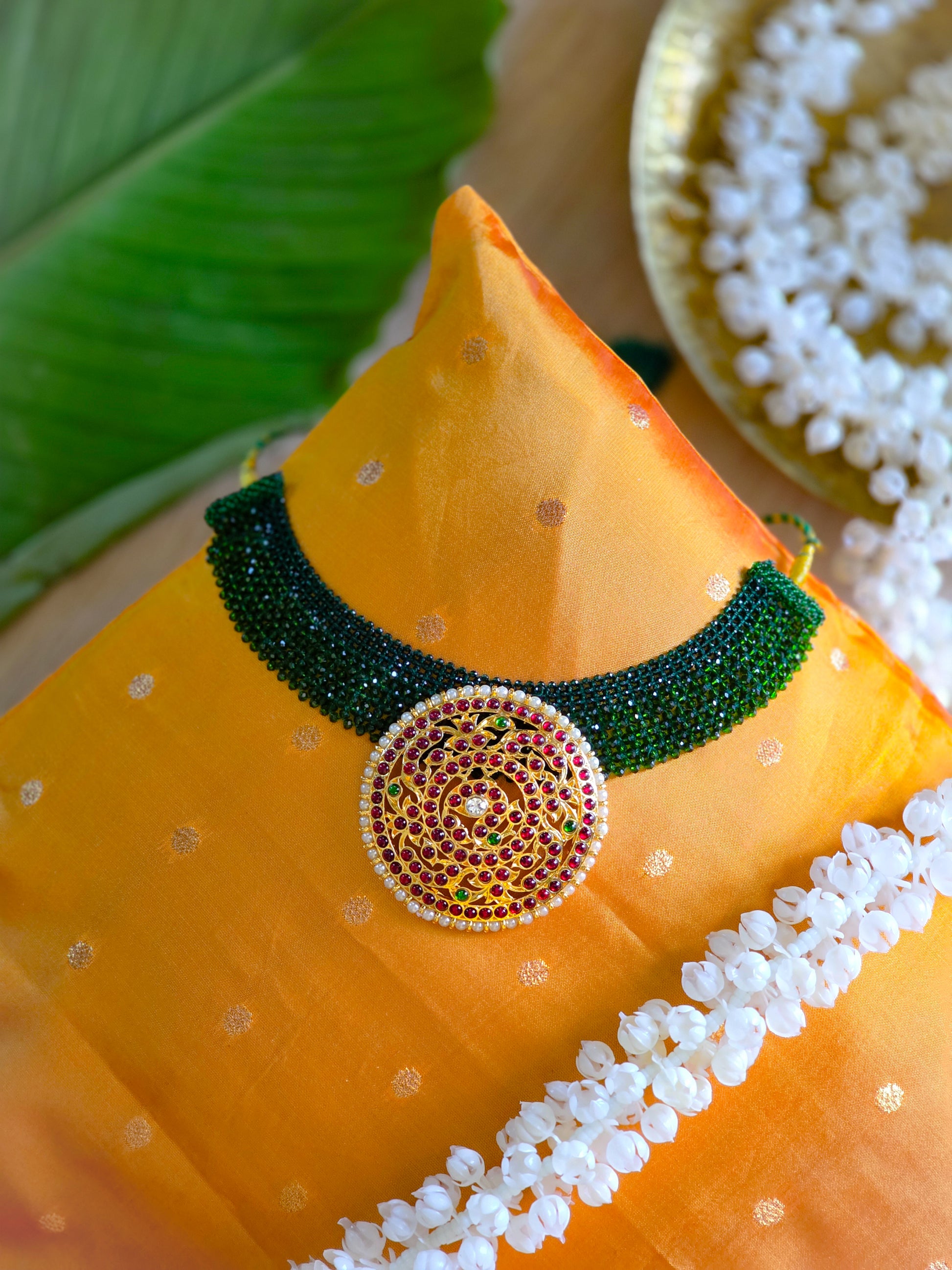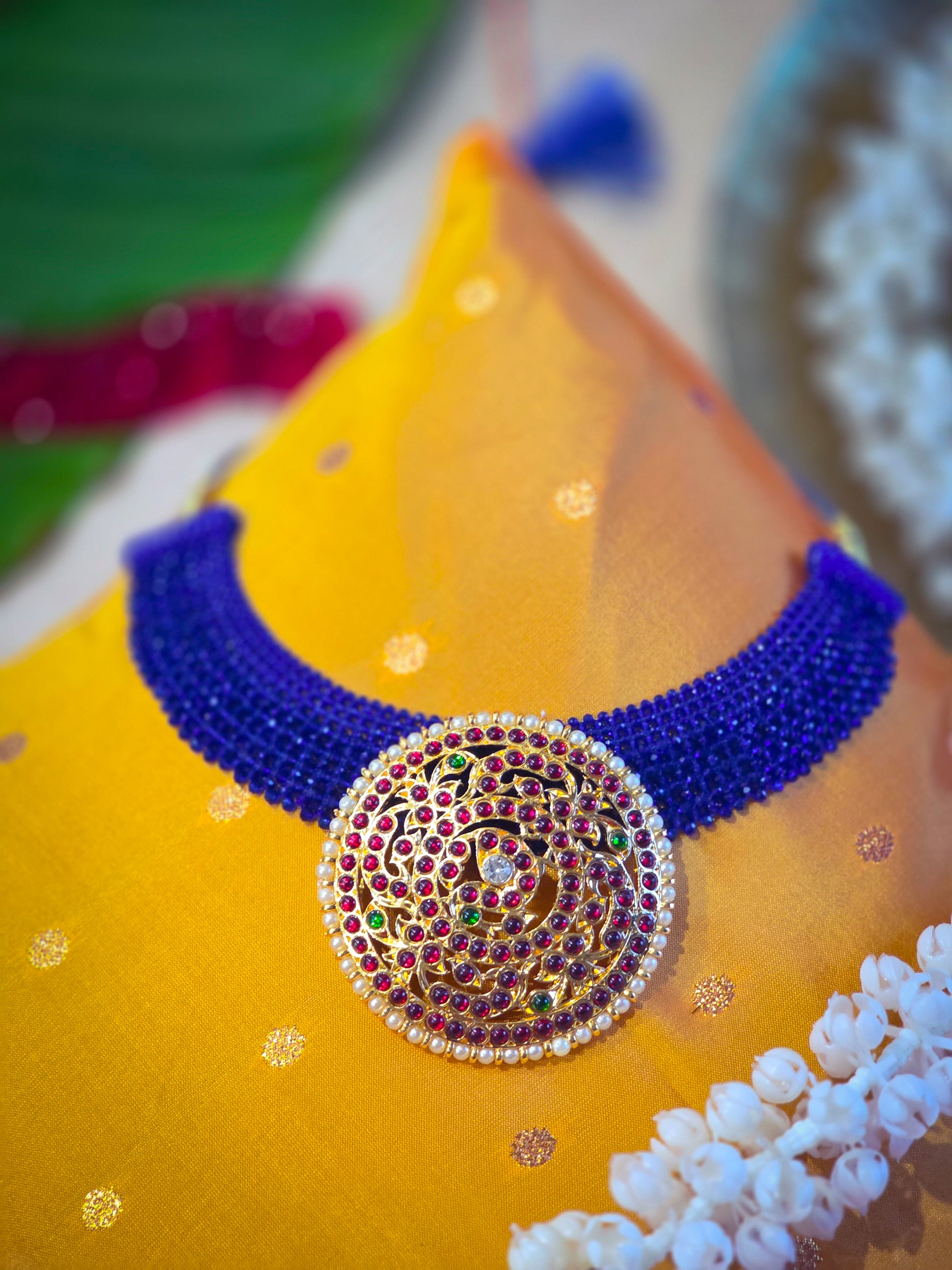 Elevate your pooja space or deity idol with the timeless elegance of Jadau Pathakam, a handcrafted pendant designed for divine adornment. Featuring eight lustrous, deep blue stones arranged in a floral cross pattern, each gem is bordered with shimmering CZ diamonds set in gold-finish alloy. This pendant is perfect for traditional use on deity idols during festivals, daily worship, or as a sacred gift for loved ones.