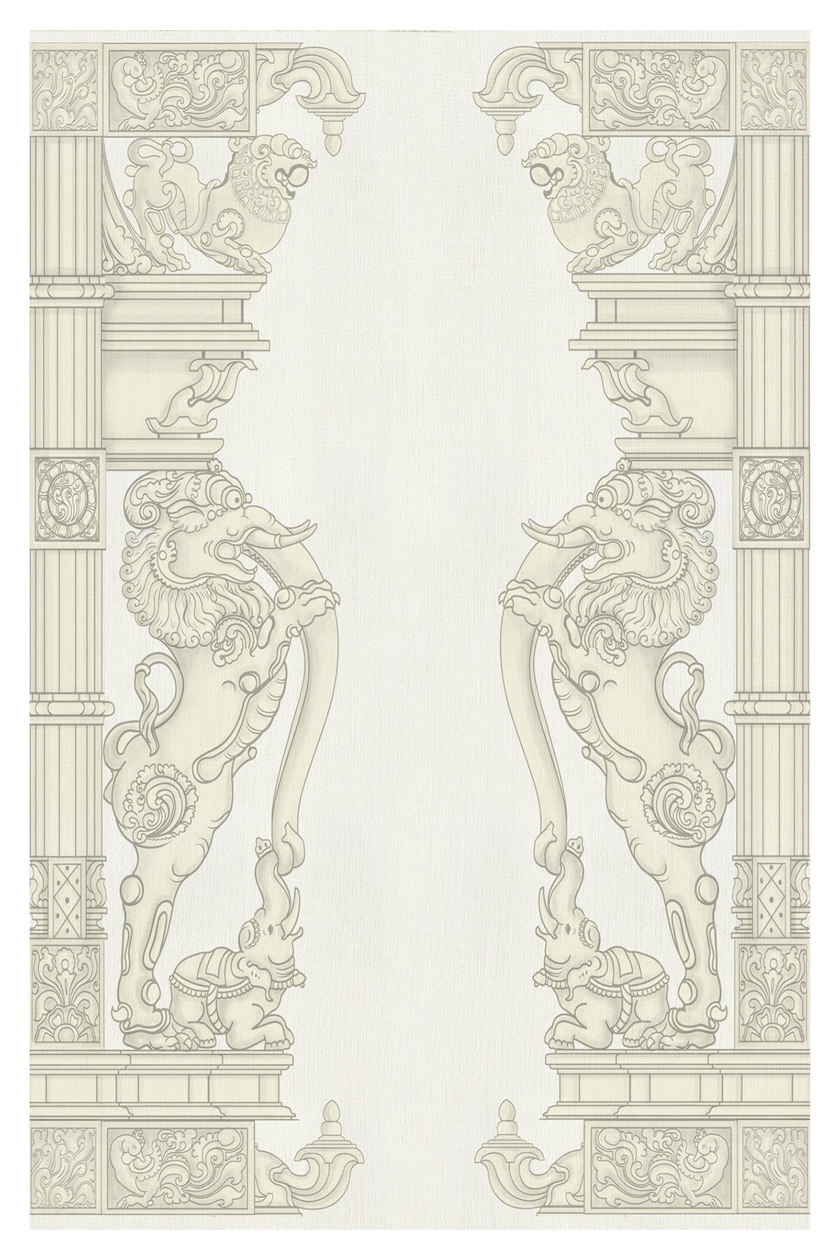 This wallpaper brings to life the legendary Yali, the mythical guardian of South Indian temple architecture, poised with majestic force above the steadfast elephant. Framed by ornate pillars and intricate scrolls, the design echoes centuries of sacred craftsmanship where these creatures stood as protectors of thresholds and shrines. Rendered in fine linework on a muted neutral base, the composition balances power with elegance — making it equally suited to traditional settings and modern interiors. Strong yet refined, it turns walls into symbols of guardianship, artistry, and timeless symmetry.