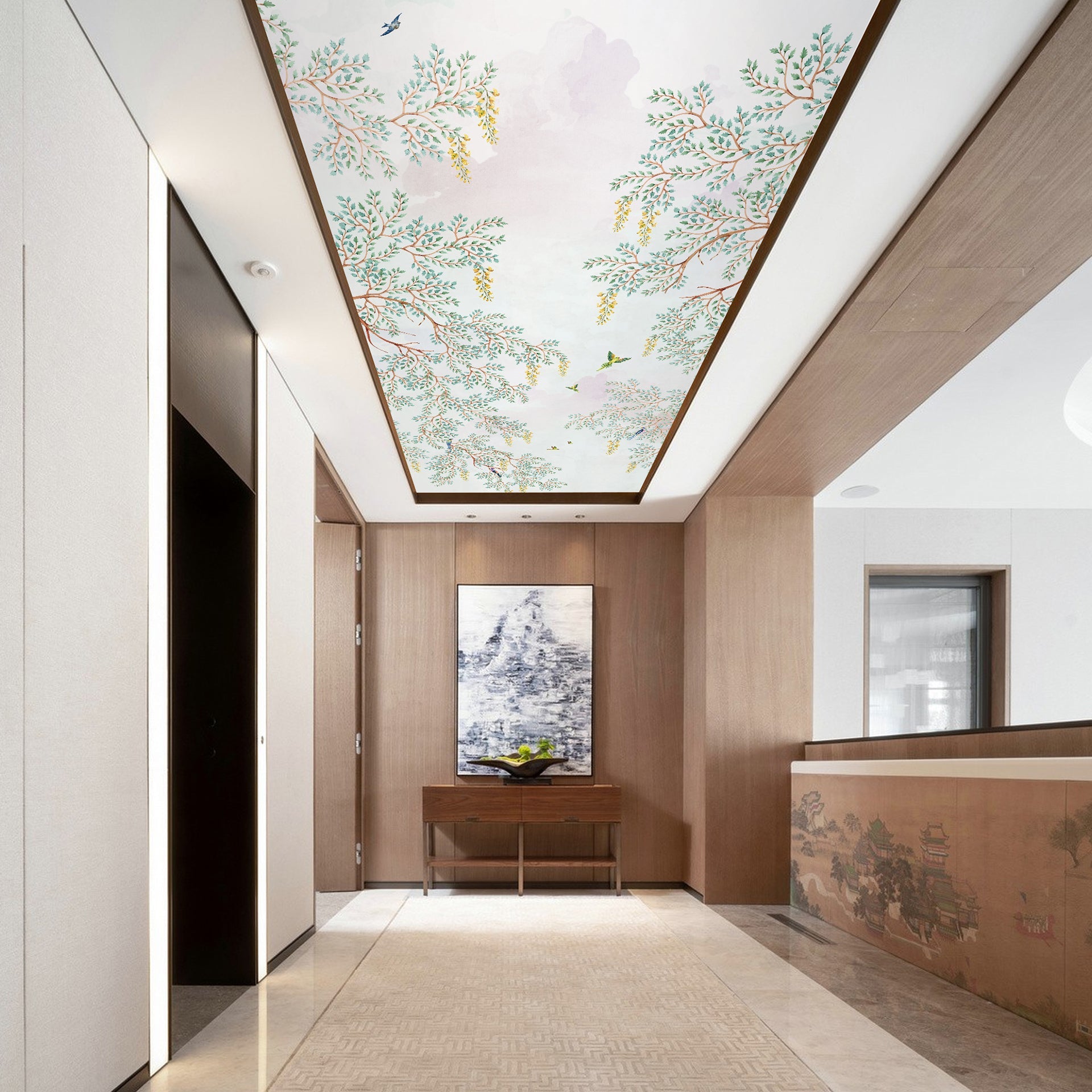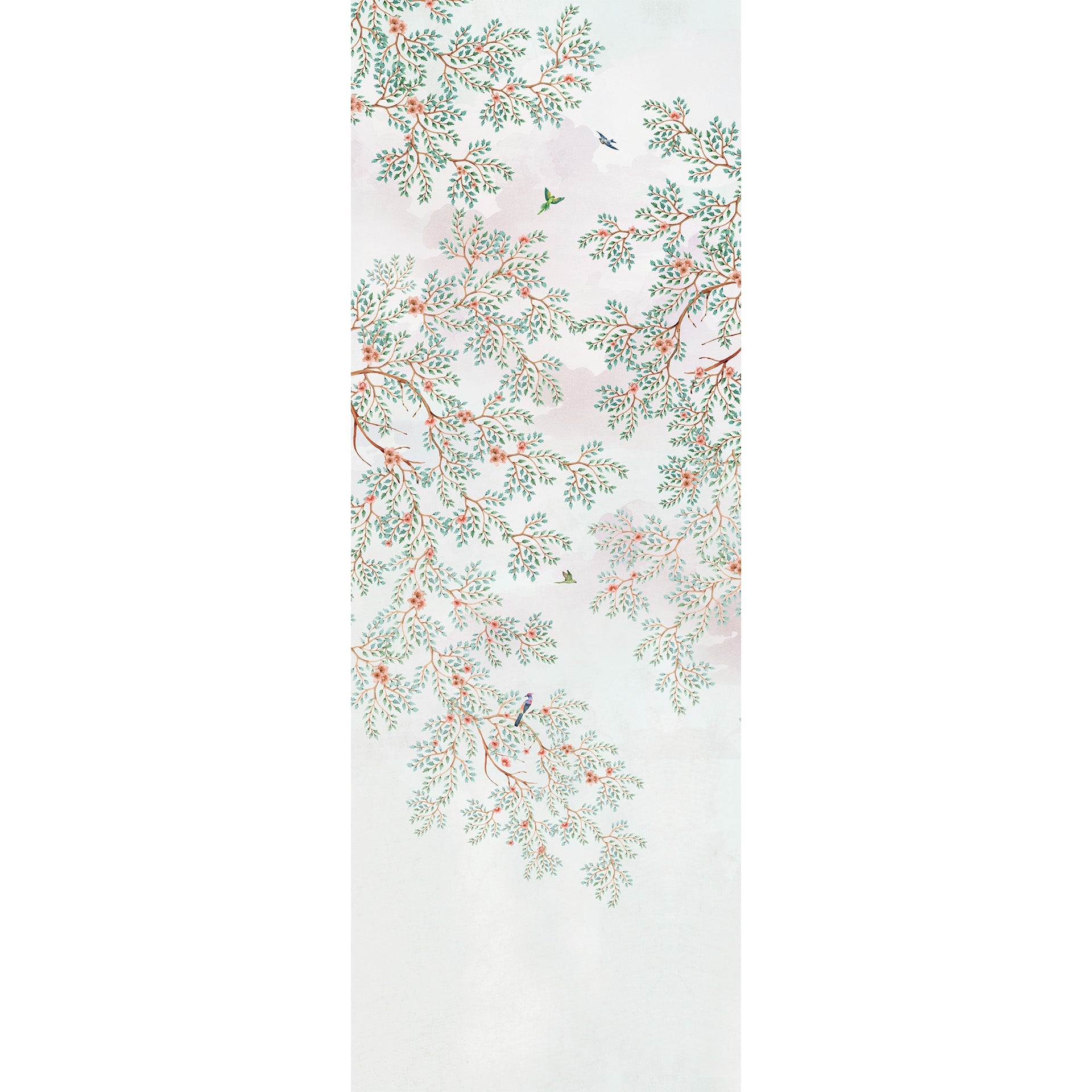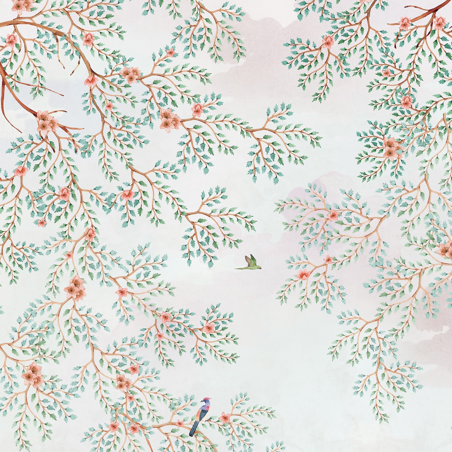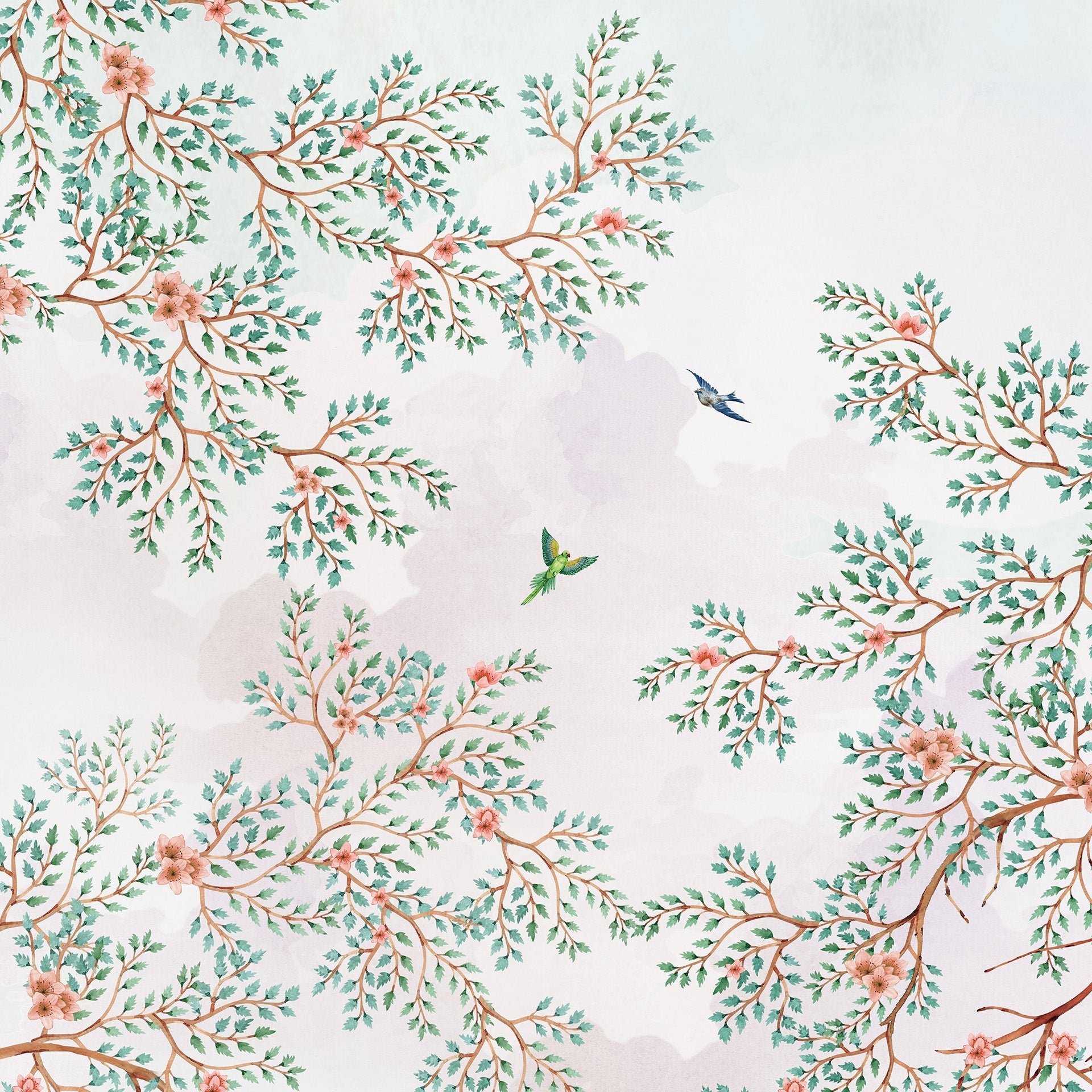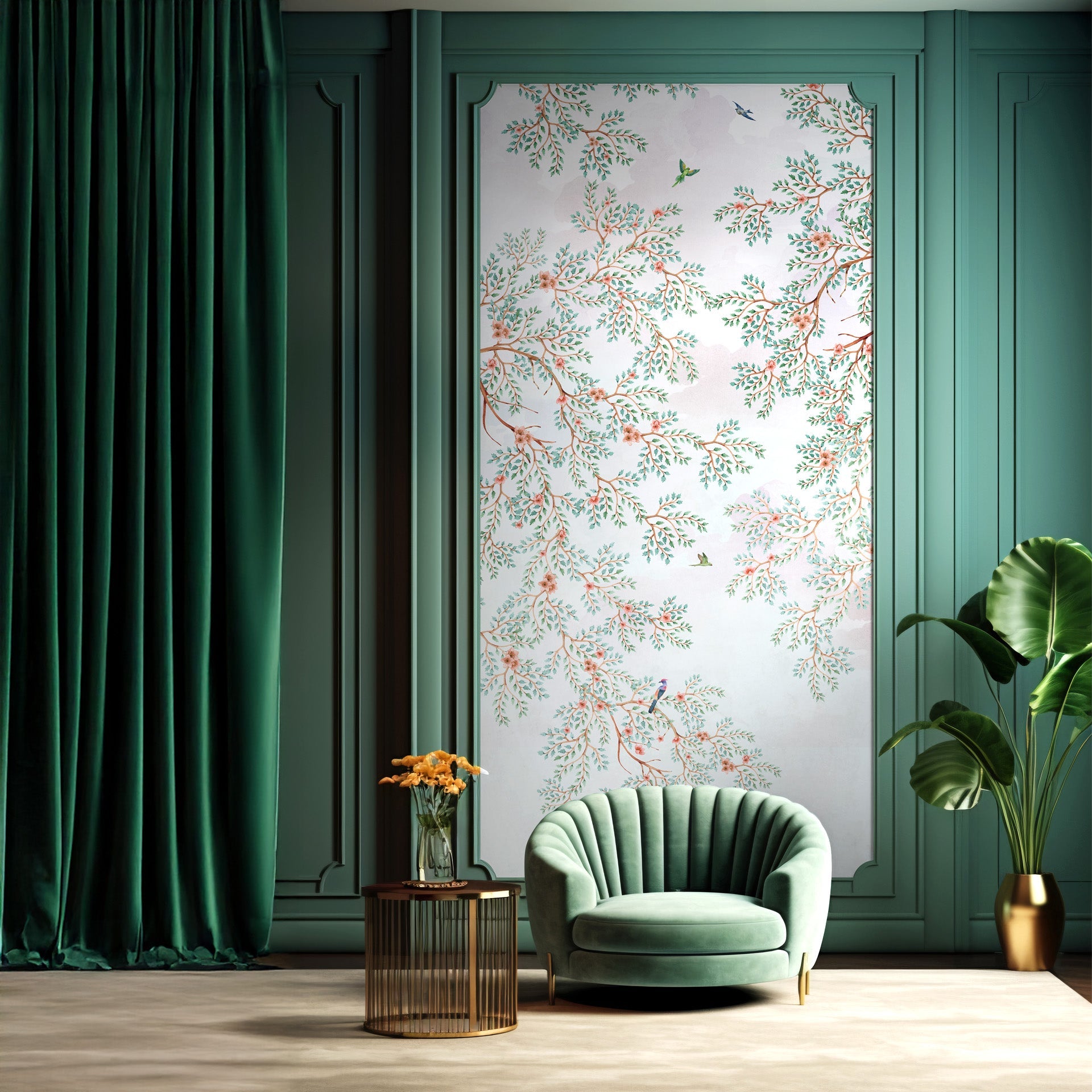 Chinoiseries flower wallpaper with birds in pastel tones, ideal for living room, dinning area, bedroom.