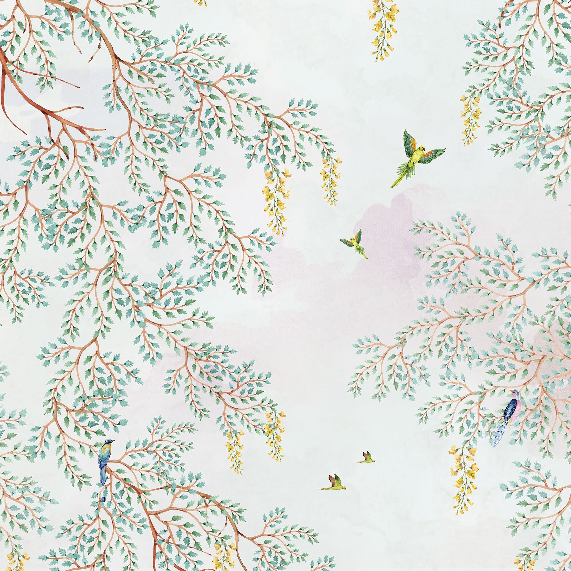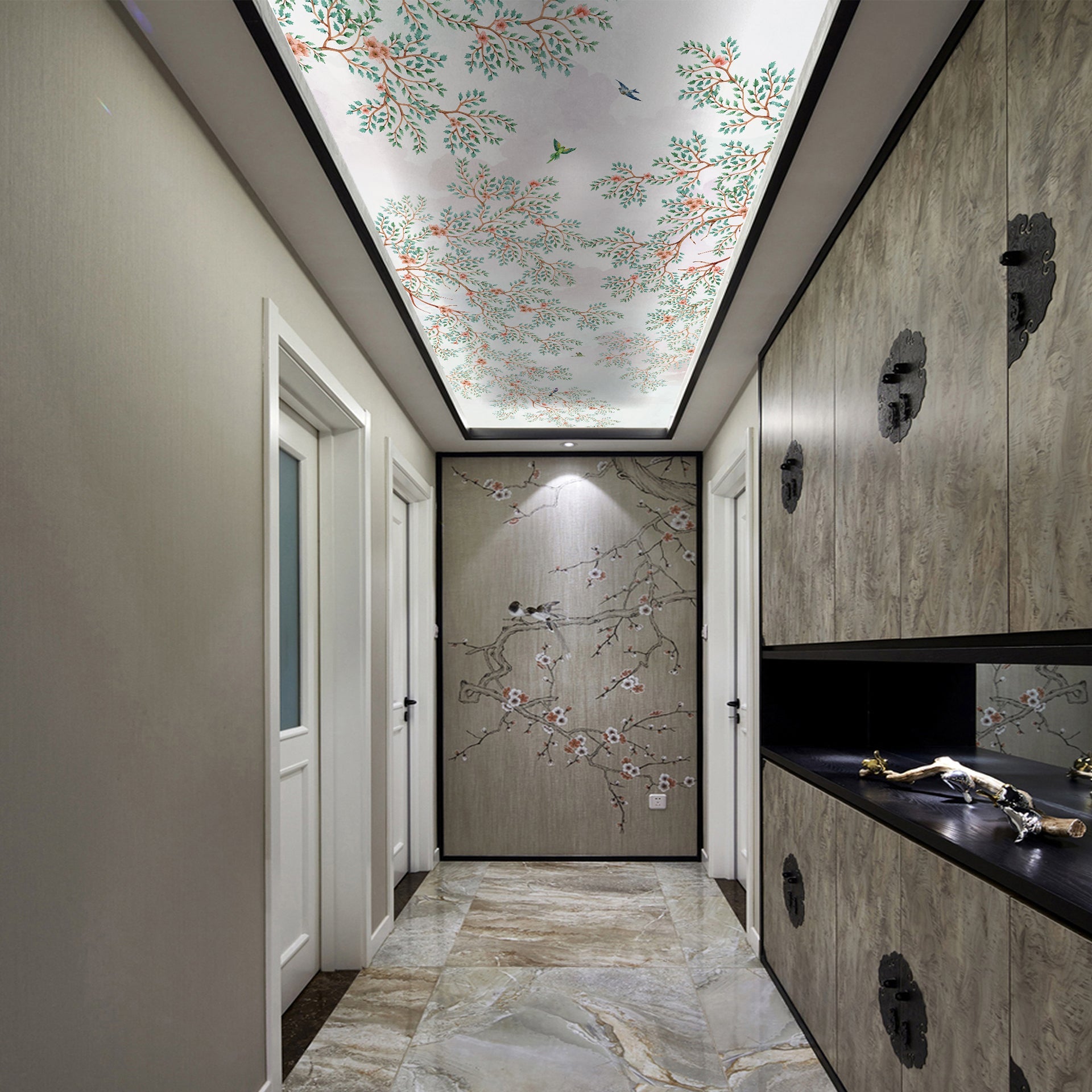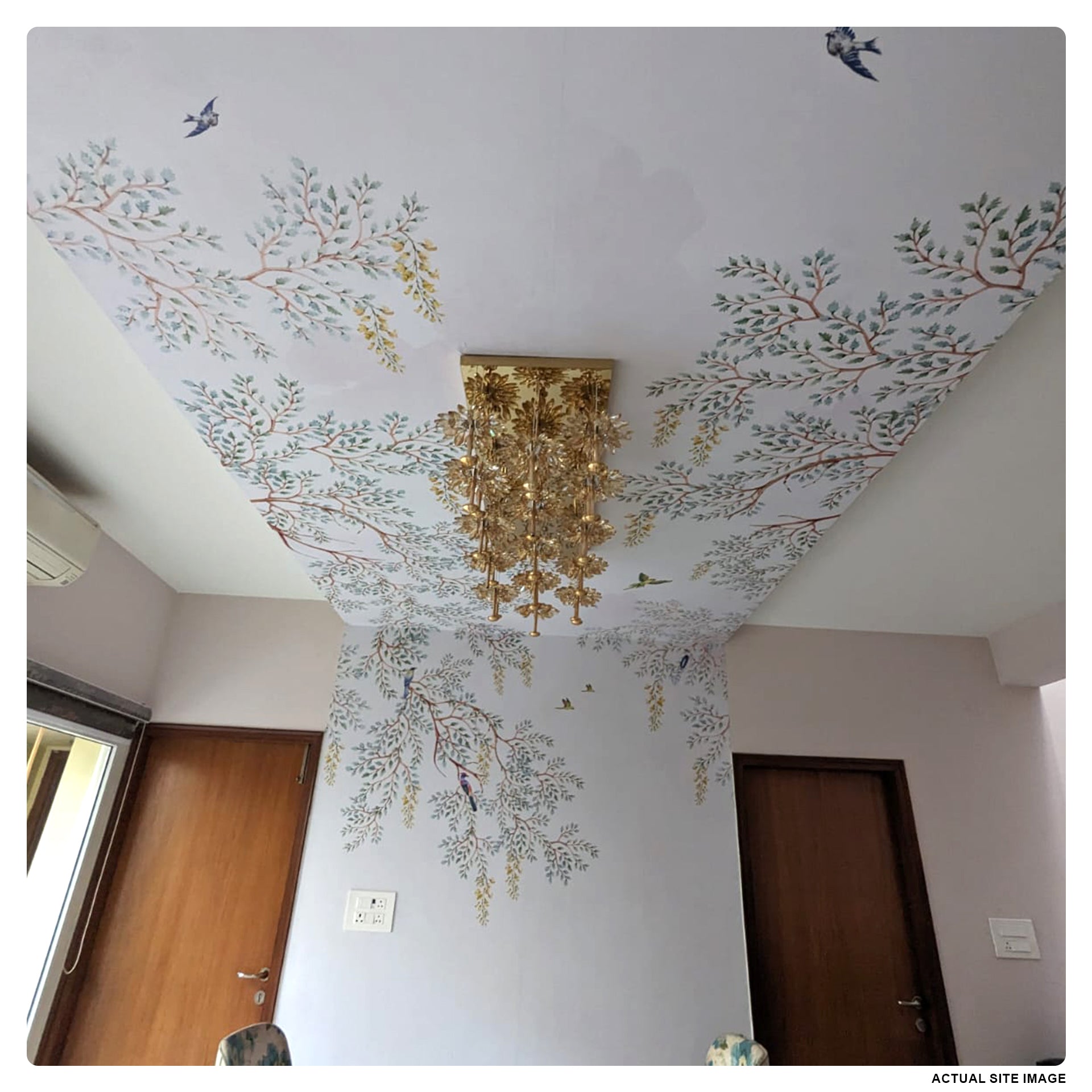 Chinoiseries ceiling wallpaper in pastel tones for living room, dining area, bedroom, showrooms, foyer.