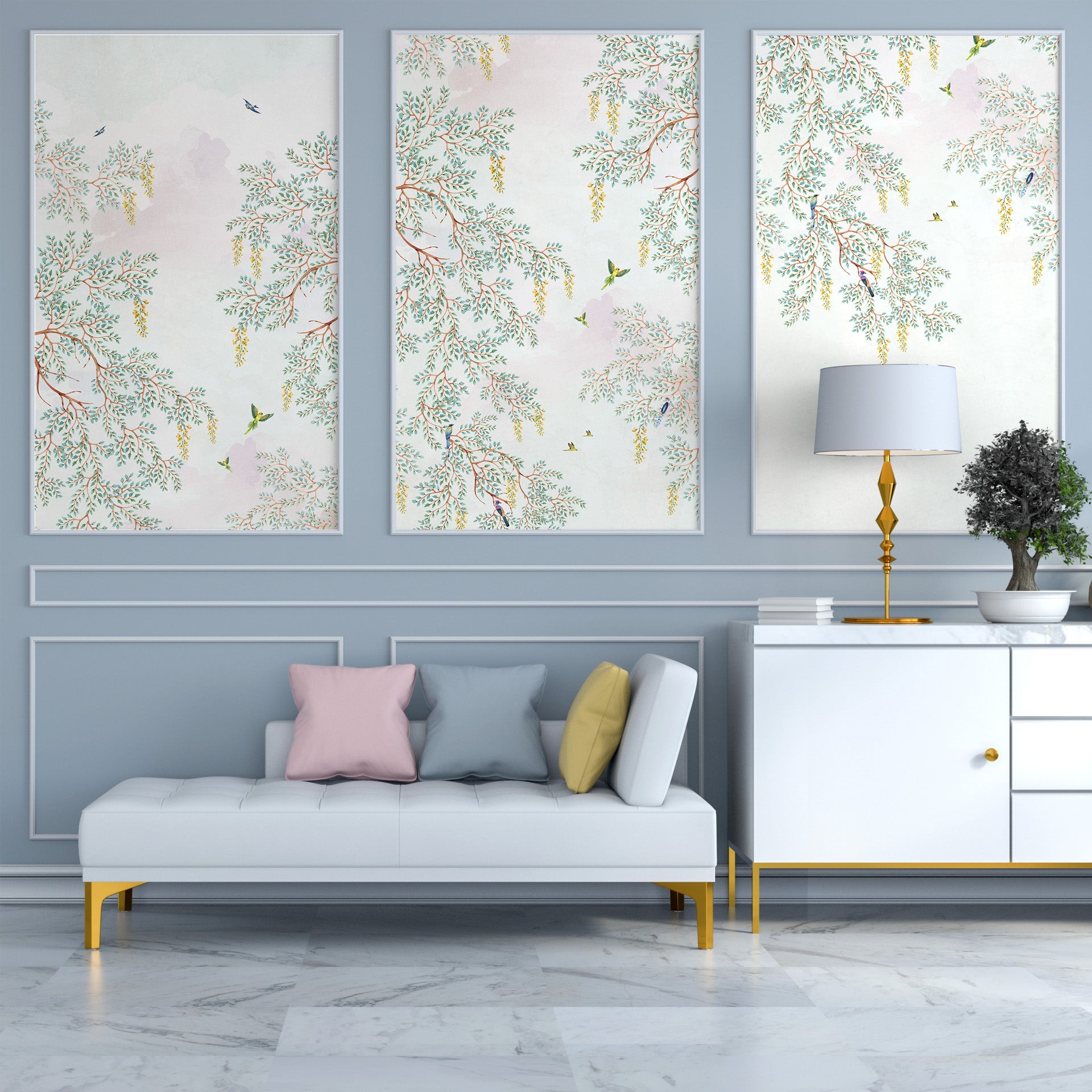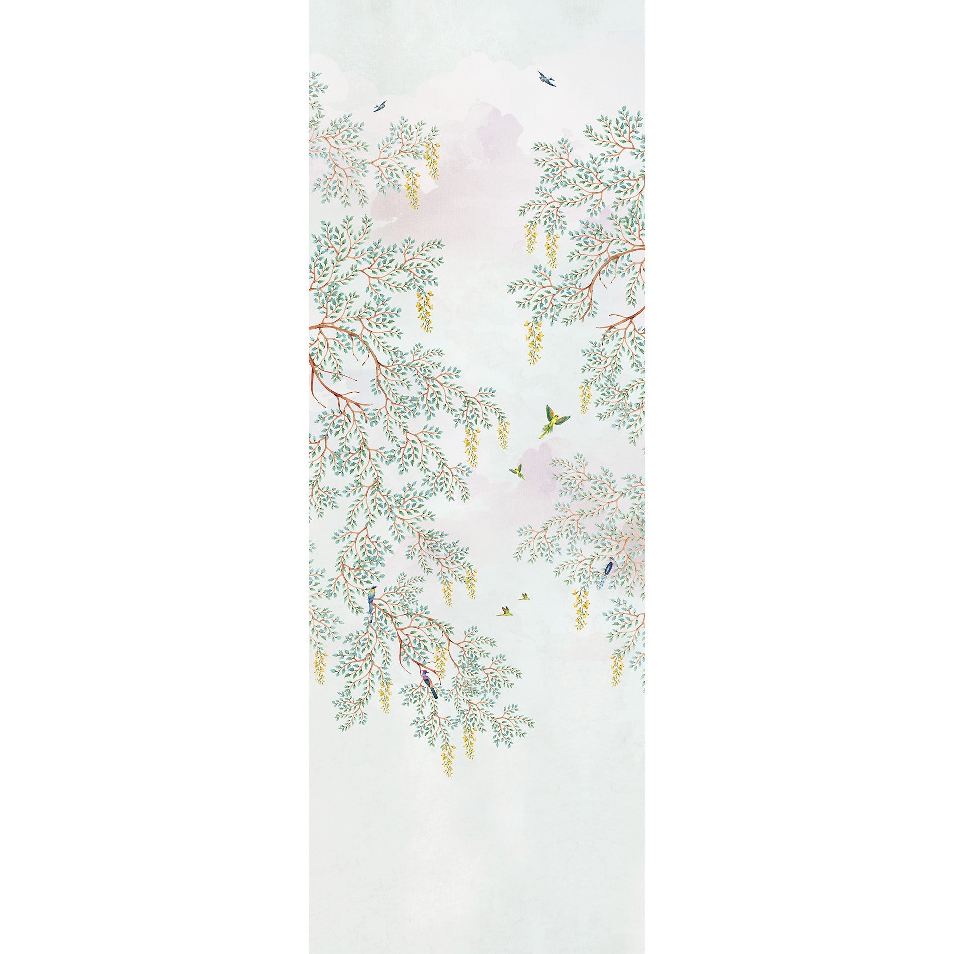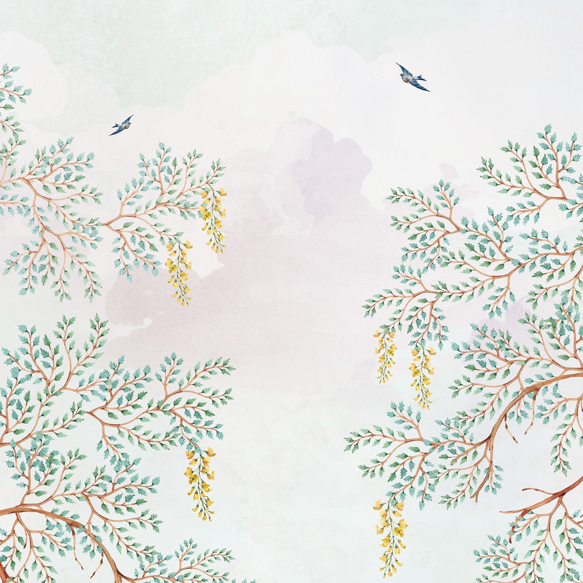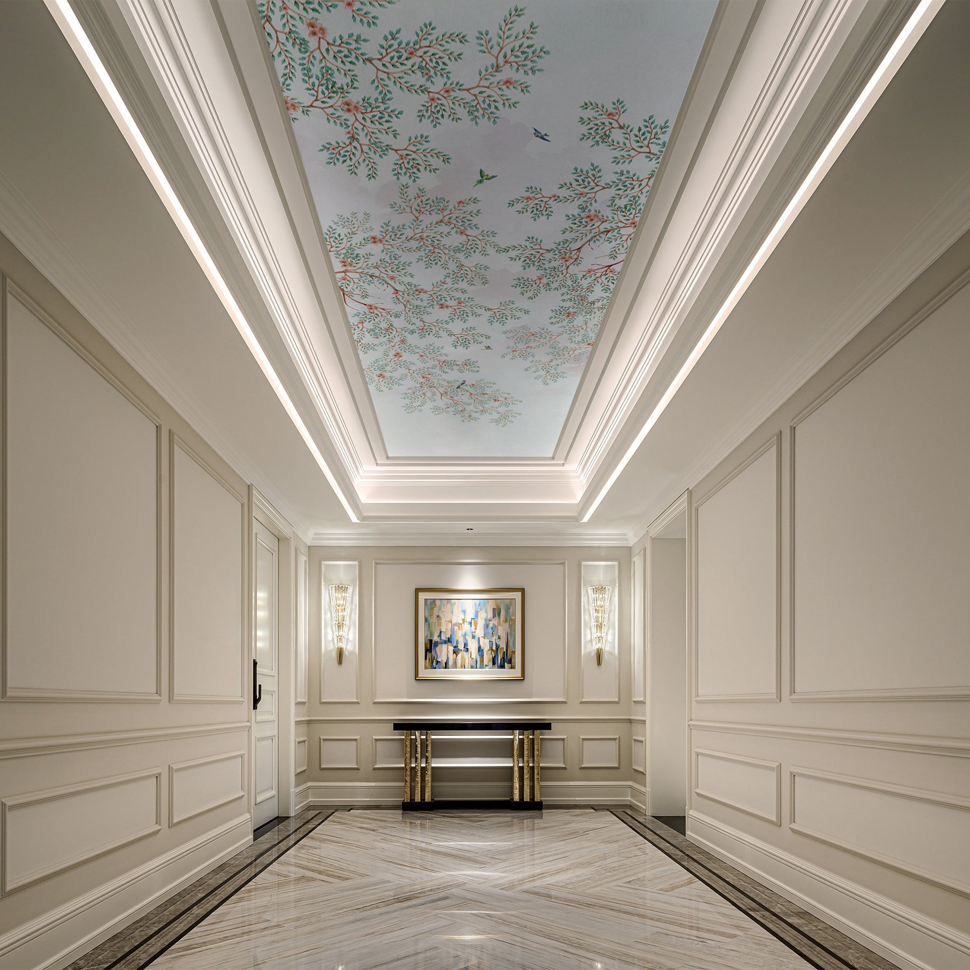 Chinoiseries ceiling wallpaper in pastel tones for living room, dining area, bedroom, showrooms, foyer.