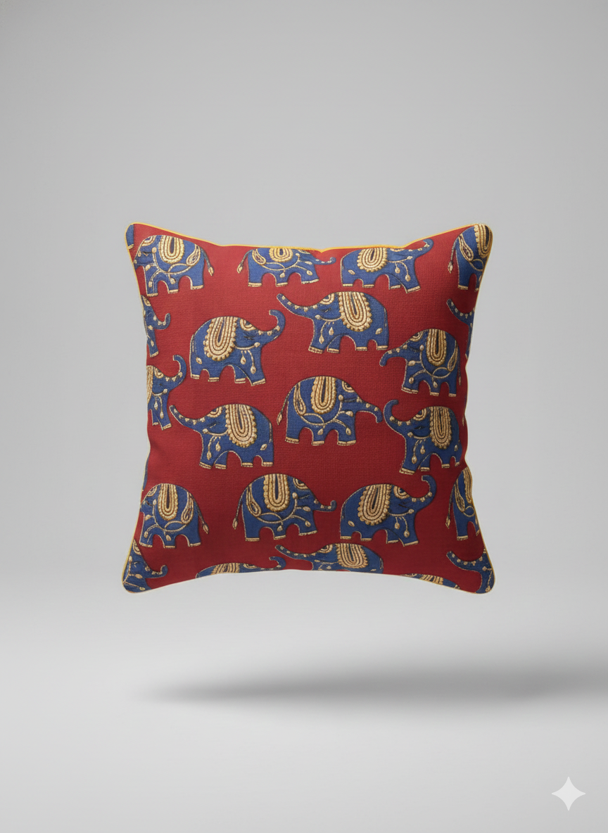 Bringing together the warmth of tradition and the clarity of modern design, this cushion cover celebrates the timeless charm of Indian elephant motifs. Set against a deep maroon backdrop, the blue and gold elephants add a rich cultural flair while still feeling fresh and contemporary. The pattern carries a festive vibrance, making the piece a statement accent for homes that love both color and heritage.