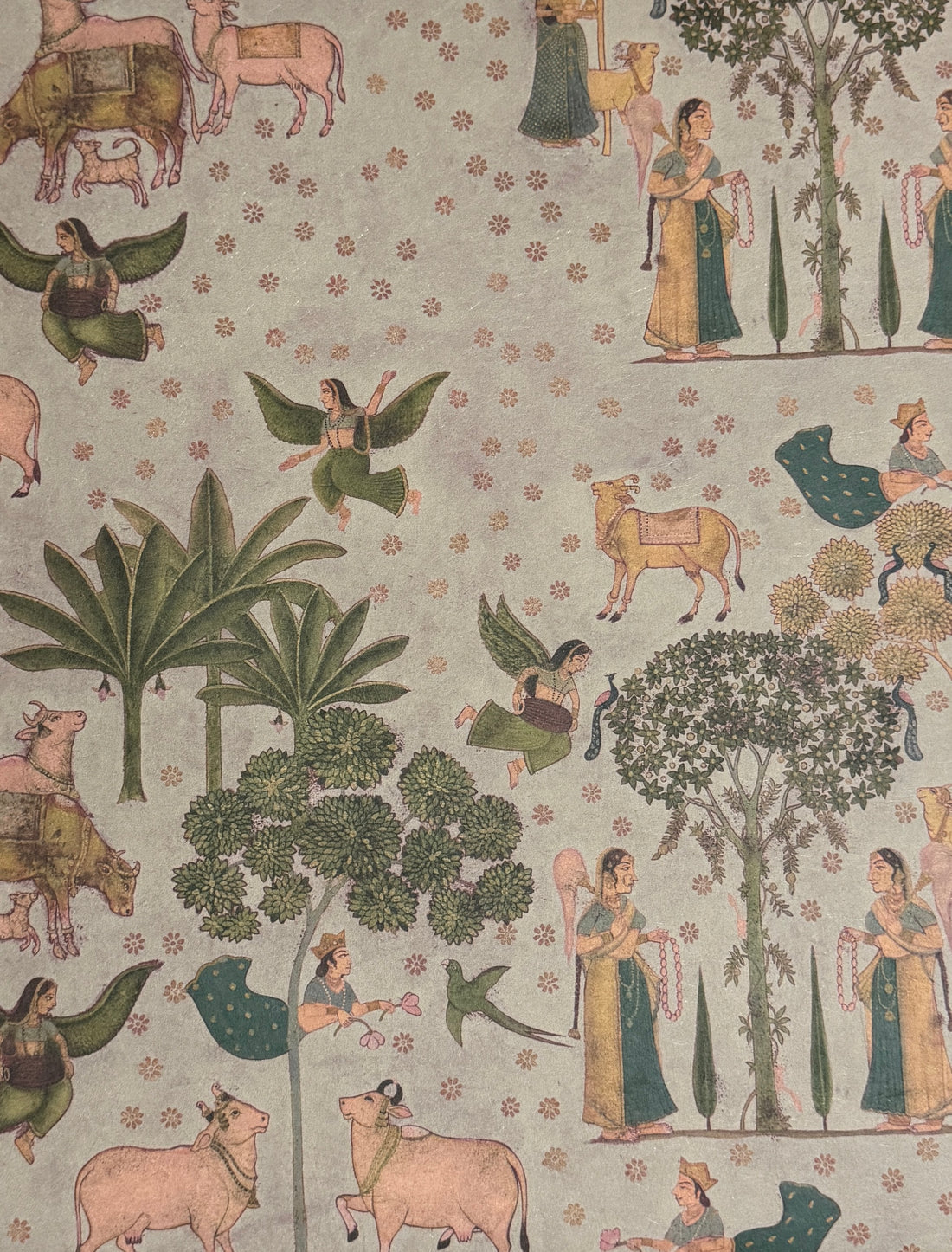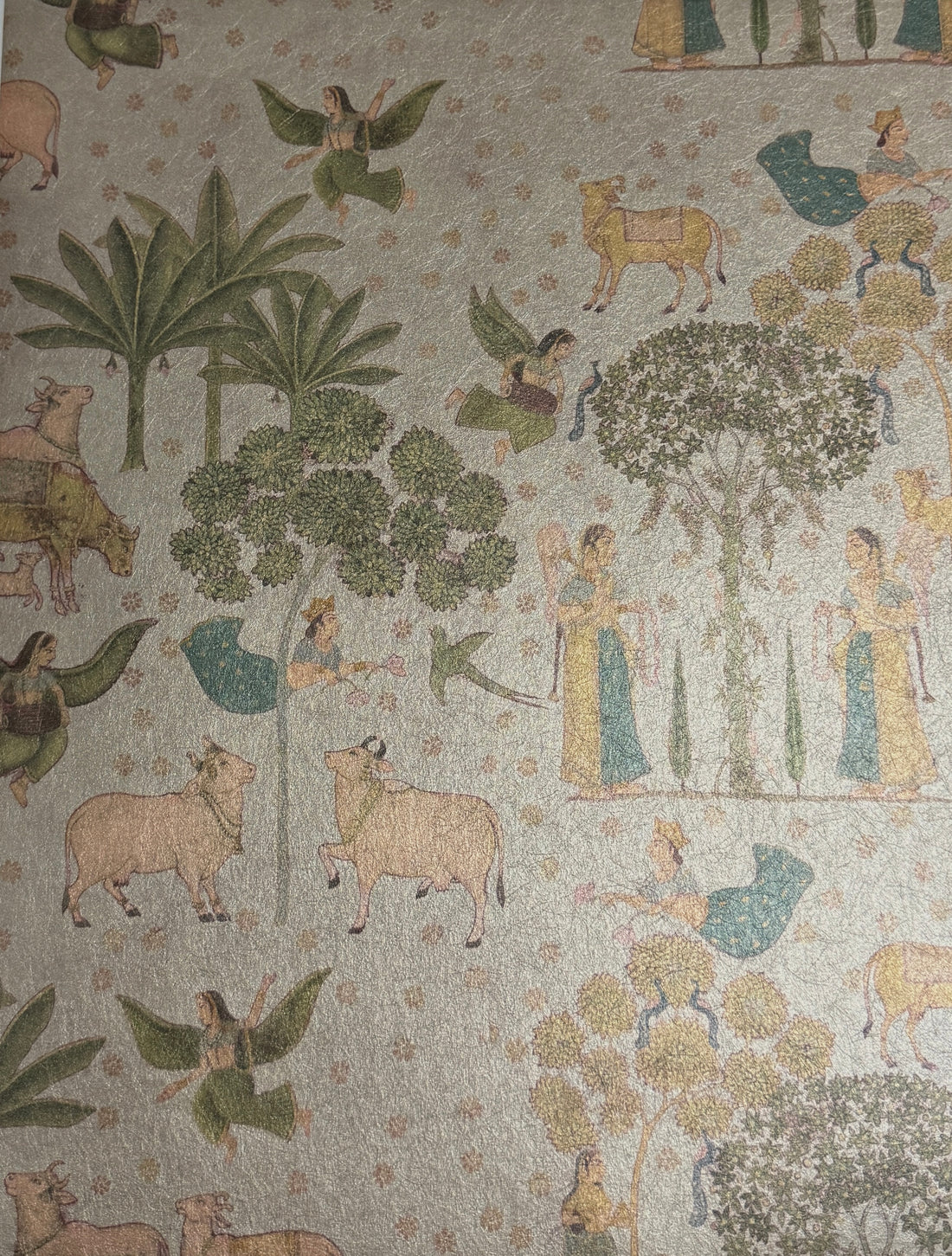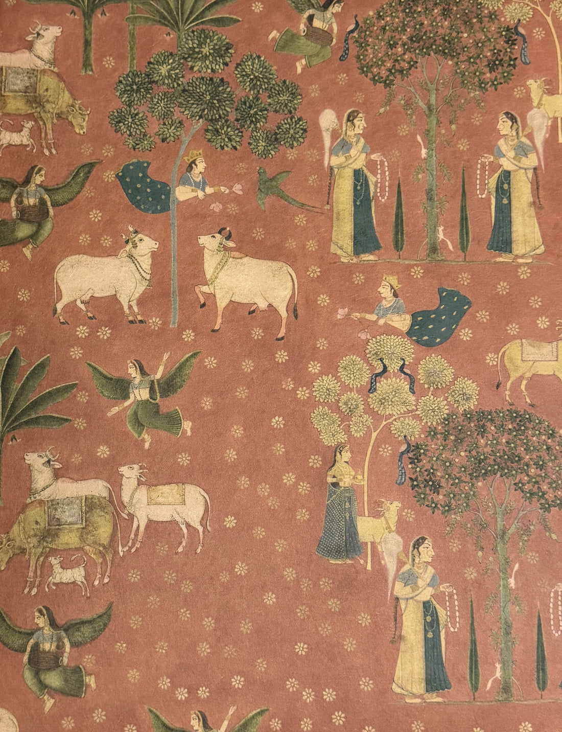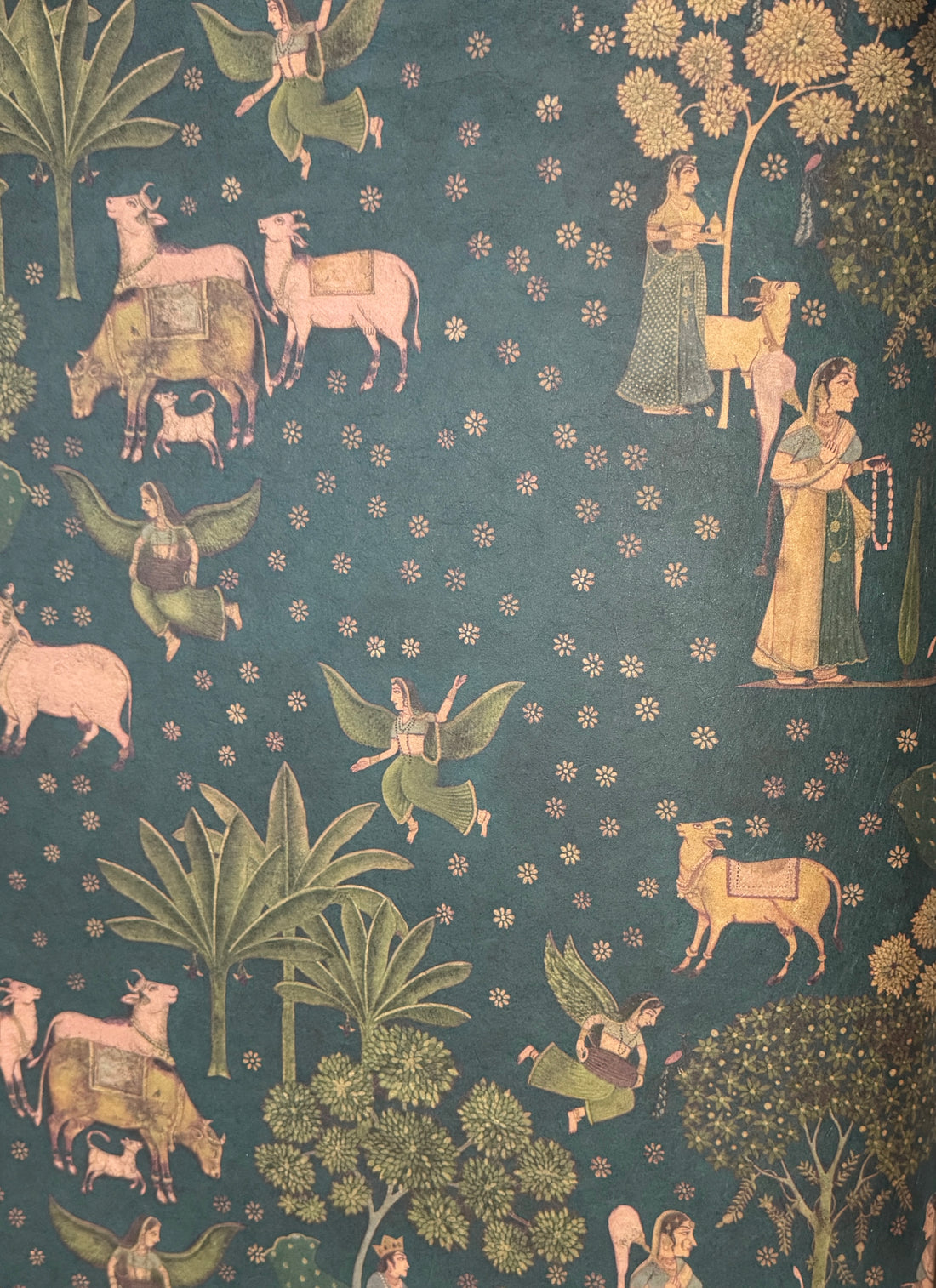 Try pairing the Gokul Pichwai print with rich emerald green walls to highlight its springtime tones. Add vintage pieces and soft, oversized furniture for a space that feels layered, cozy, and full of character. It’s a beautiful way to bring new life into your home while keeping it timeless and personal.