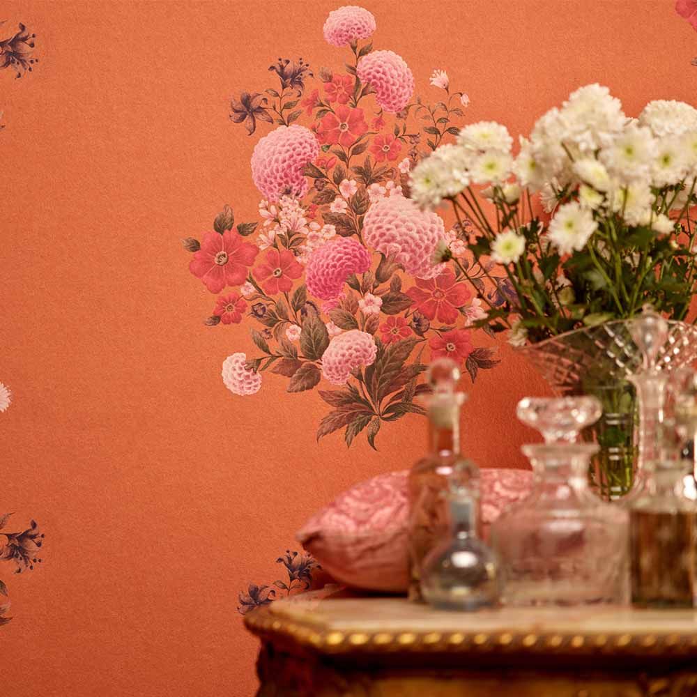 A poetic bloom unfolds across the walls with Guldasta, a wallpaper that captures the timeless elegance of Indian florals. Lush clusters of dahlias and petunias bloom in shades of pink and coral, set against a rich terracotta backdrop. Inspired by hand-painted botanical art, this design brings a delicate yet vivid presence to any space. Romantic, regal, and rooted in tradition, Guldasta is a celebration of abundance, artistry, and nostalgia.