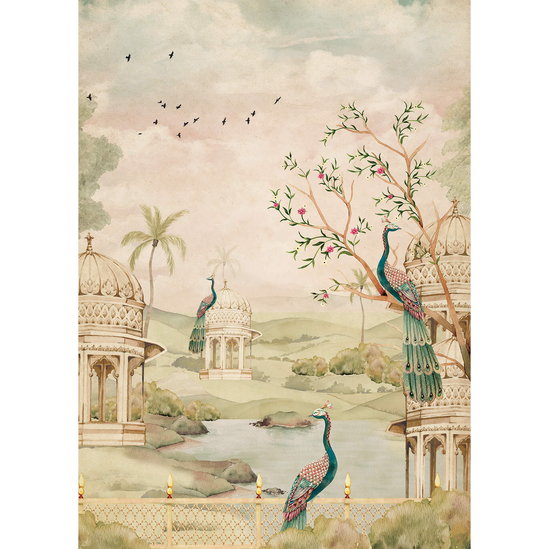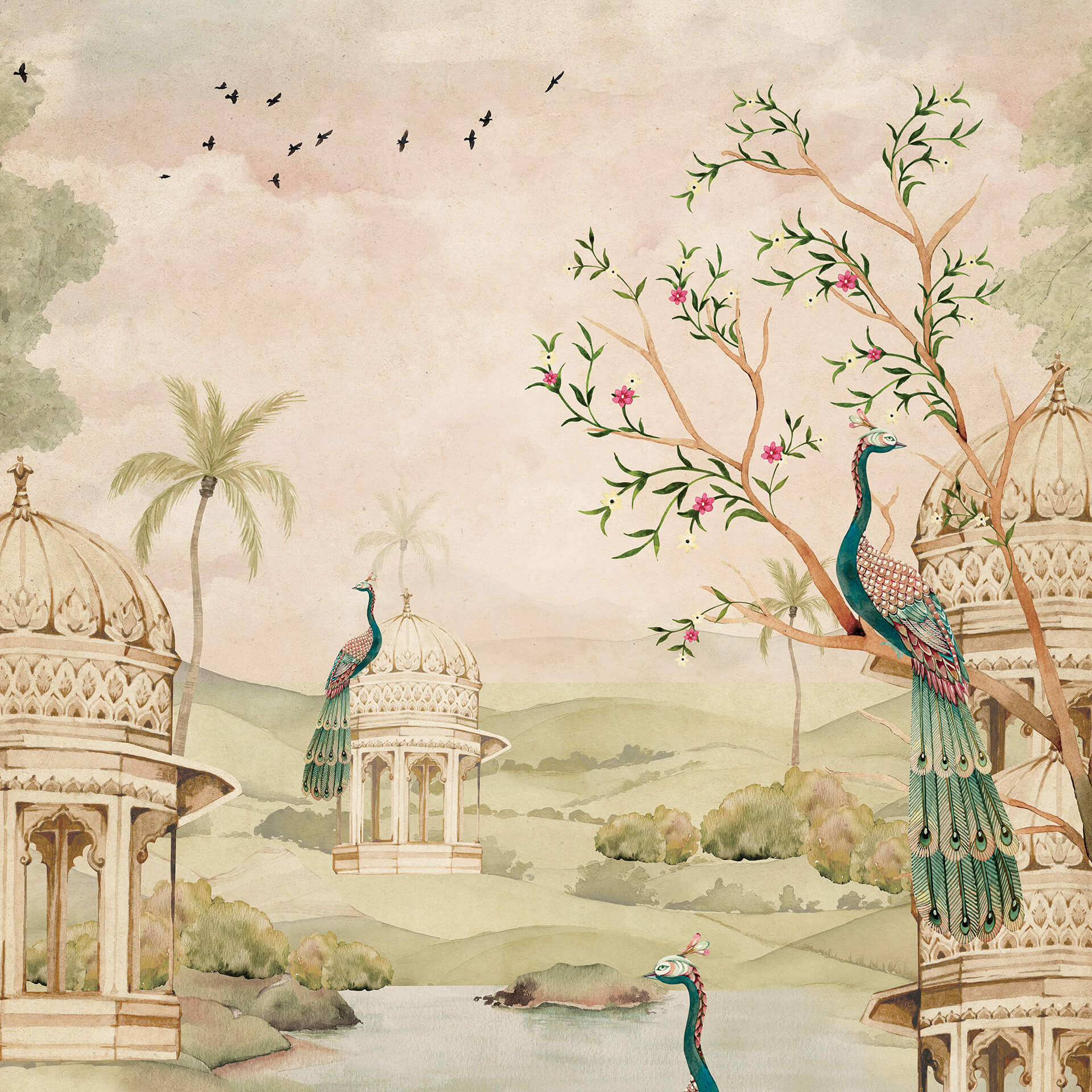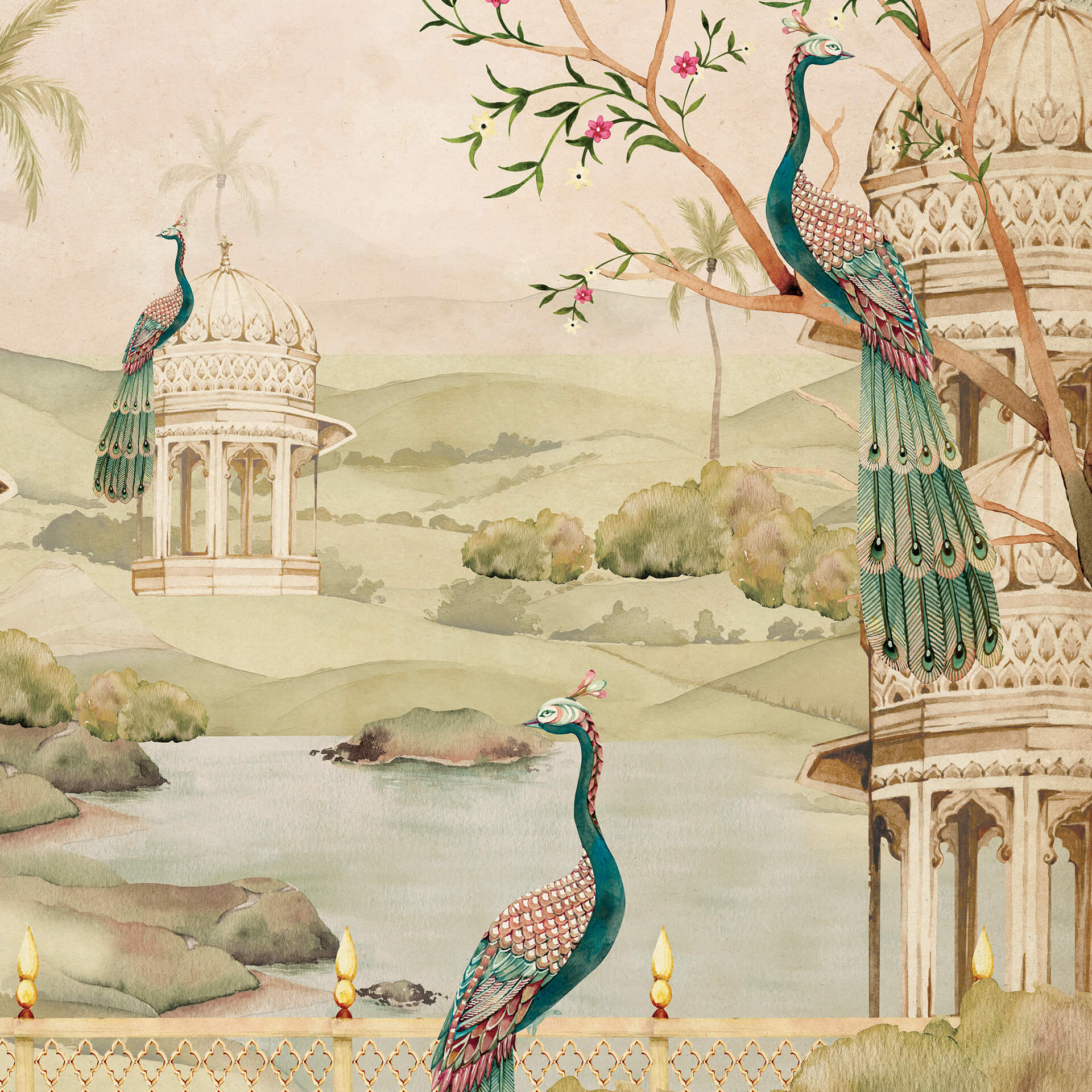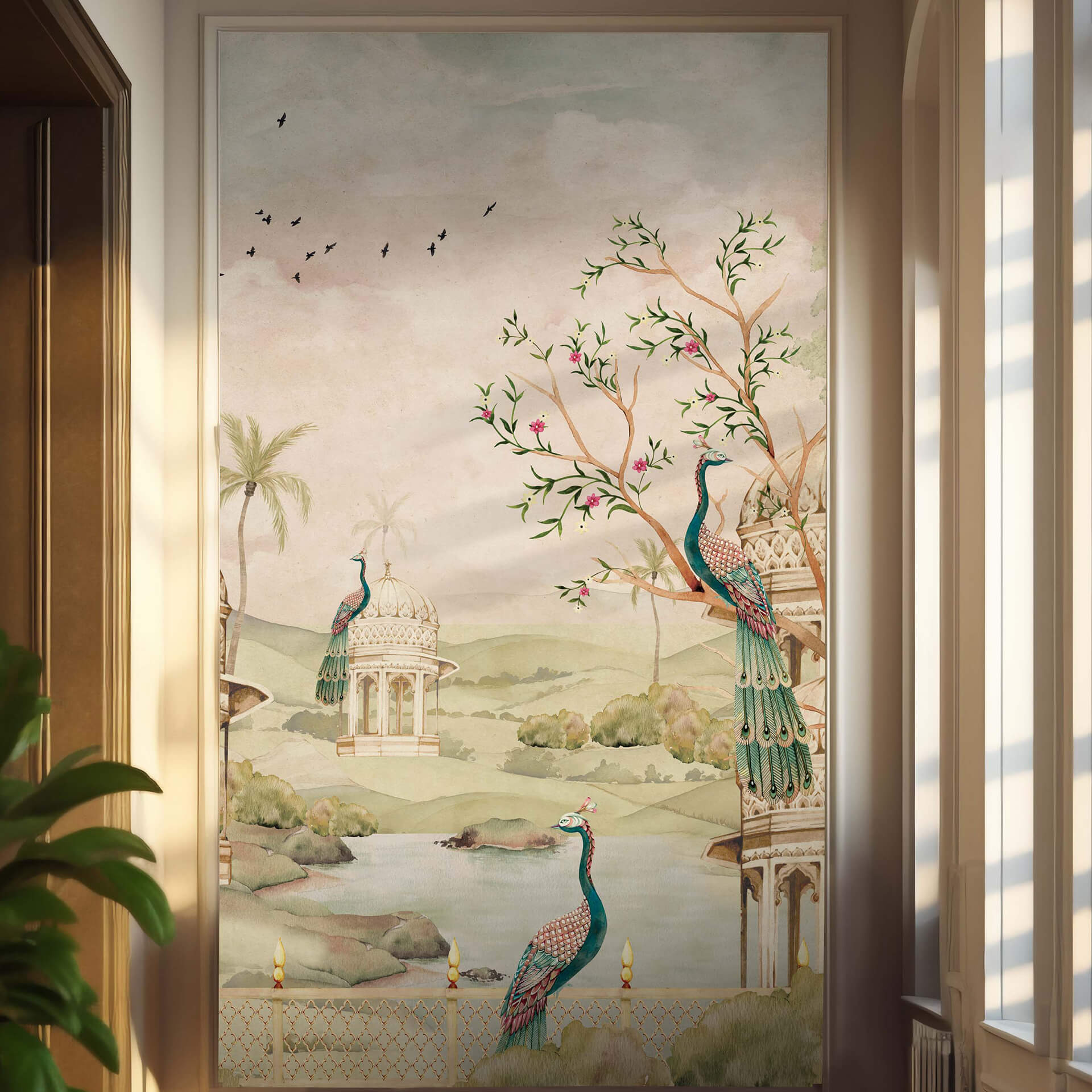 Heer-Ranjha: Indian Palace Peacock Wallpaper, inspired by the timeless love saga, this wallpaper captures the essence of grand Indian palaces adorned with intricate motifs and regal peacocks
