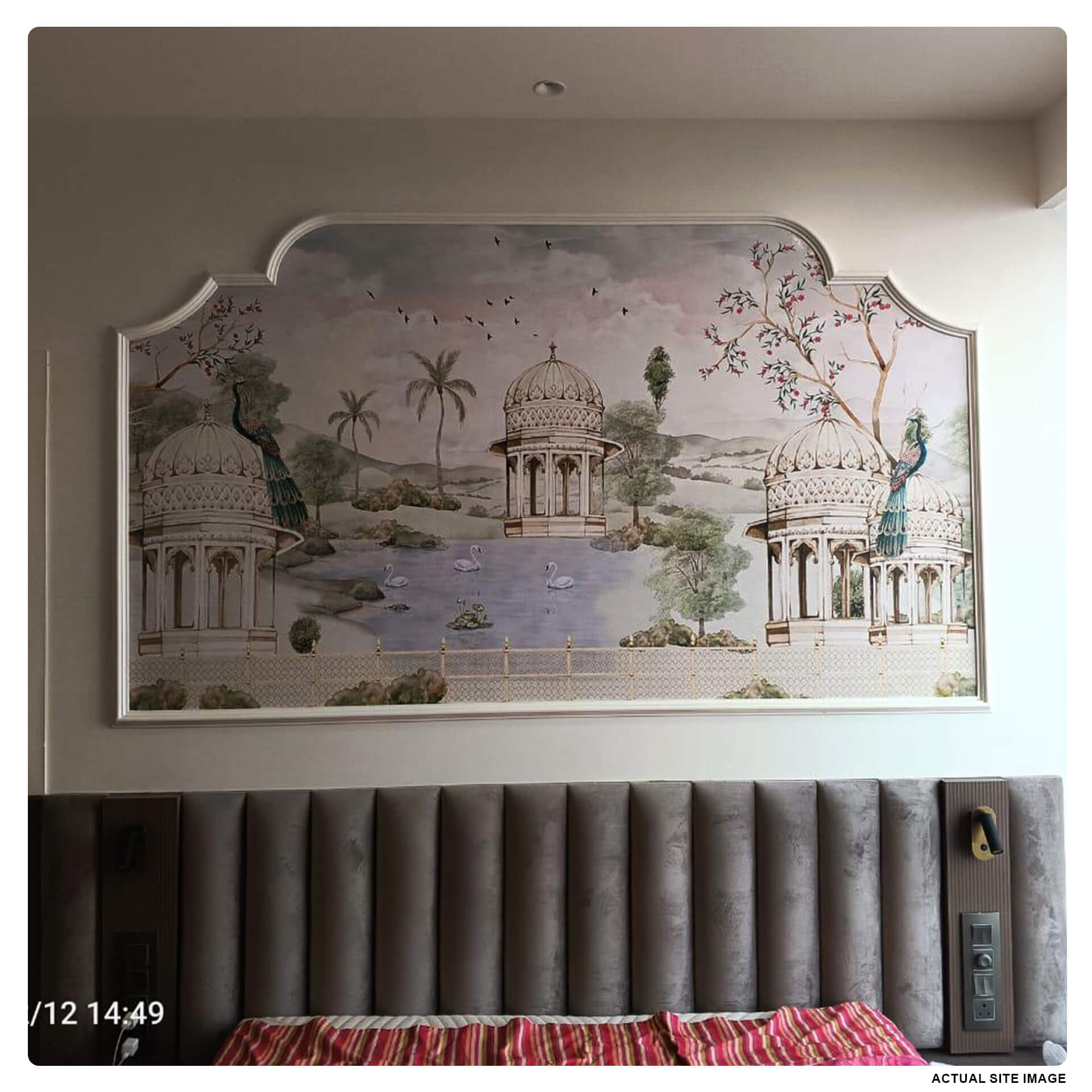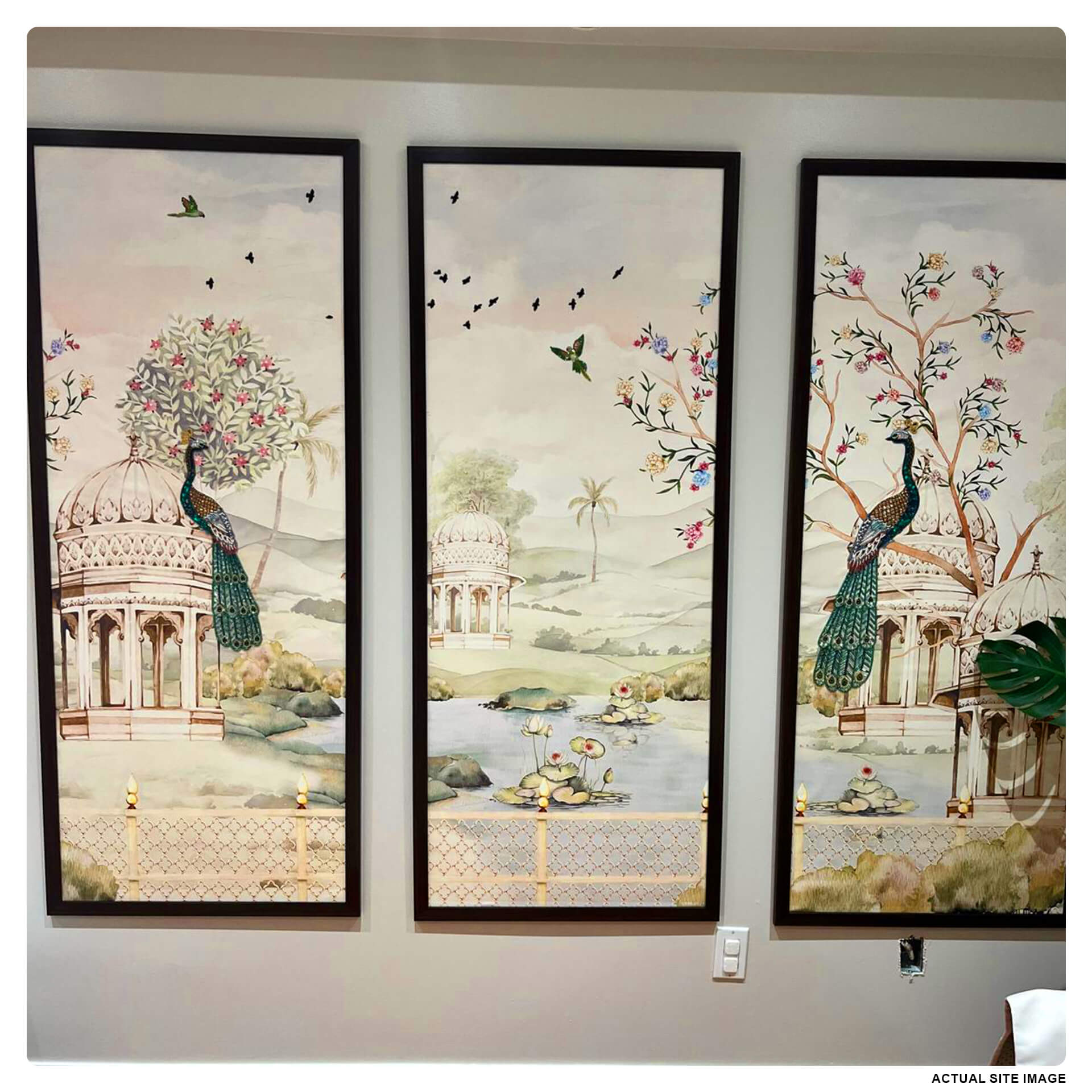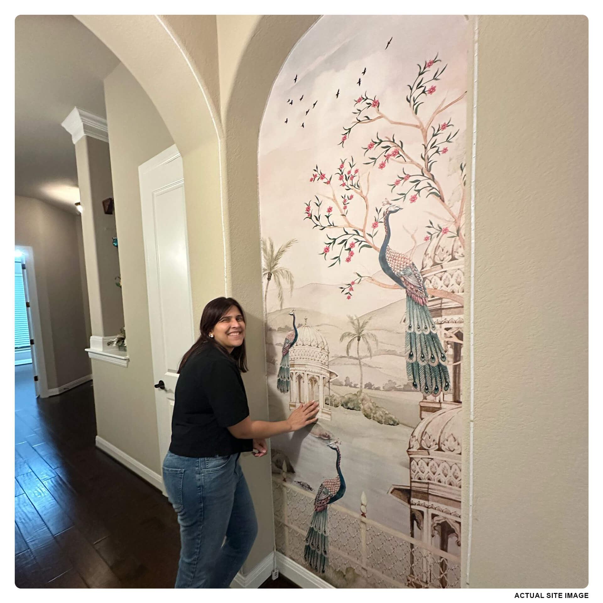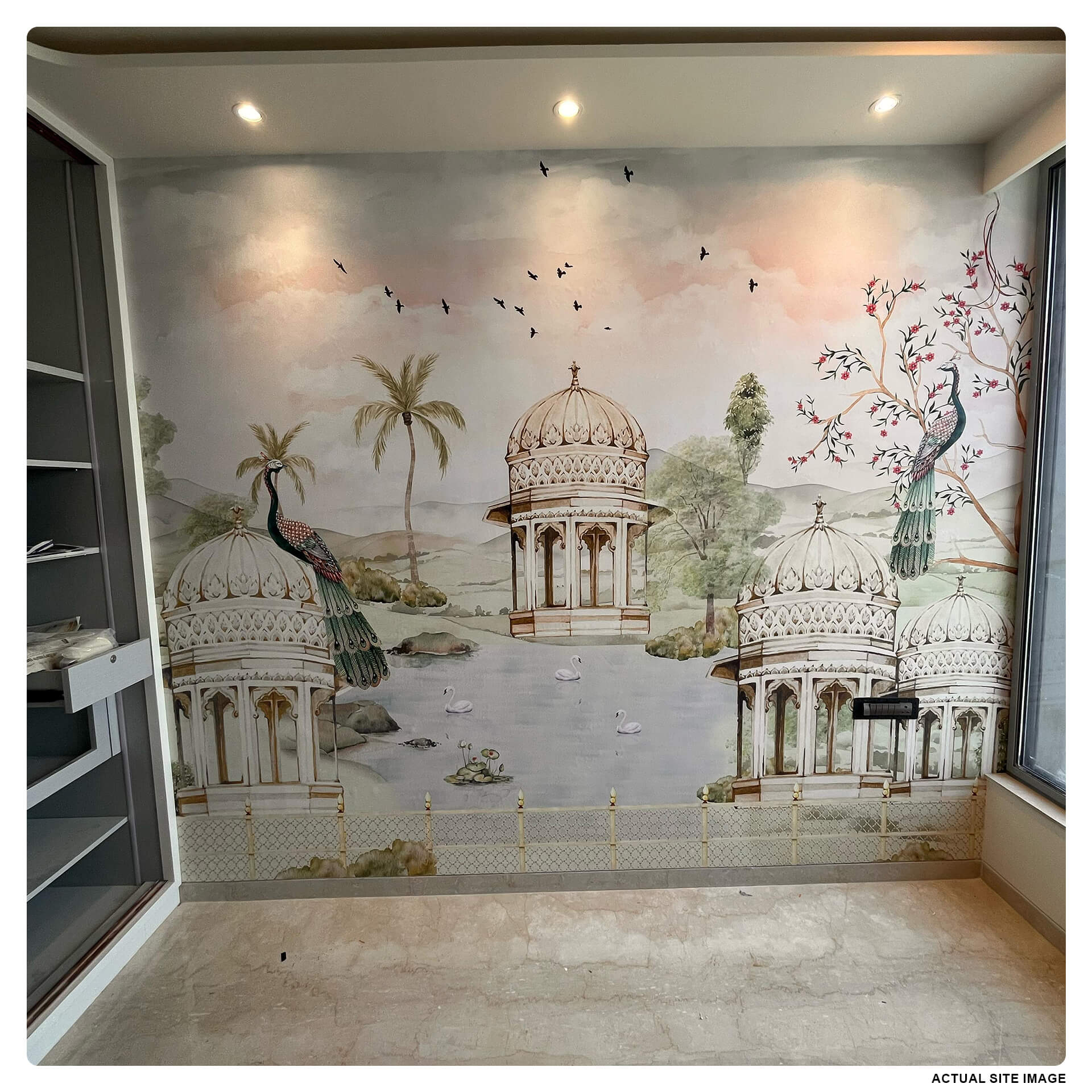 Heer-Ranjha: Indian Palace Peacock Wallpaper, inspired by the timeless love saga, this wallpaper captures the essence of grand Indian palaces adorned with intricate motifs and regal peacocks