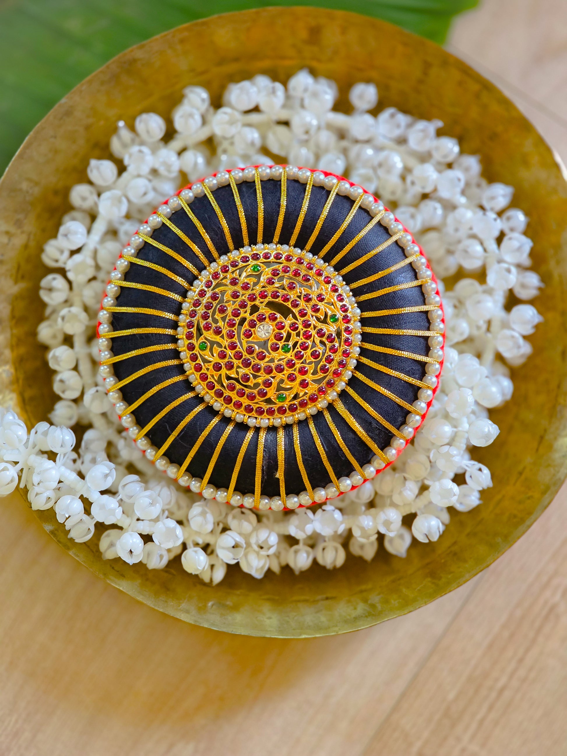 Pair the Divya Jada Billa with a matching pearl choker or long mala. Drape the hair in a neat jada with silk or floral garland, then place this piece over the bun to highlight the crown area. Add jasmine or lotus buds around it for a truly divine finish.