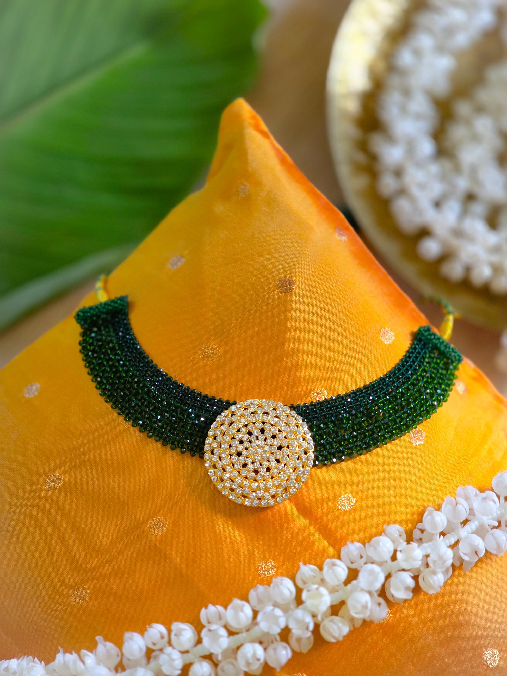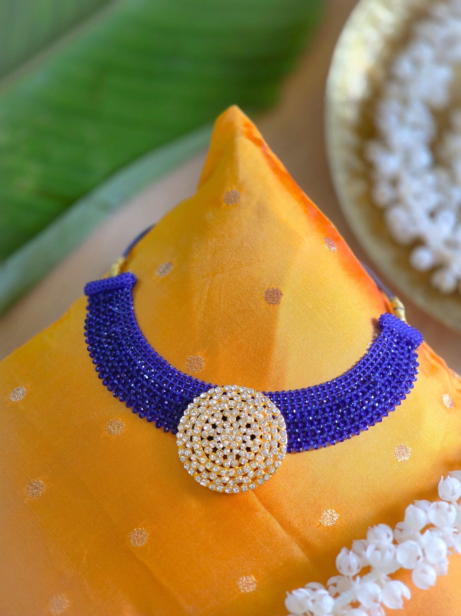 Elevate your pooja space or deity idol with the timeless elegance of Ratna Pathakam, a handcrafted pendant designed for divine adornment. Featuring eight lustrous, deep blue stones arranged in a floral cross pattern, each gem is bordered with shimmering CZ diamonds set in gold-finish alloy. This pendant is perfect for traditional use on deity idols during festivals, daily worship, or as a sacred gift for loved ones.