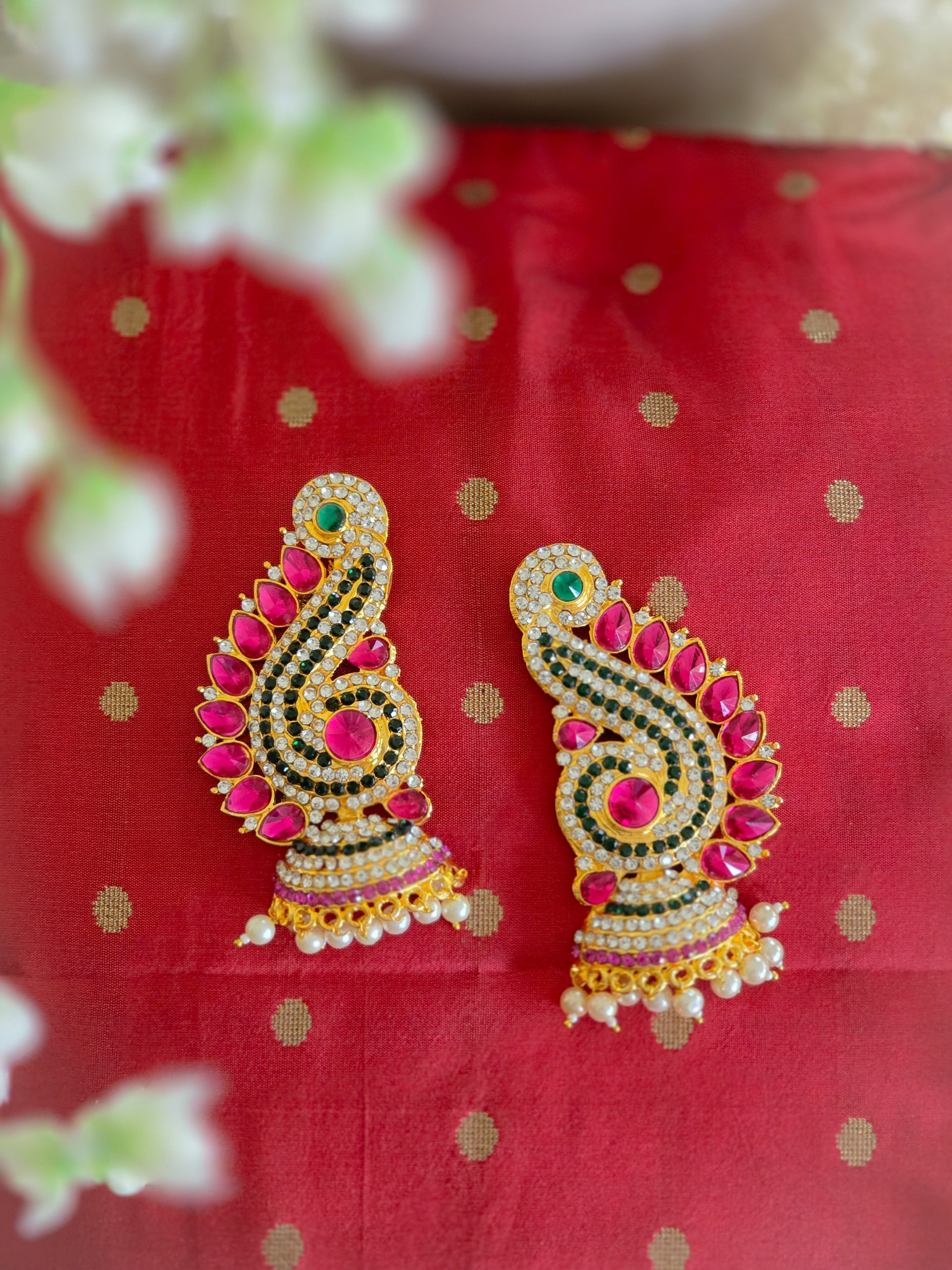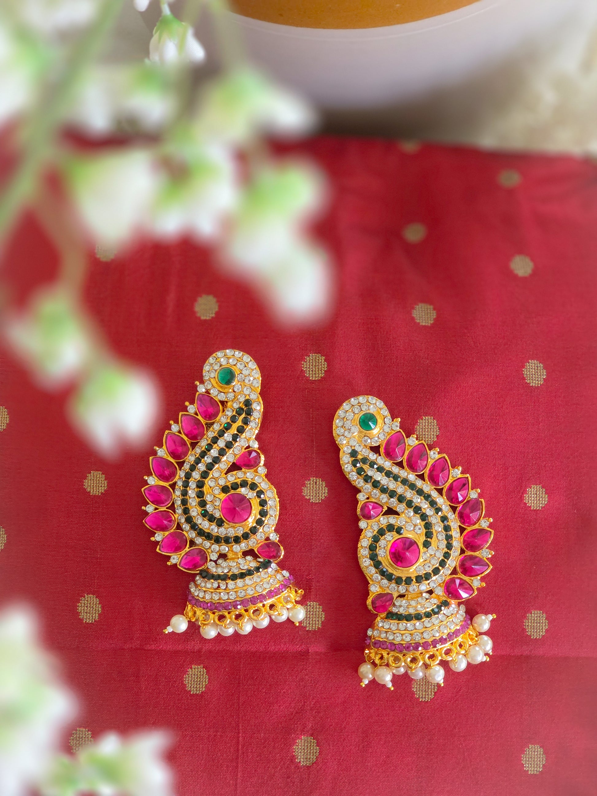 Grace your Ammavaru idol with these beautifully handcrafted earrings, inspired by traditional temple jewelry. Designed to add a divine touch, these earrings feature intricate detailing and a classic circular shape that complements any alankaram. Whether for daily pooja or festive adornment, these earrings bring timeless elegance to your sacred space.