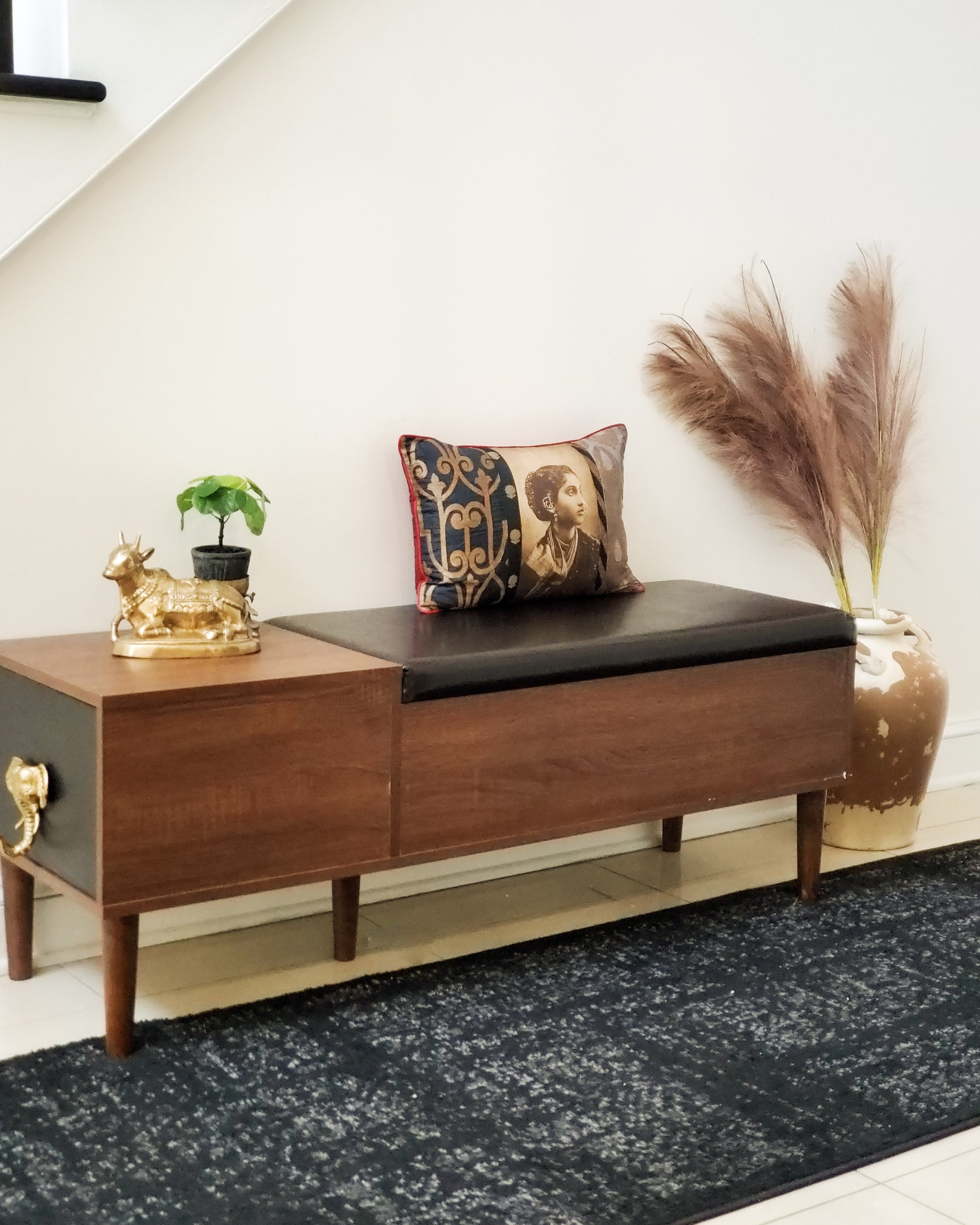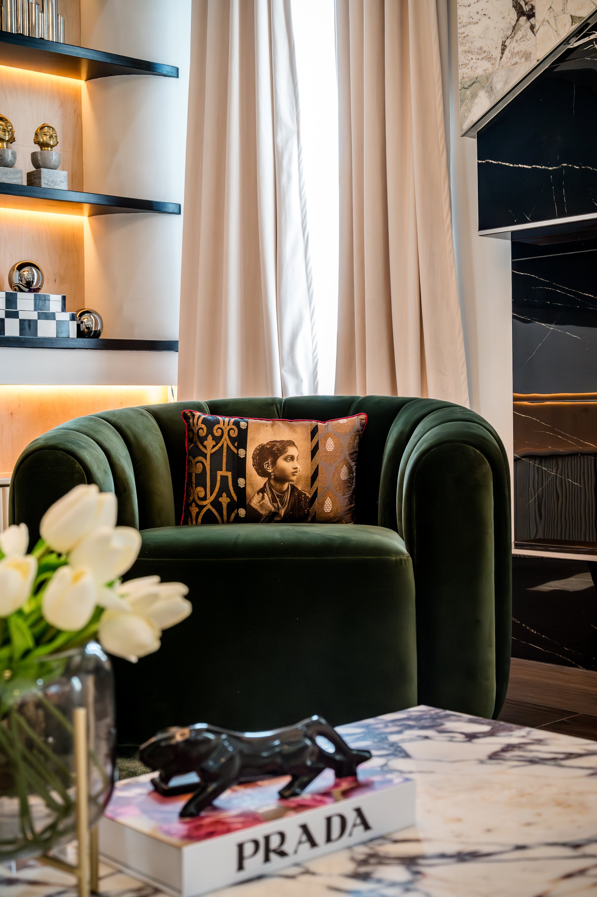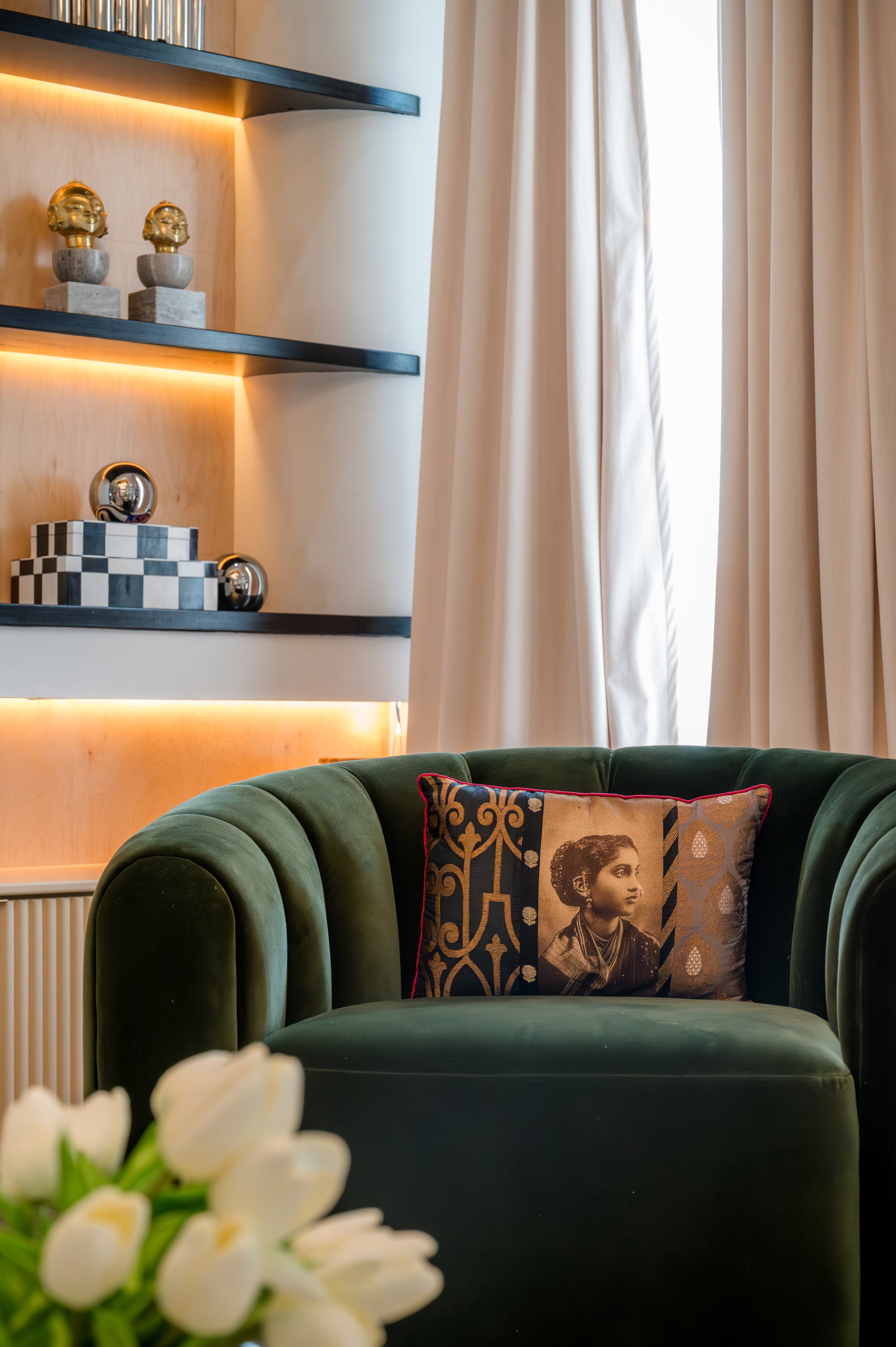 Style this cushion on an emerald green or indigo armchair with warm lighting and brass or wood accents. Pair it with solid velvet or neutral linen cushions to let the artwork shine as your room’s focal point.