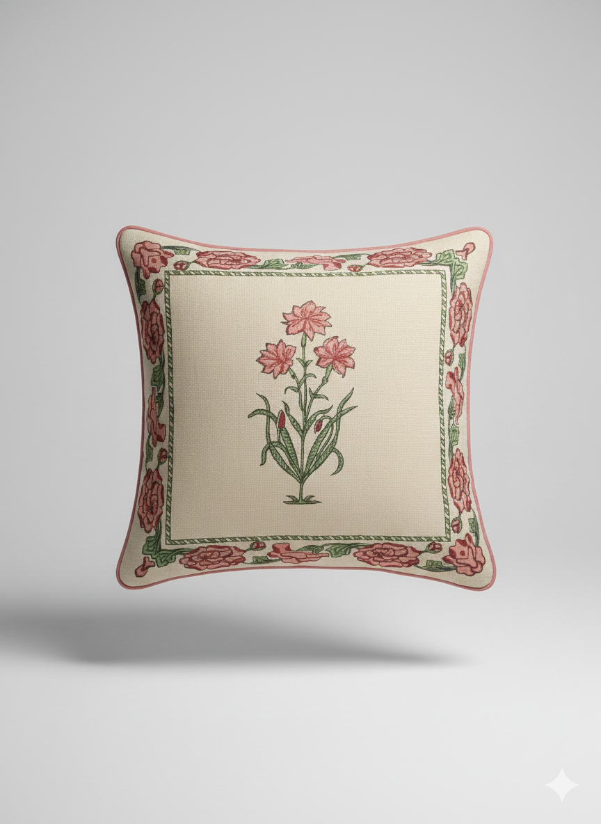 “Komala Kusumakriti” celebrates the grace of traditional Indian floral artistry through a soft, contemporary lens. The central hand-drawn bloom, framed with intricate petal and vine motifs, evokes the delicacy of old miniature paintings, while the clean cream base and gentle pastel palette give it a modern, airy freshness. This cushion cover brings together Mrudhu Sparsam (softness) and Suddha Saundaryam (pure elegance), making it perfect for homes that love timeless charm with a refined, minimalist aesthetic.