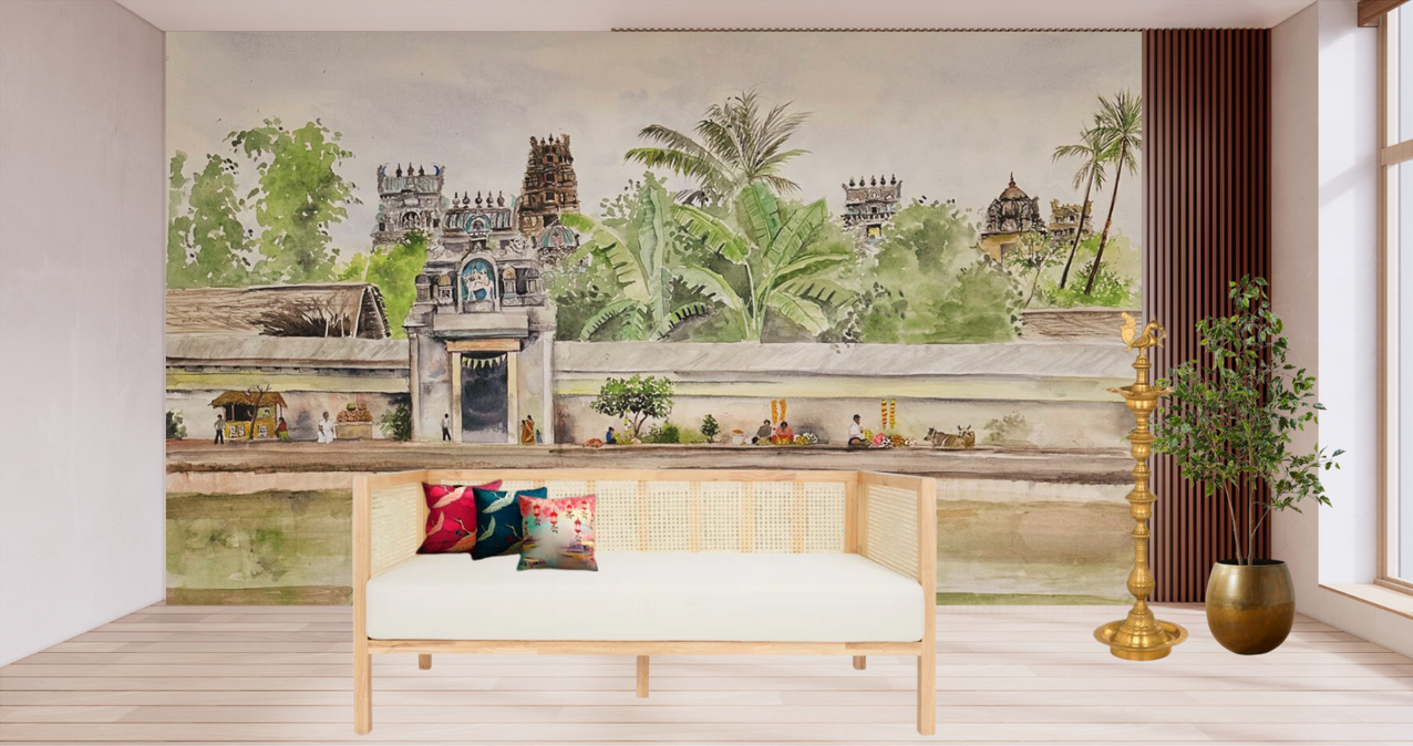 Step into the serene embrace of "Kovil Koneru," a captivating watercolor rendition that transports you to the timeless beauty of a South Indian village, reminiscent of the famed Chettinad region. This wallpaper design, meticulously crafted from an original painting, features a tranquil pond in the foreground, reflecting the soft hues of the sky and the surrounding verdant landscape.