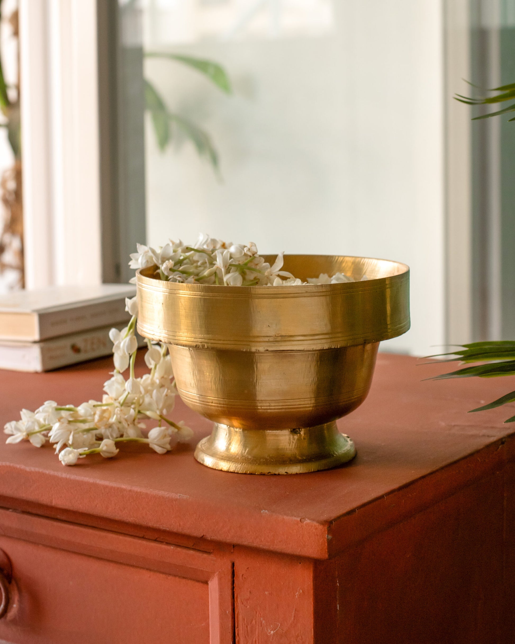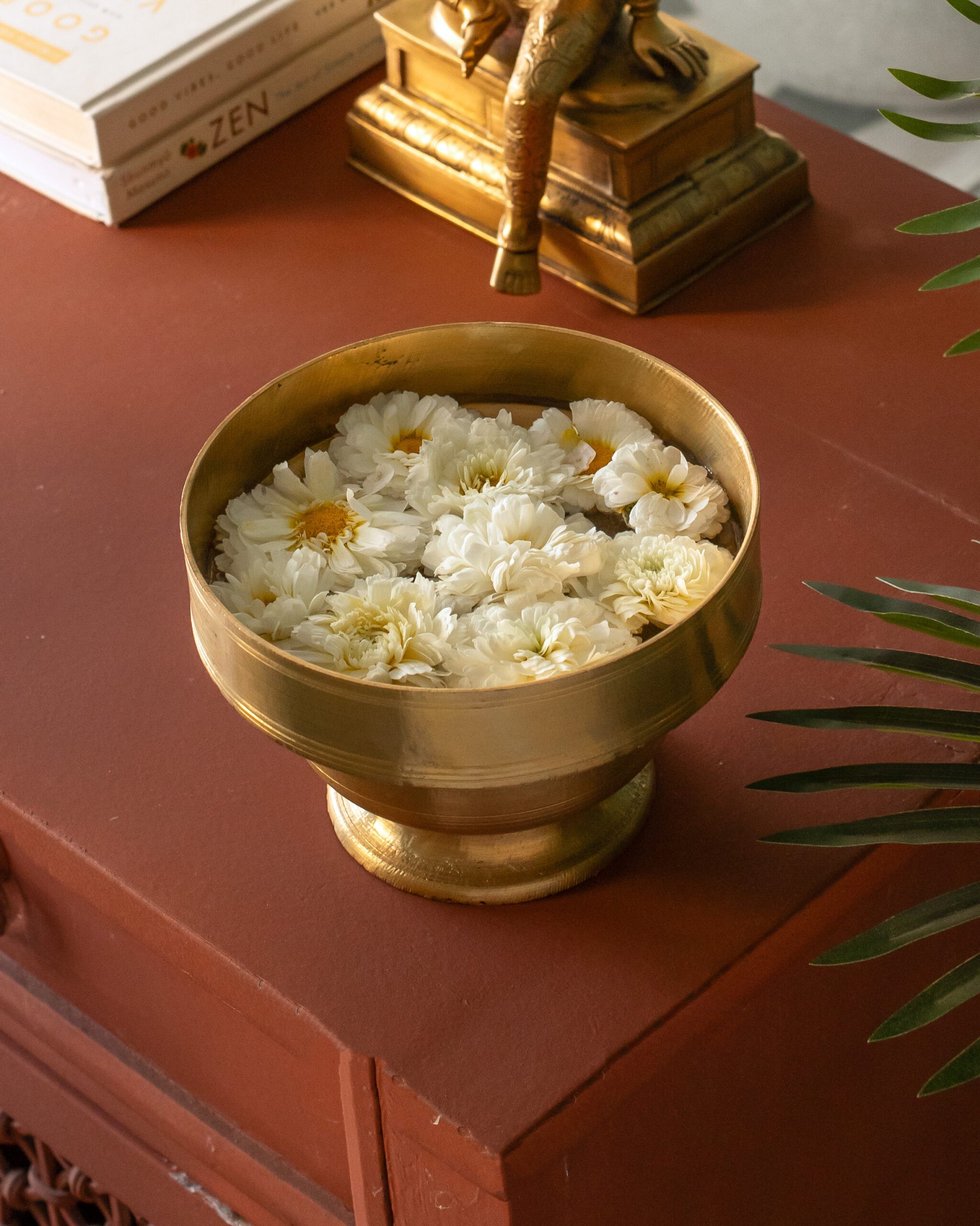 Use it as a floating flower bowl with marigolds or jasmine for festive decor. For everyday styling, place it on a console with vintage books or on your dining table filled with seasonal fruits. During pujas, it beautifully holds water, kumkum, or offerings — seamlessly blending utility and elegance.