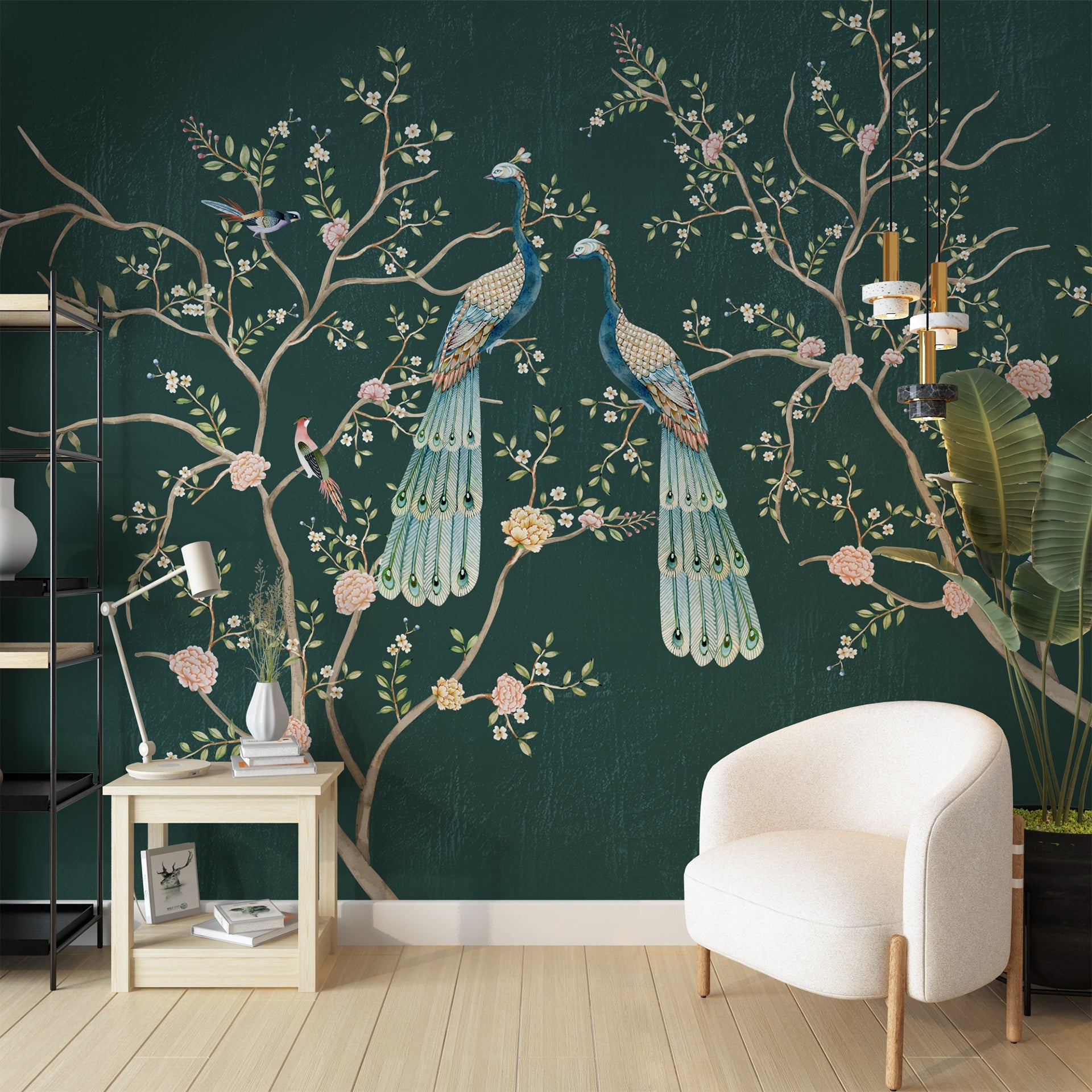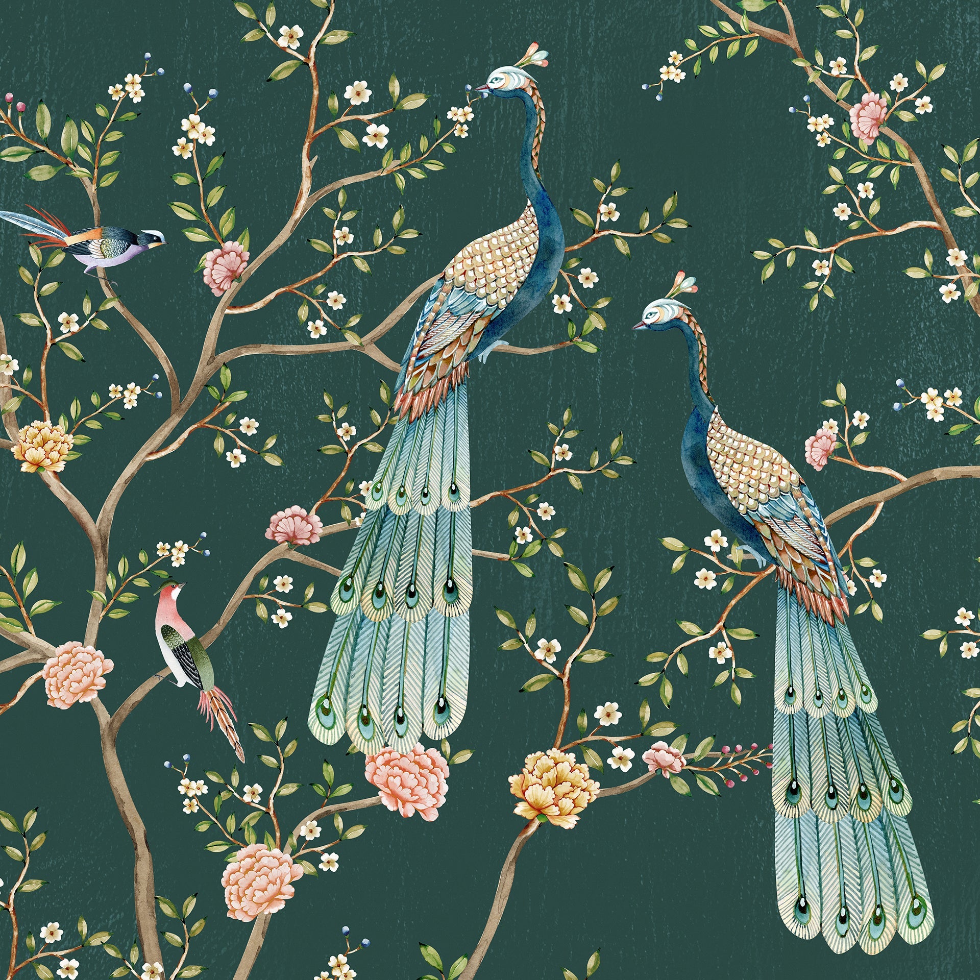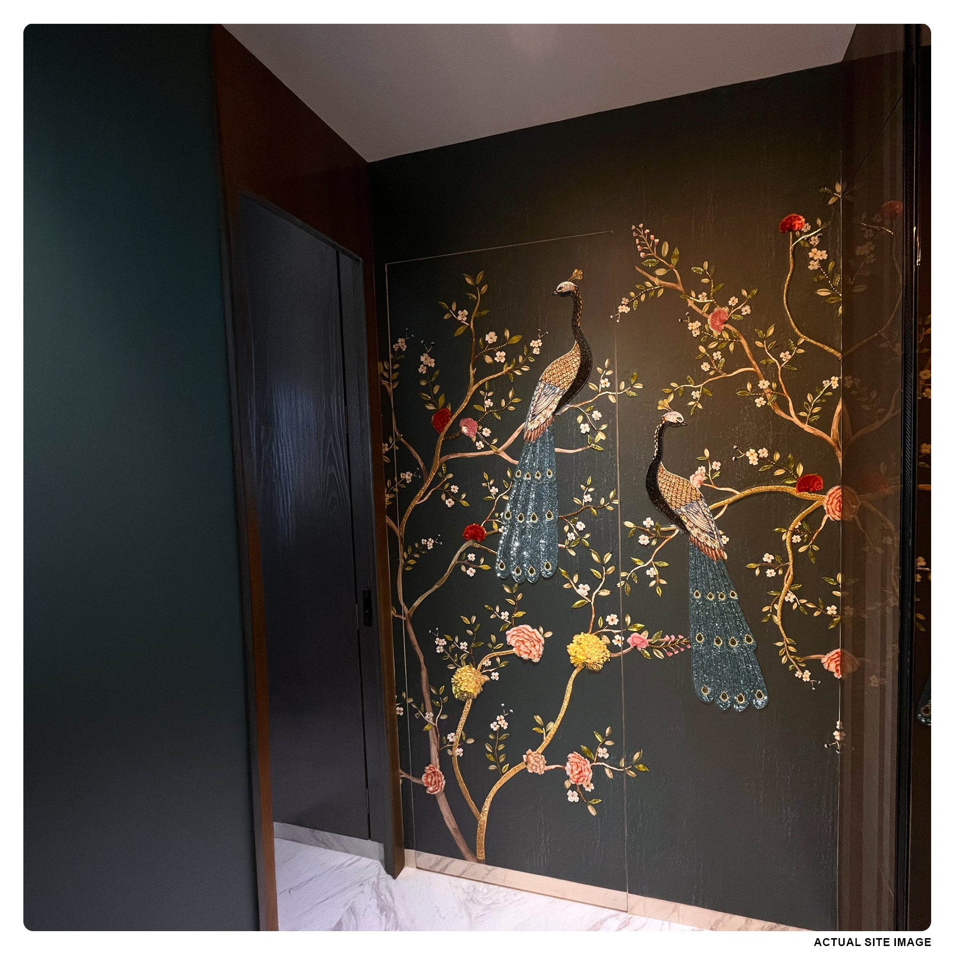 Midnight floral wallpaper with peacock motifs. The deep, dramatic tones and detailed floral patterns create a luxurious, nature-inspired statement wall. Perfect for bedrooms, living rooms, or feature walls seeking elegance and sophistication.