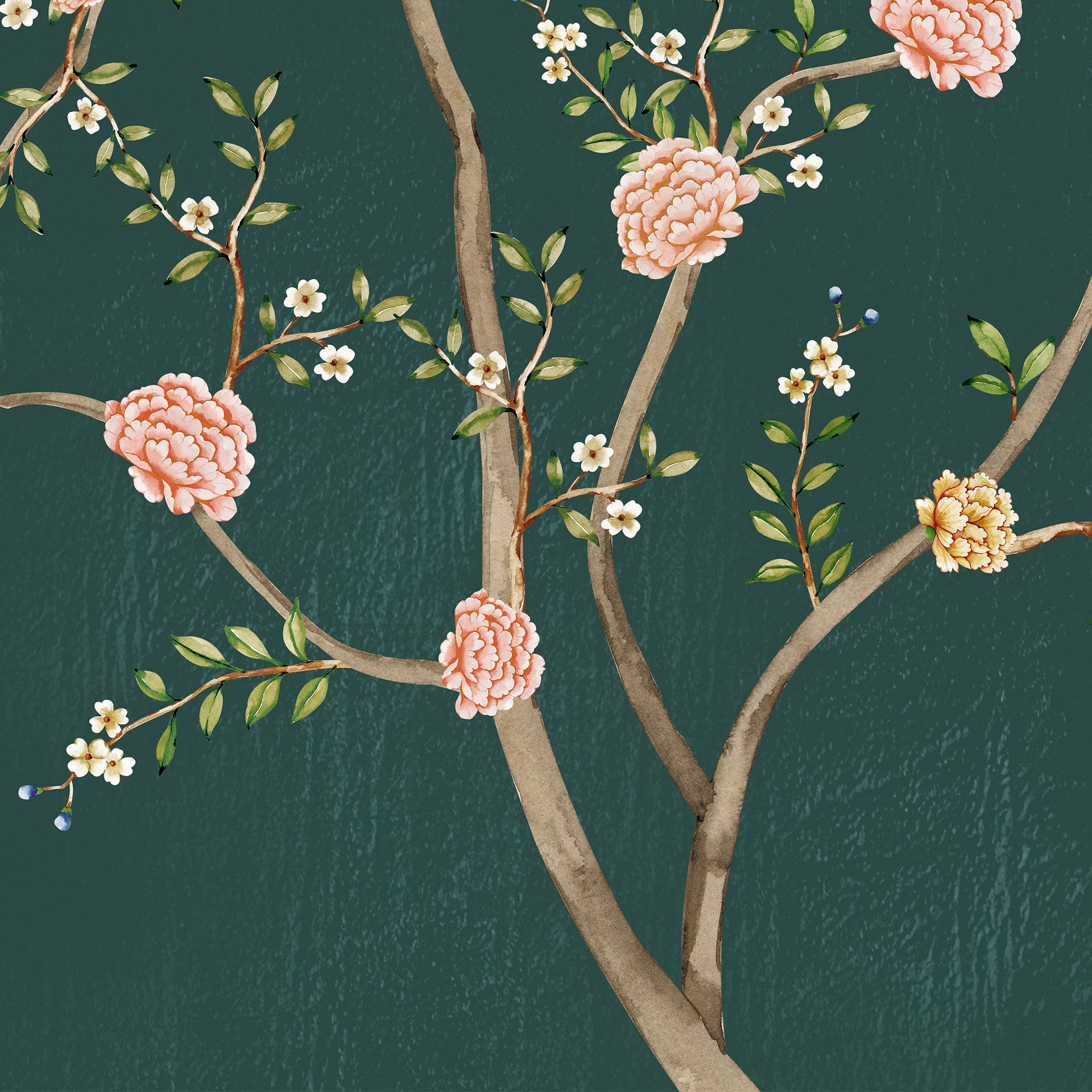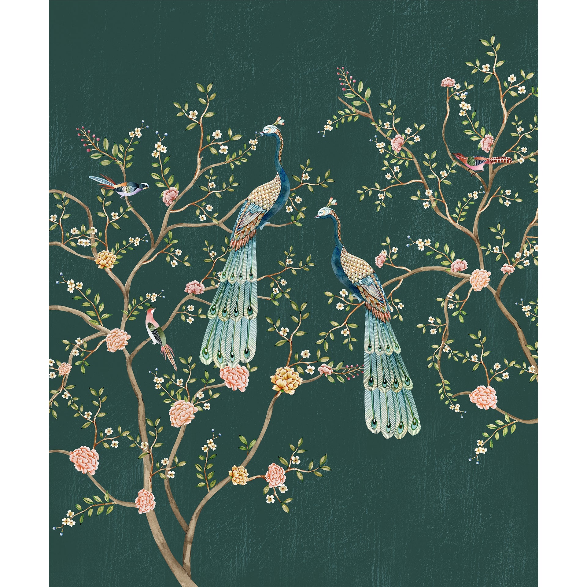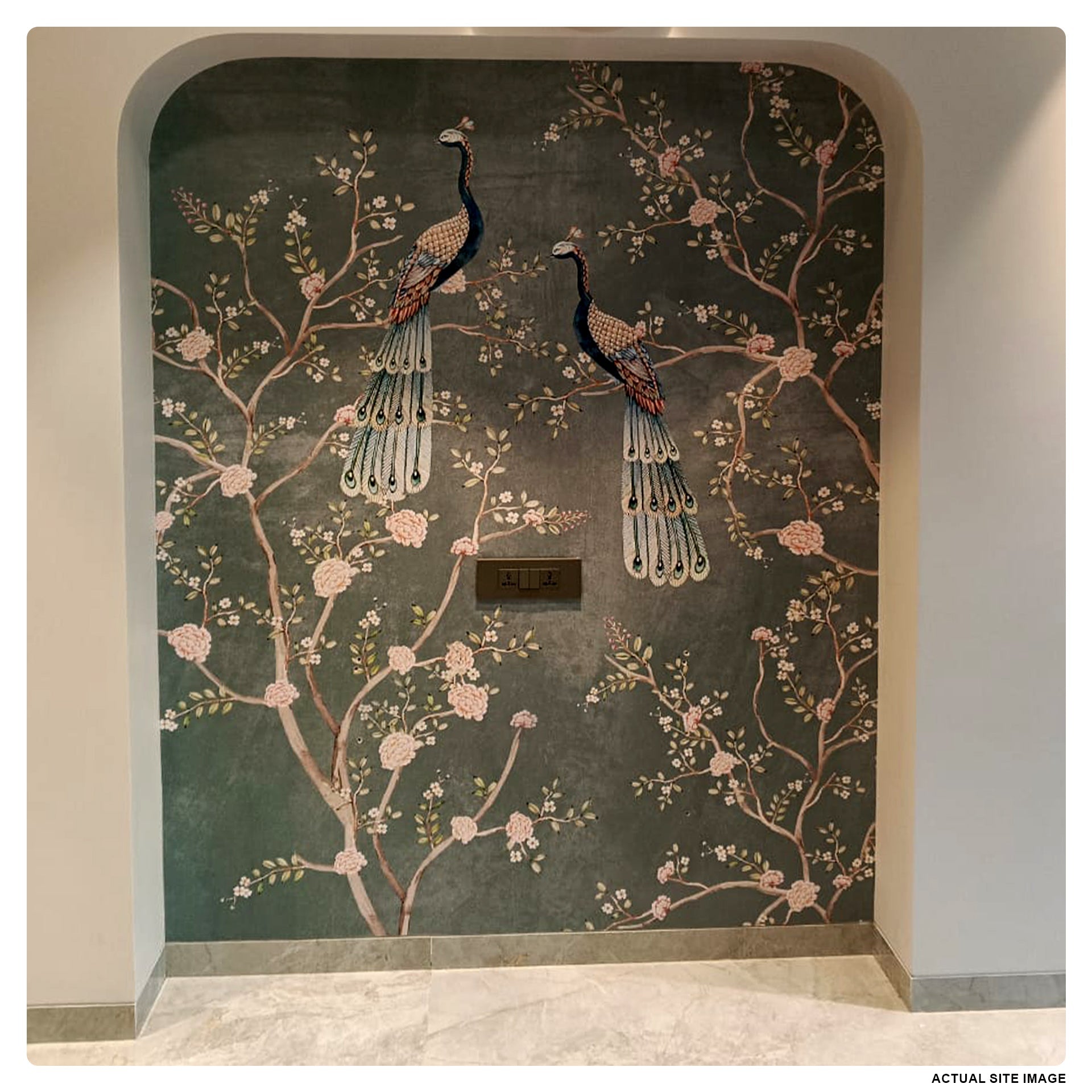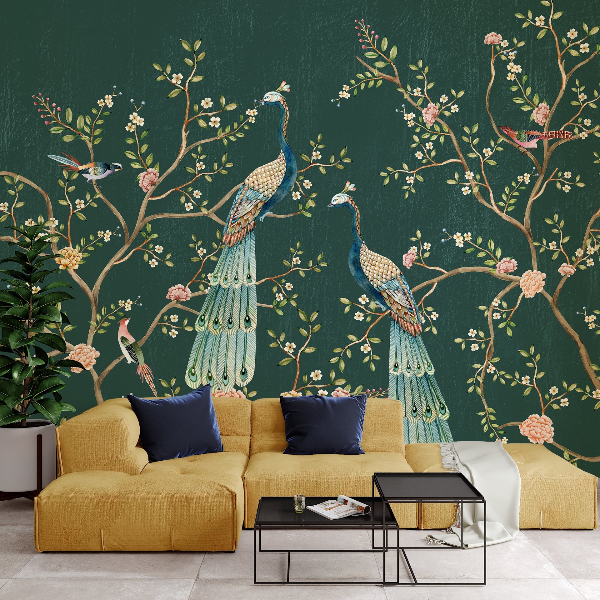 Midnight floral wallpaper with peacock motifs. The deep, dramatic tones and detailed floral patterns create a luxurious, nature-inspired statement wall. Perfect for bedrooms, living rooms, or feature walls seeking elegance and sophistication.