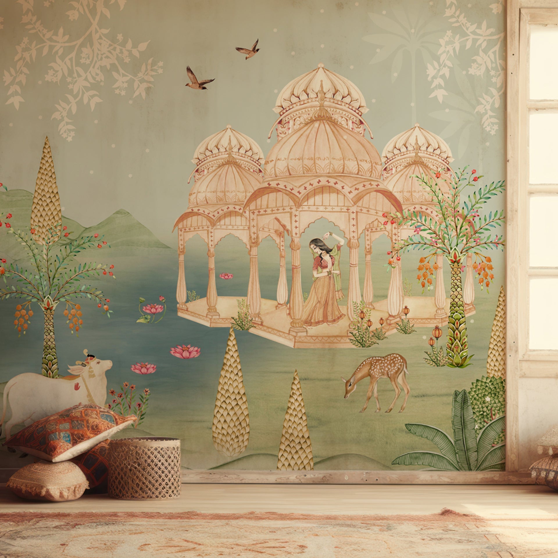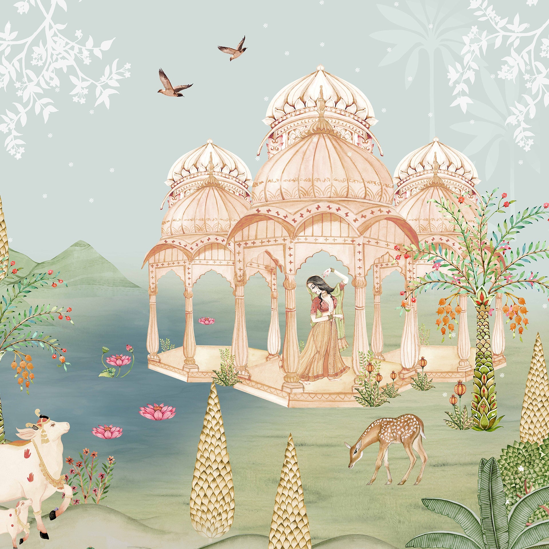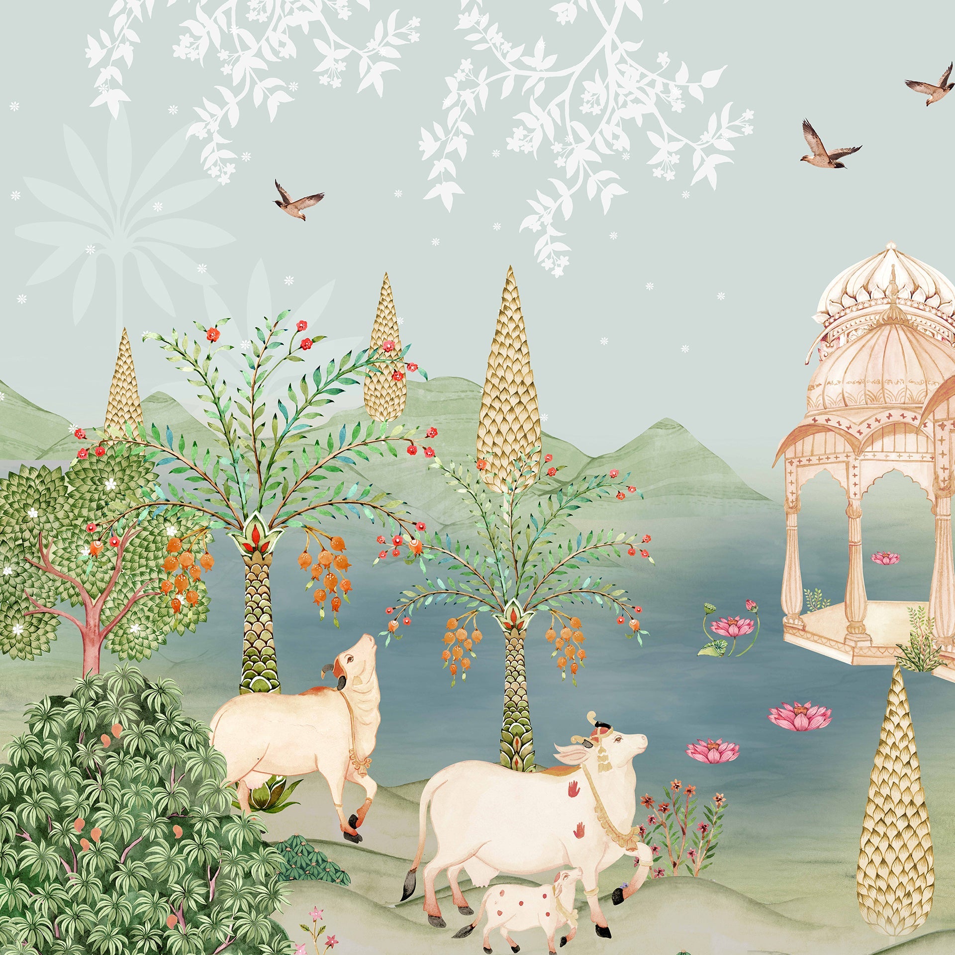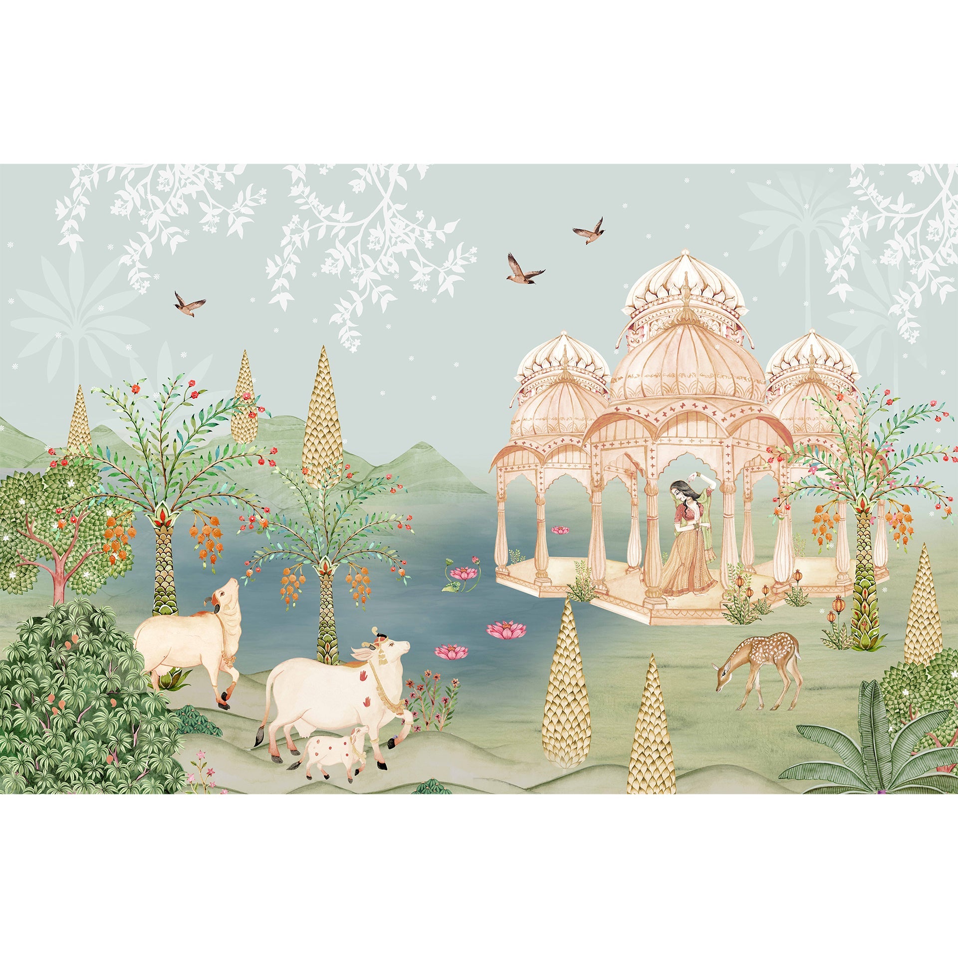 Moonlit Pichwai wallpaper with lotus, lake and animals like cows and deer. Can be a good wallpaper choice for lobby wall art to show cultural richness and soft elegance.