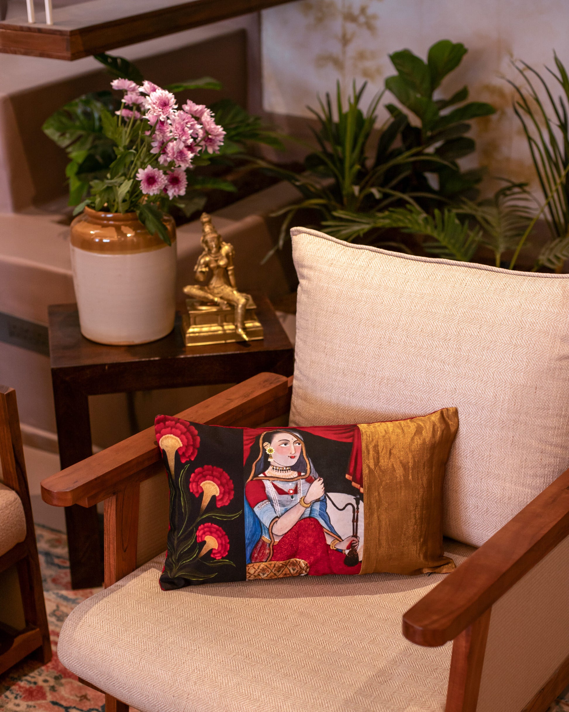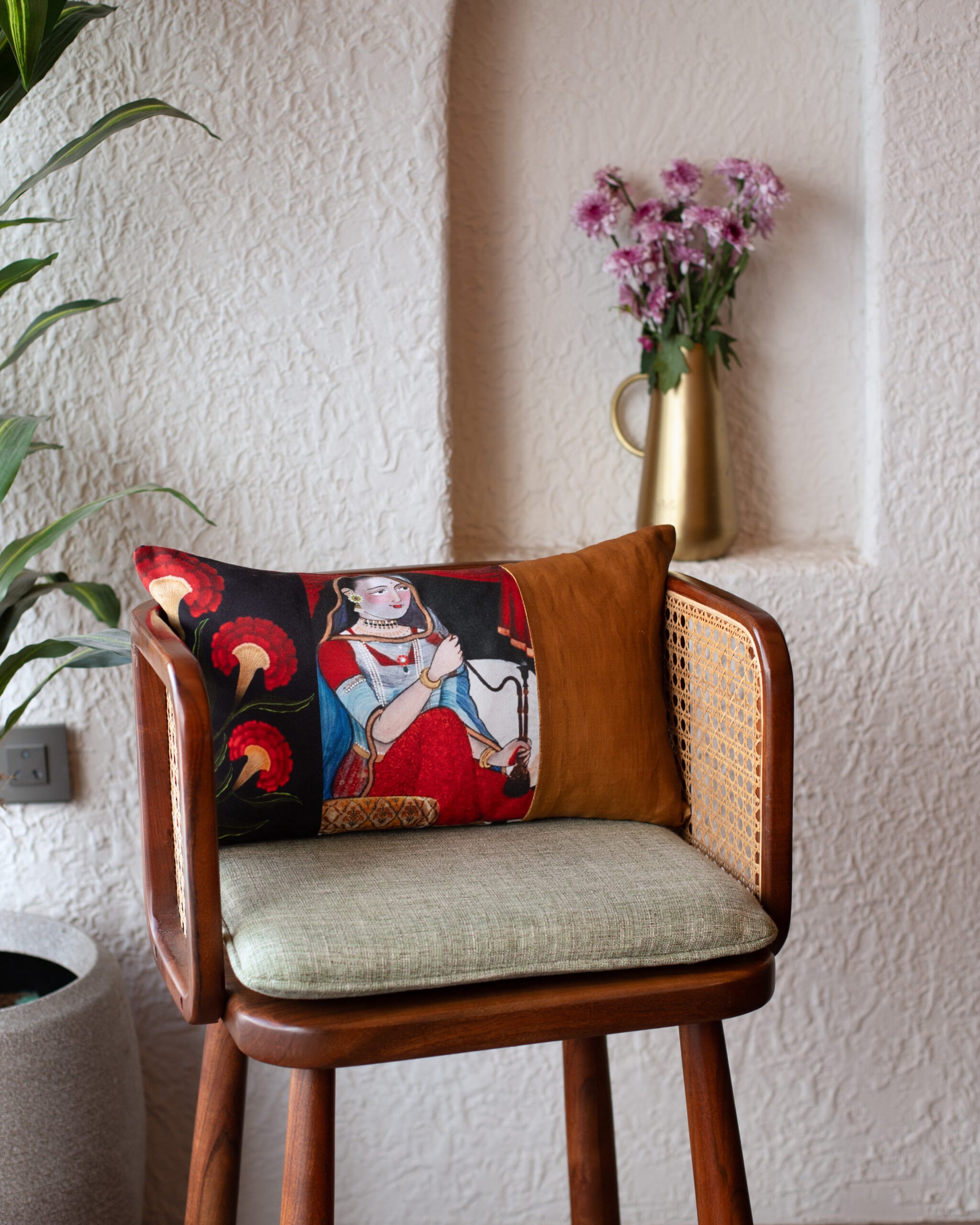 - Style the Mughal Naikas cushion covers on a vintage wooden bench, deep-toned velvet sofa, or cane armchair.