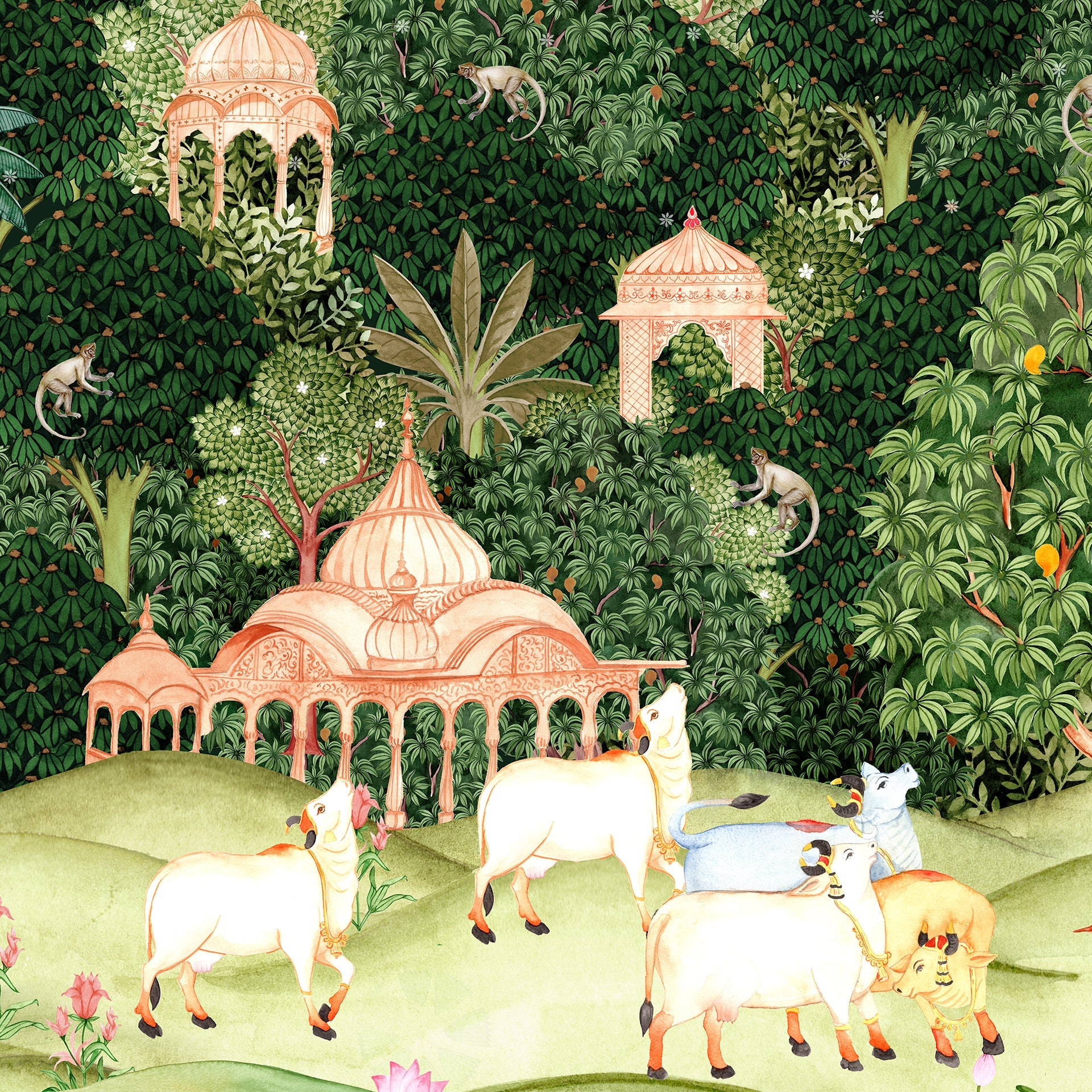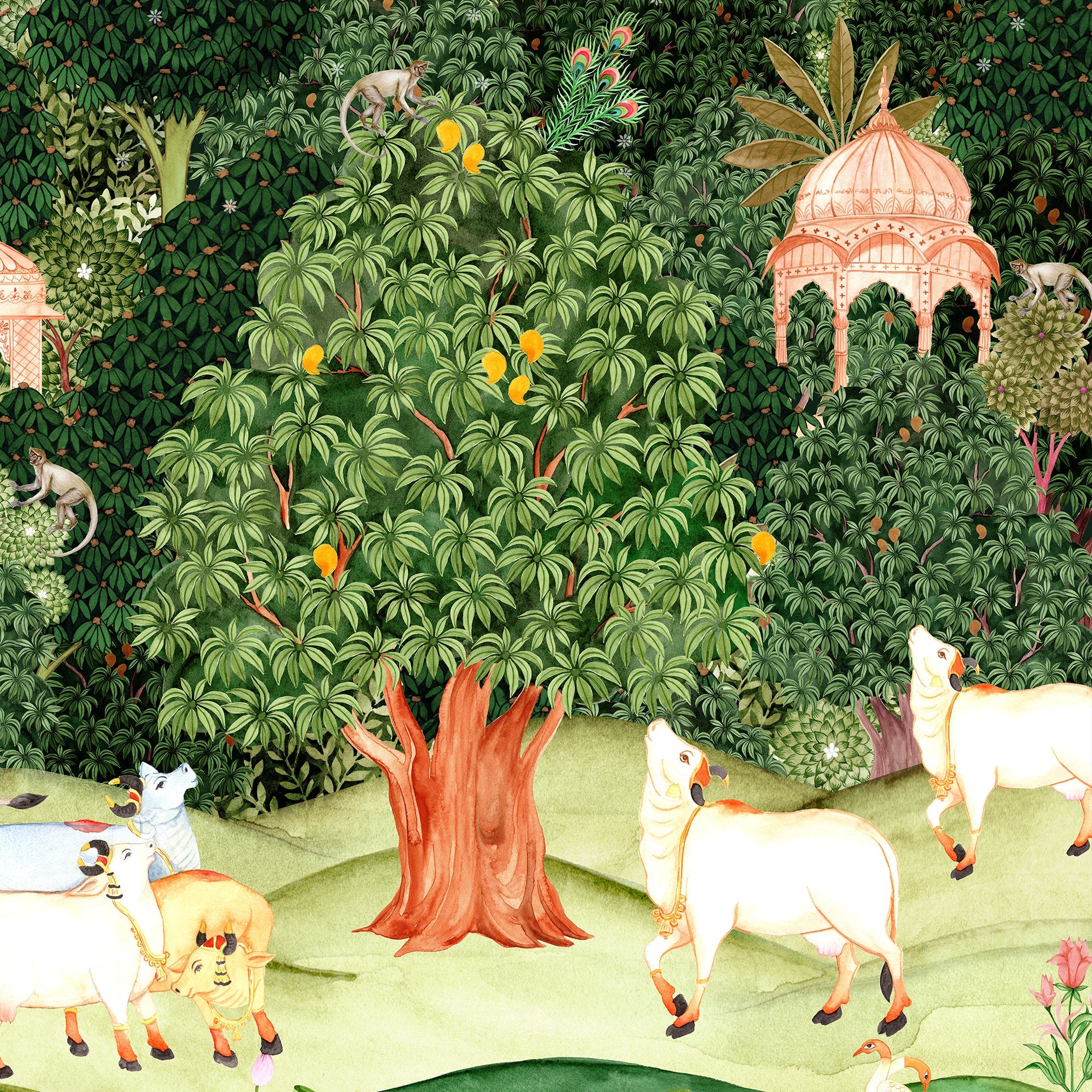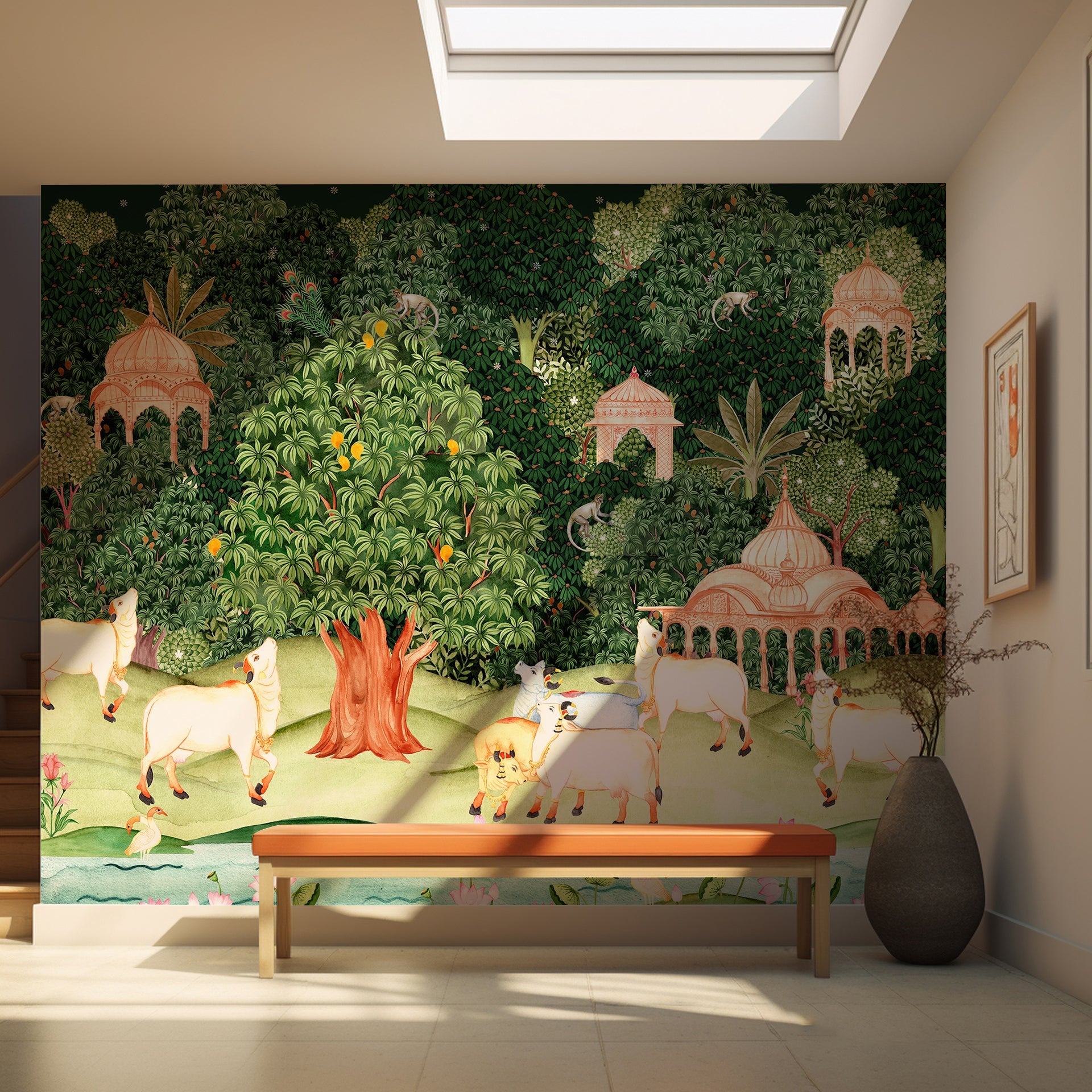 Pichwai Jungle wallpaper with Mango trees, sacred cow and monkeys for foyer area or living room. This transforms walls into storytelling canvases.