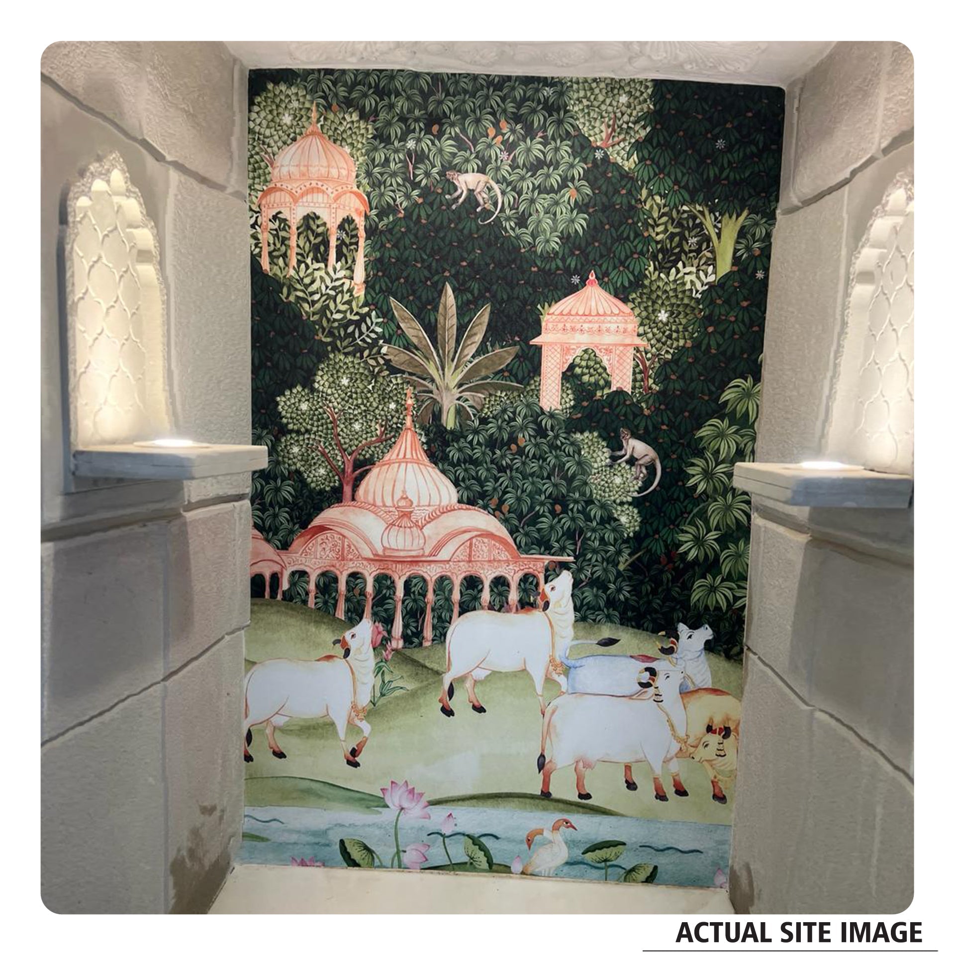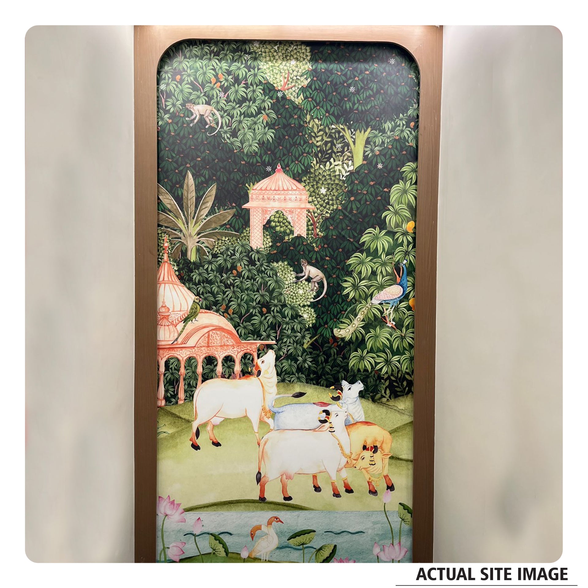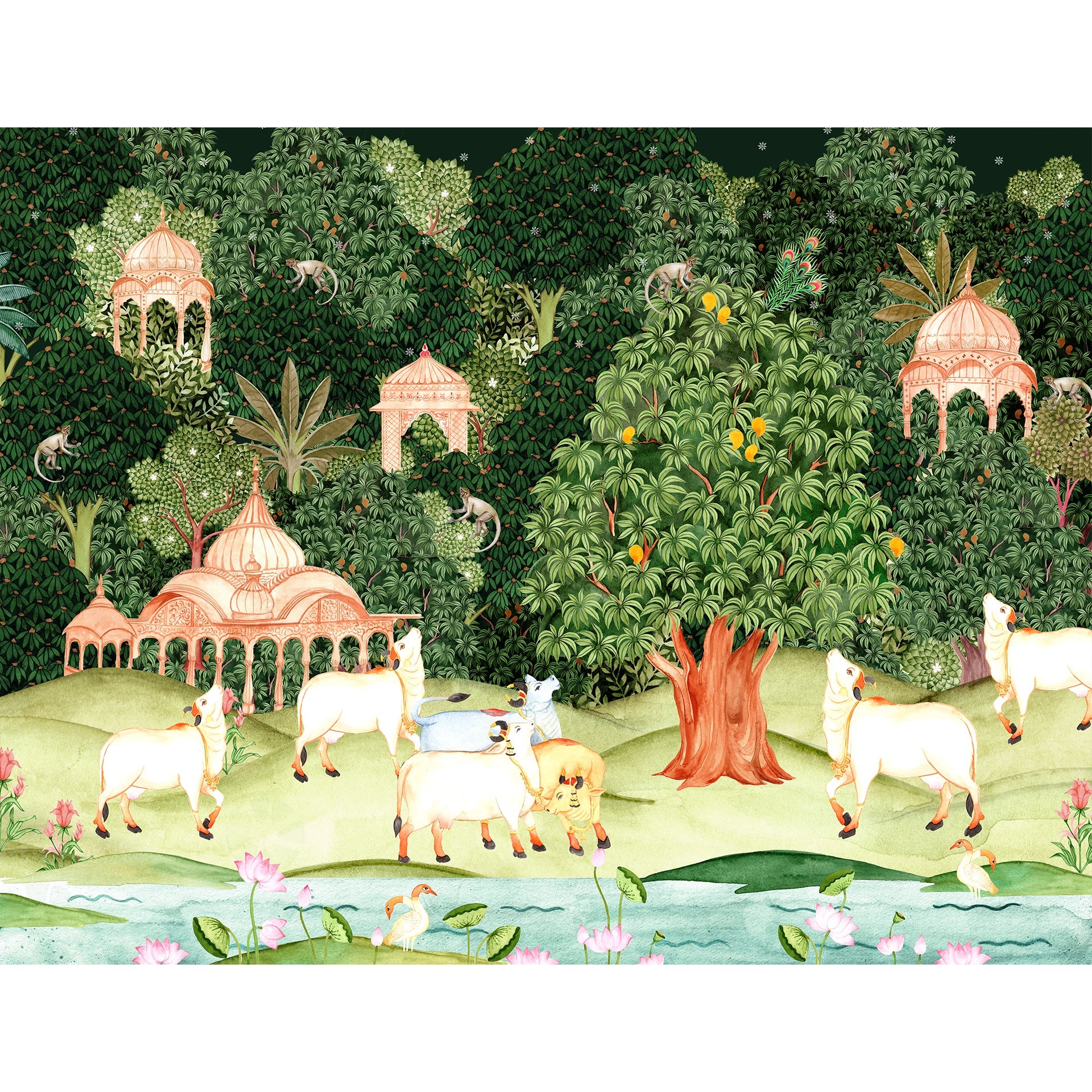 Pichwai Jungle wallpaper with Mango trees, sacred cow and monkeys for foyer area or living room. This transforms walls into storytelling canvases.