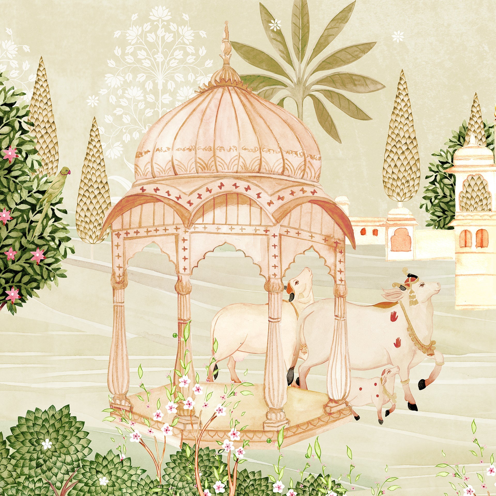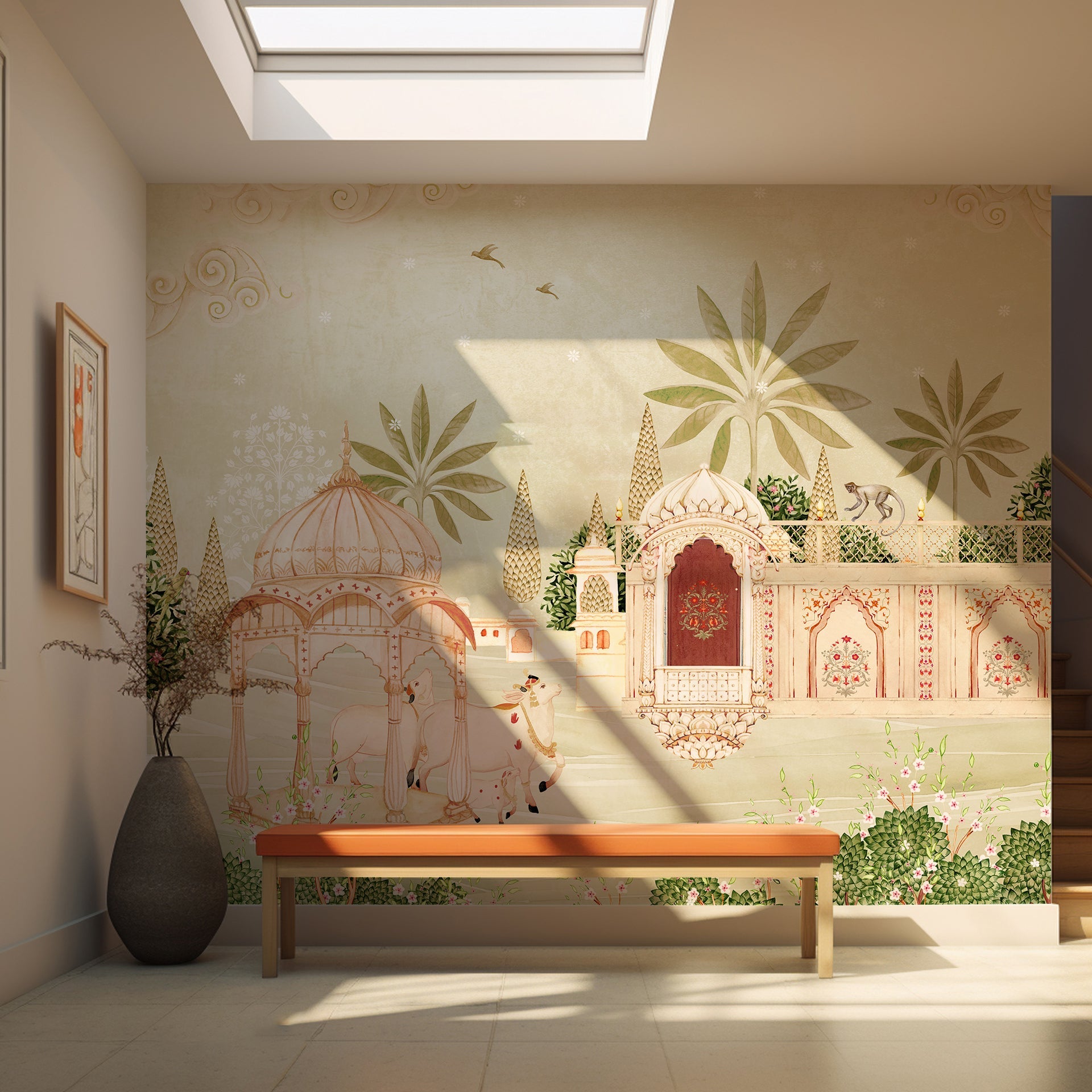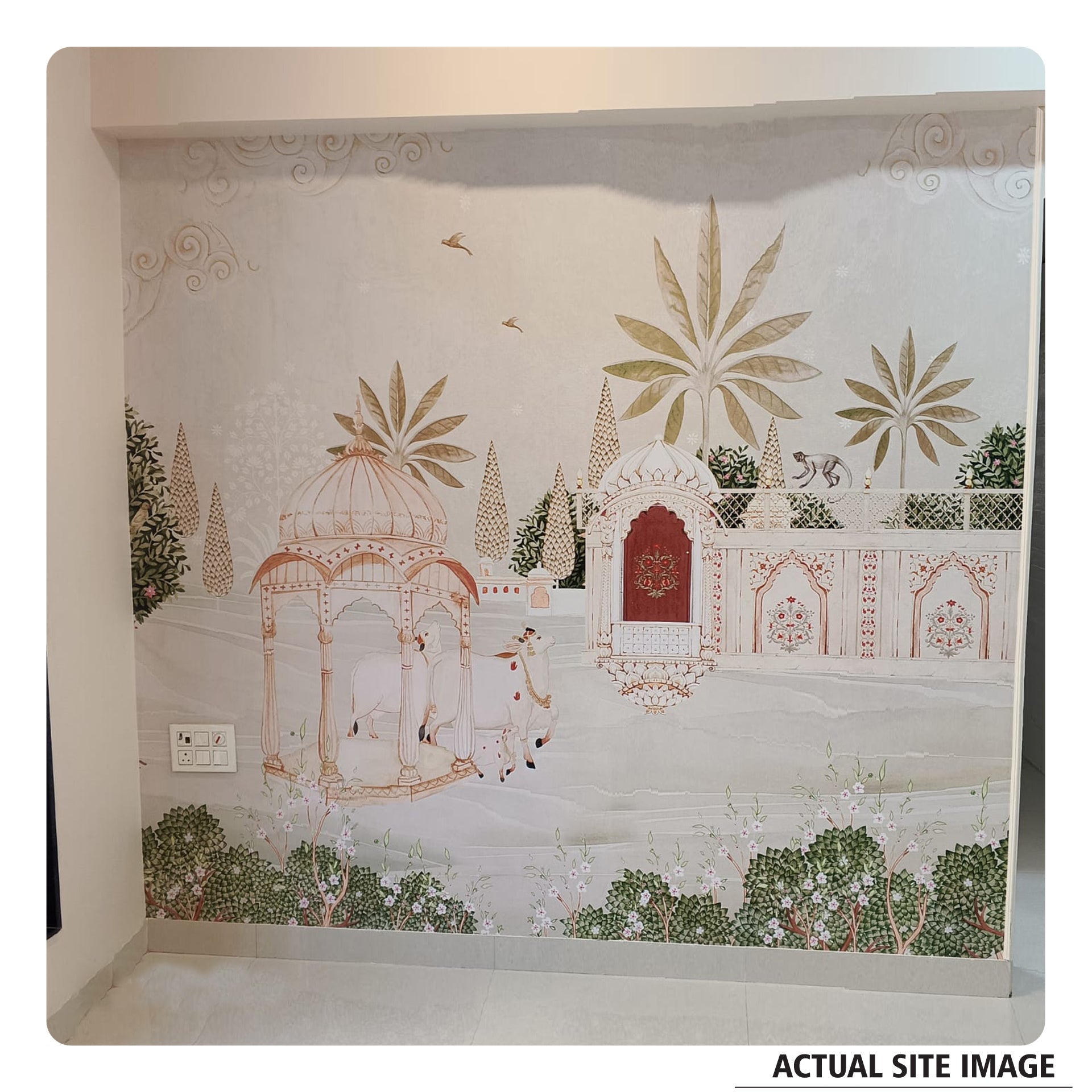 Pastel Pichwai Indian Palace wallpaper for hotels, boutiques, designer showrooms. This pichwai wall art adds heritage charms to modern spaces.