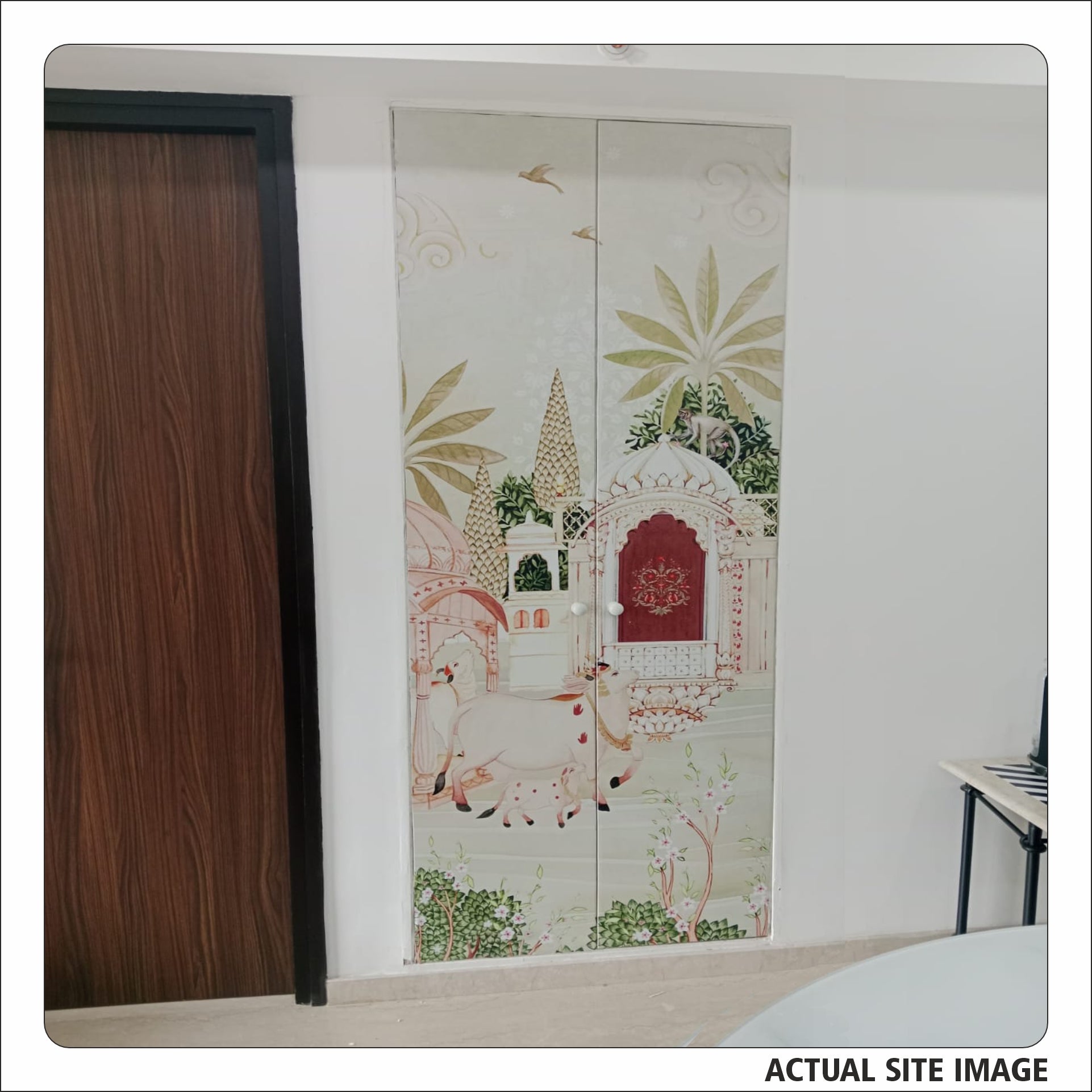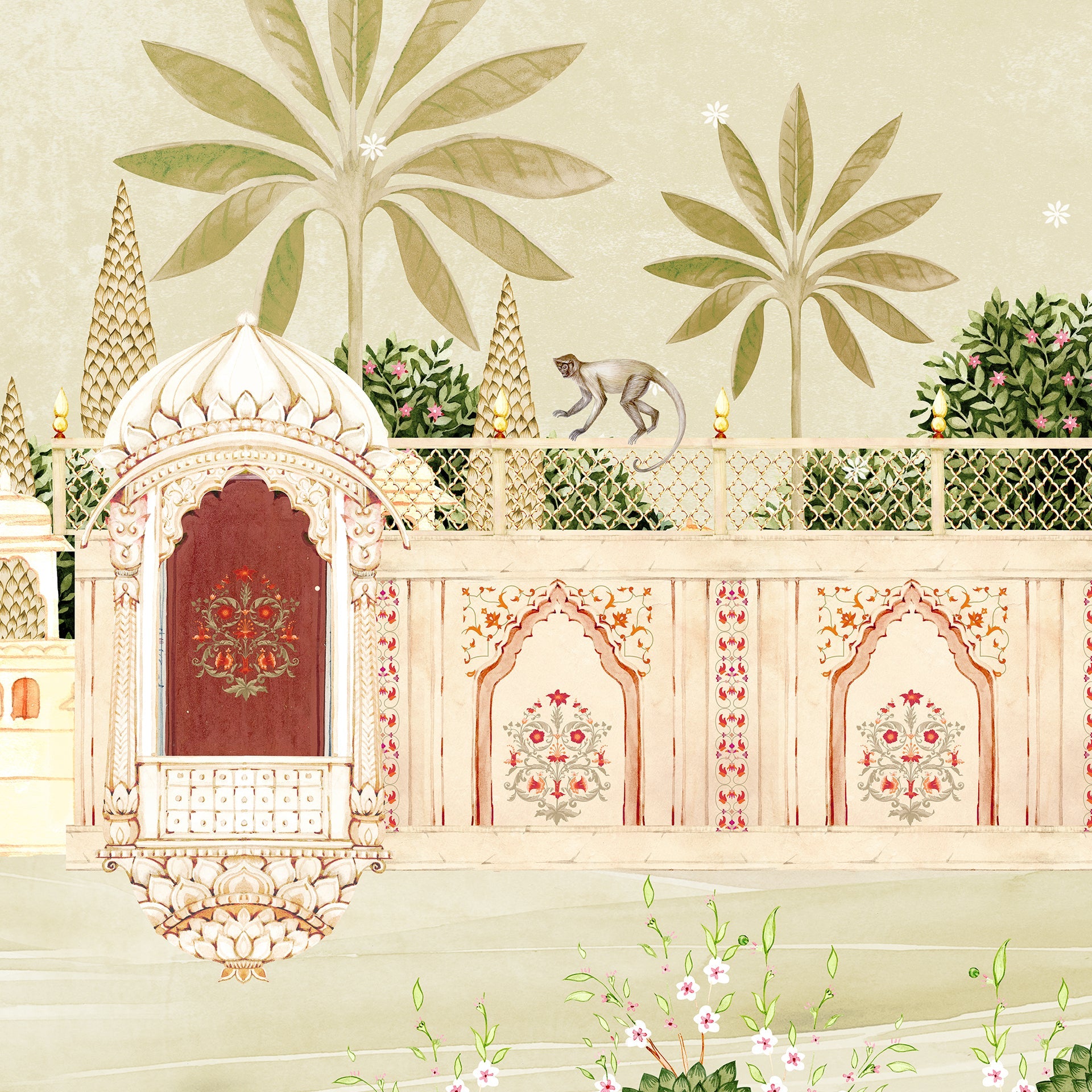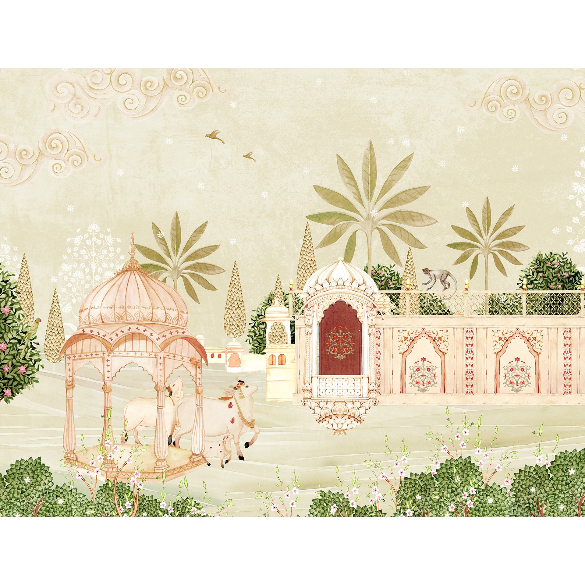 Pastel Pichwai Indian Palace wallpaper for hotels, boutiques, designer showrooms. This pichwai wall art adds heritage charms to modern spaces.
