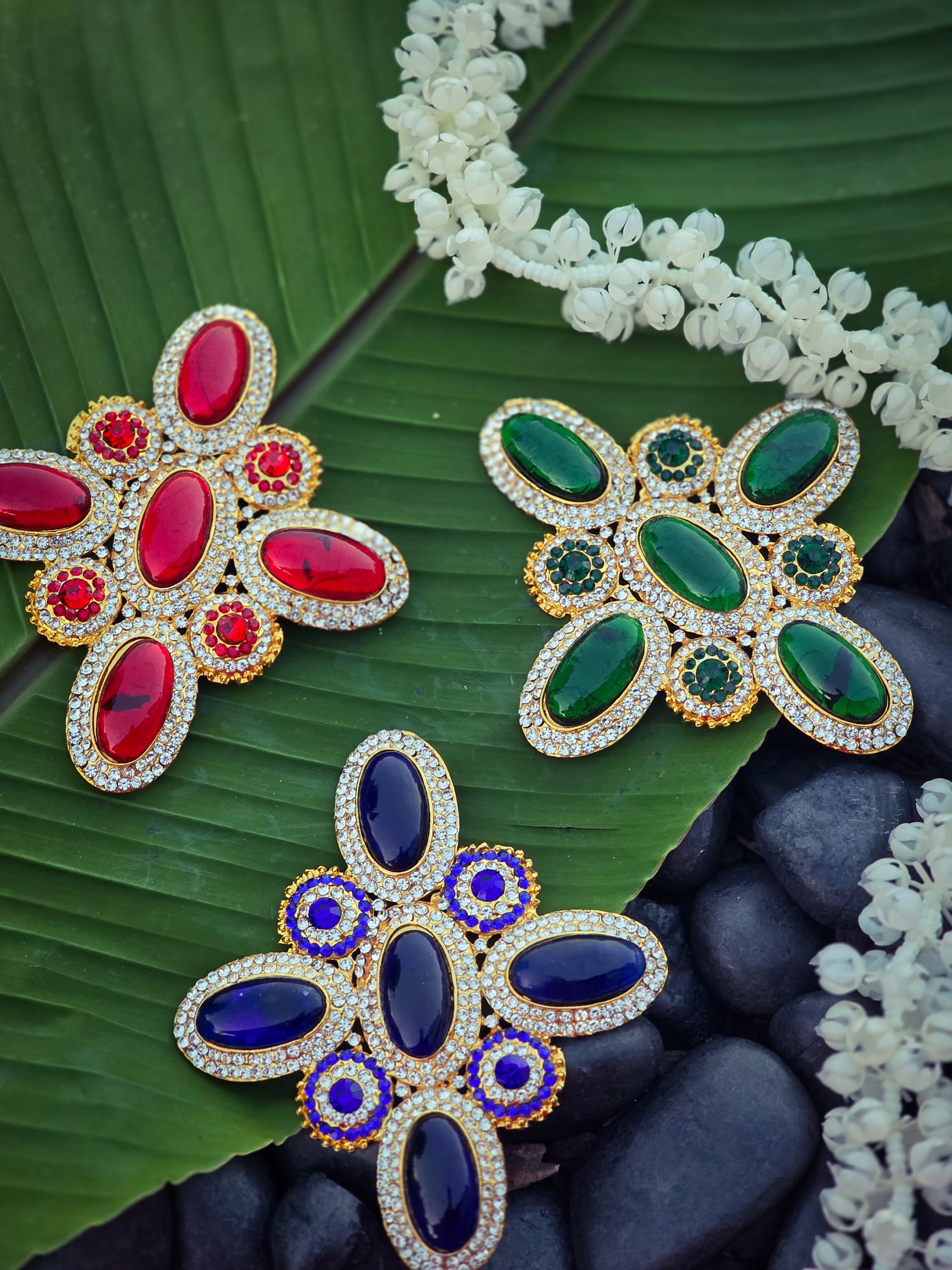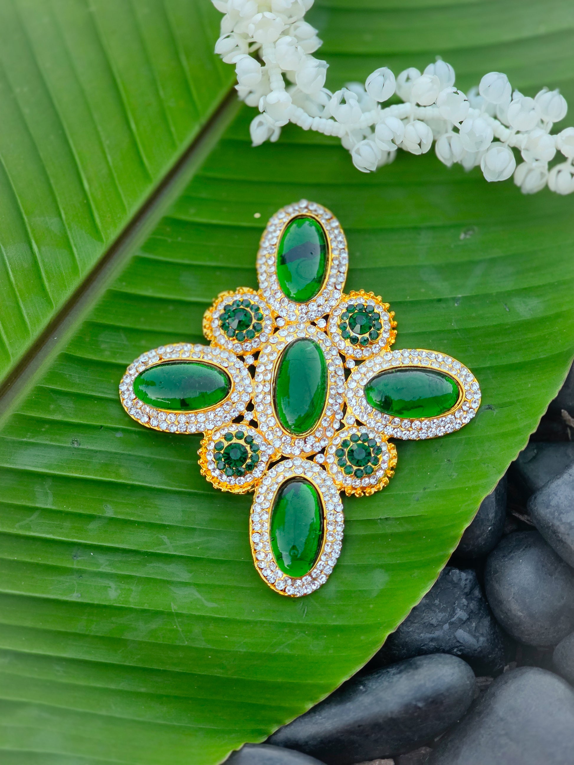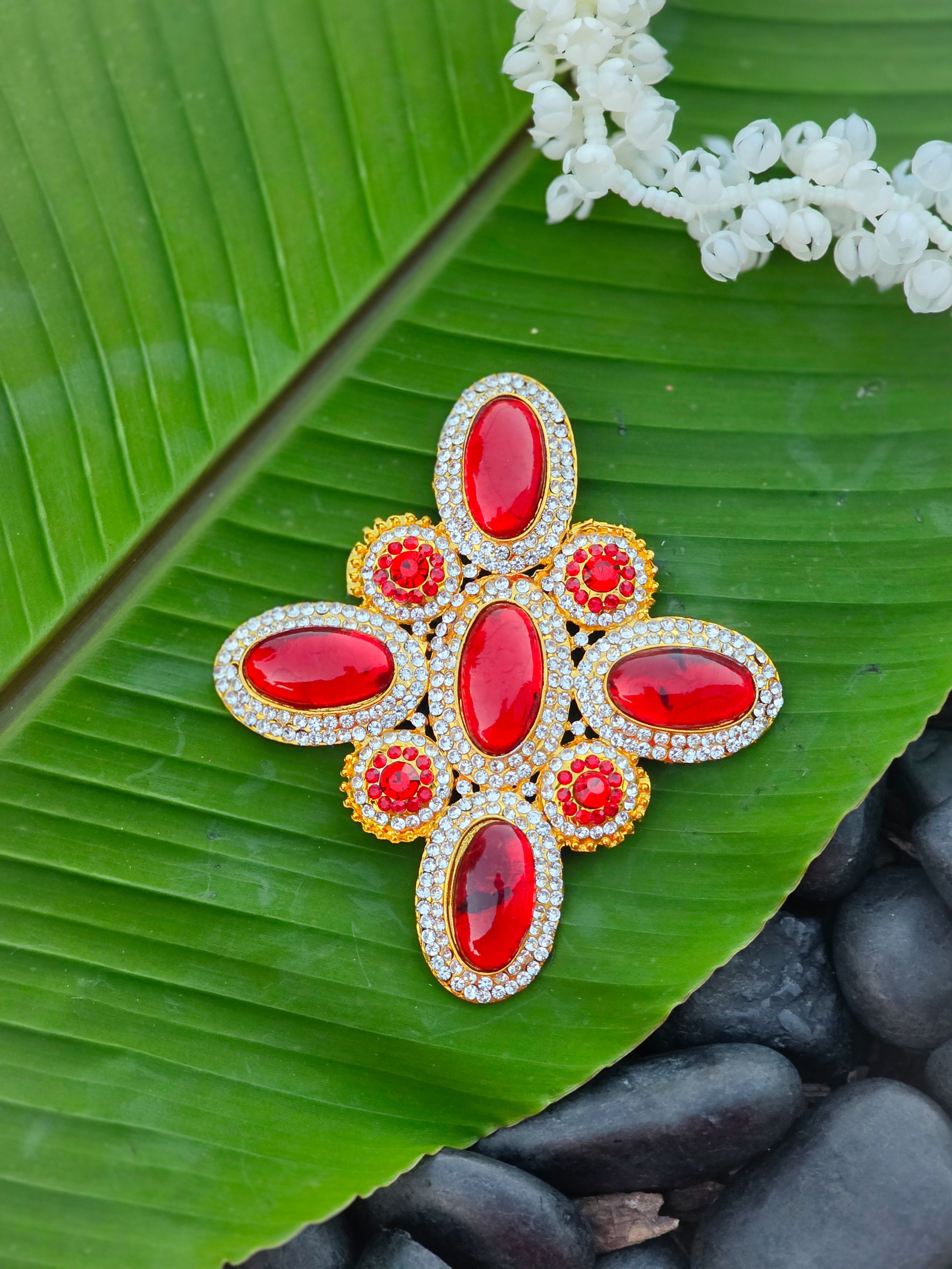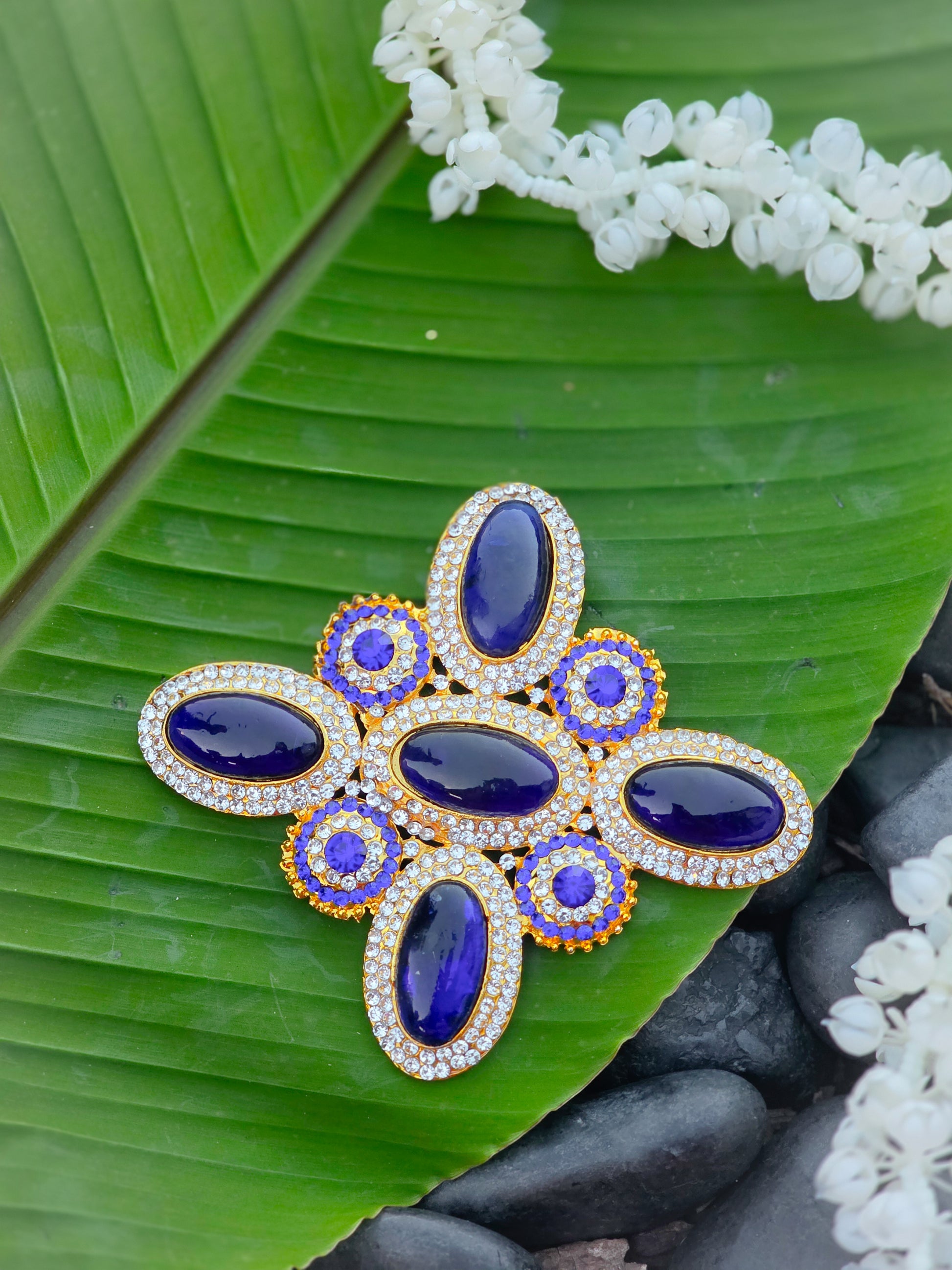 Elevate your pooja space or deity idol with the timeless elegance of Ratna Pathakam, a handcrafted pendant designed for divine adornment. Featuring eight lustrous, deep blue stones arranged in a floral cross pattern, each gem is bordered with shimmering CZ diamonds set in gold-finish alloy. This pendant is perfect for traditional use on deity idols during festivals, daily worship, or as a sacred gift for loved ones.
