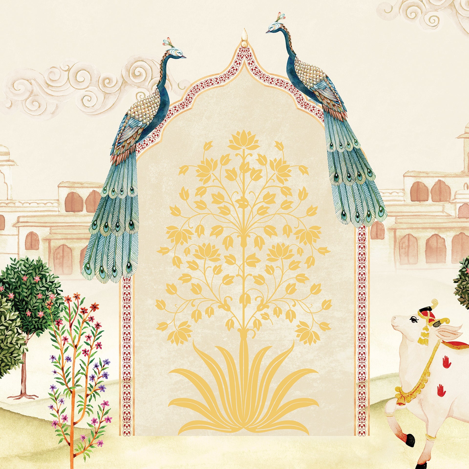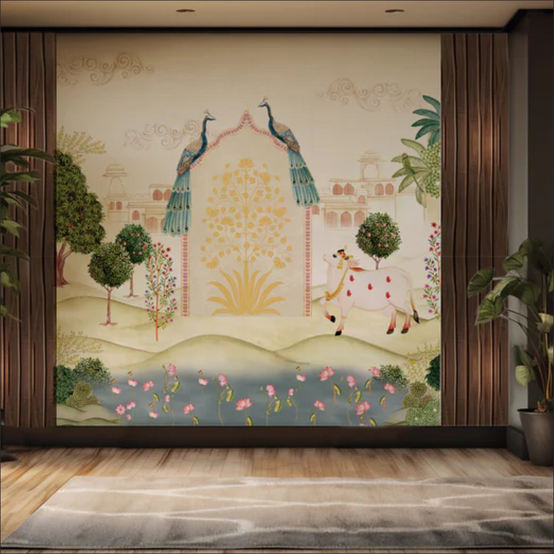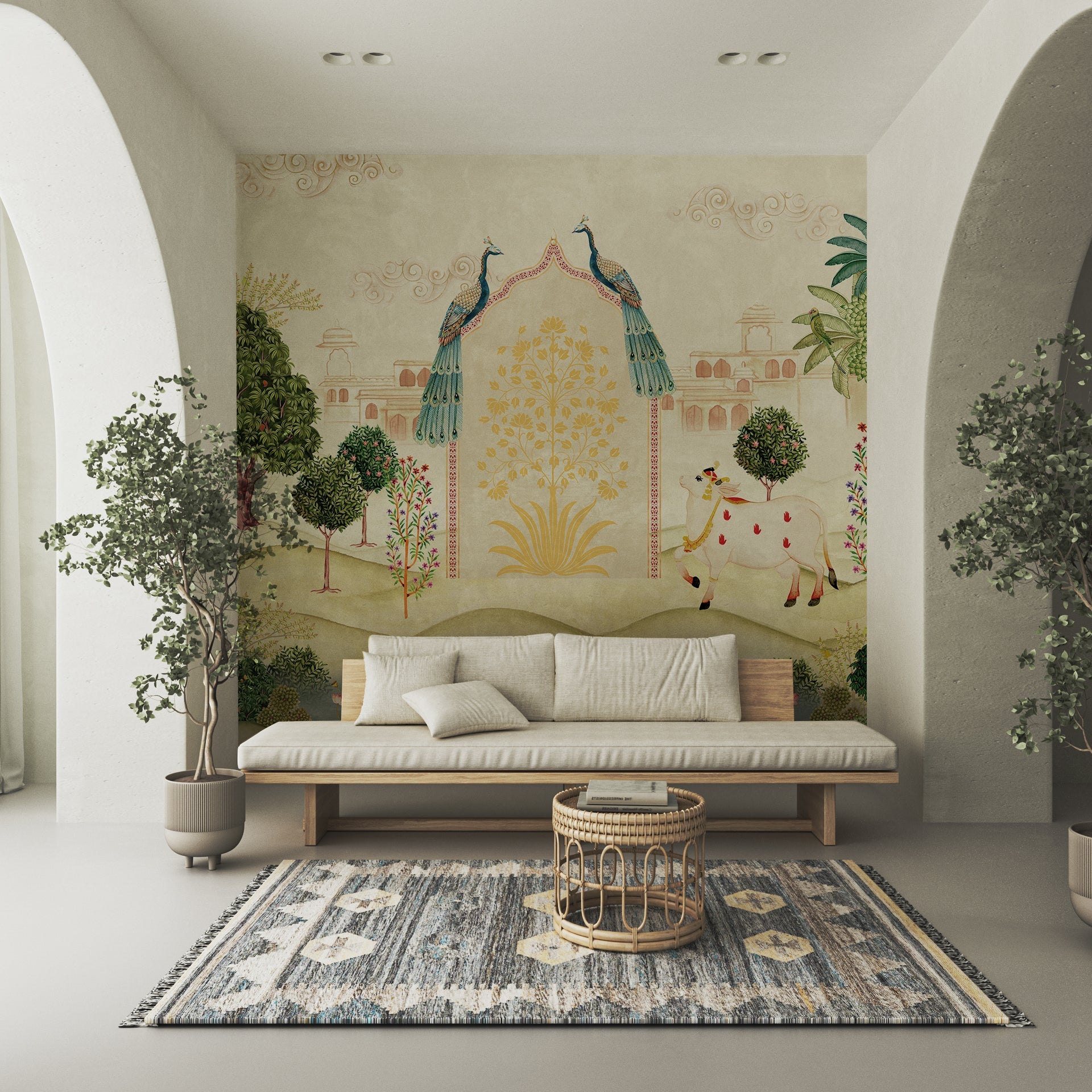 Pichwai peacock and cow wallpaper with domes for living room, guest room, clothing showrooms or office spaces