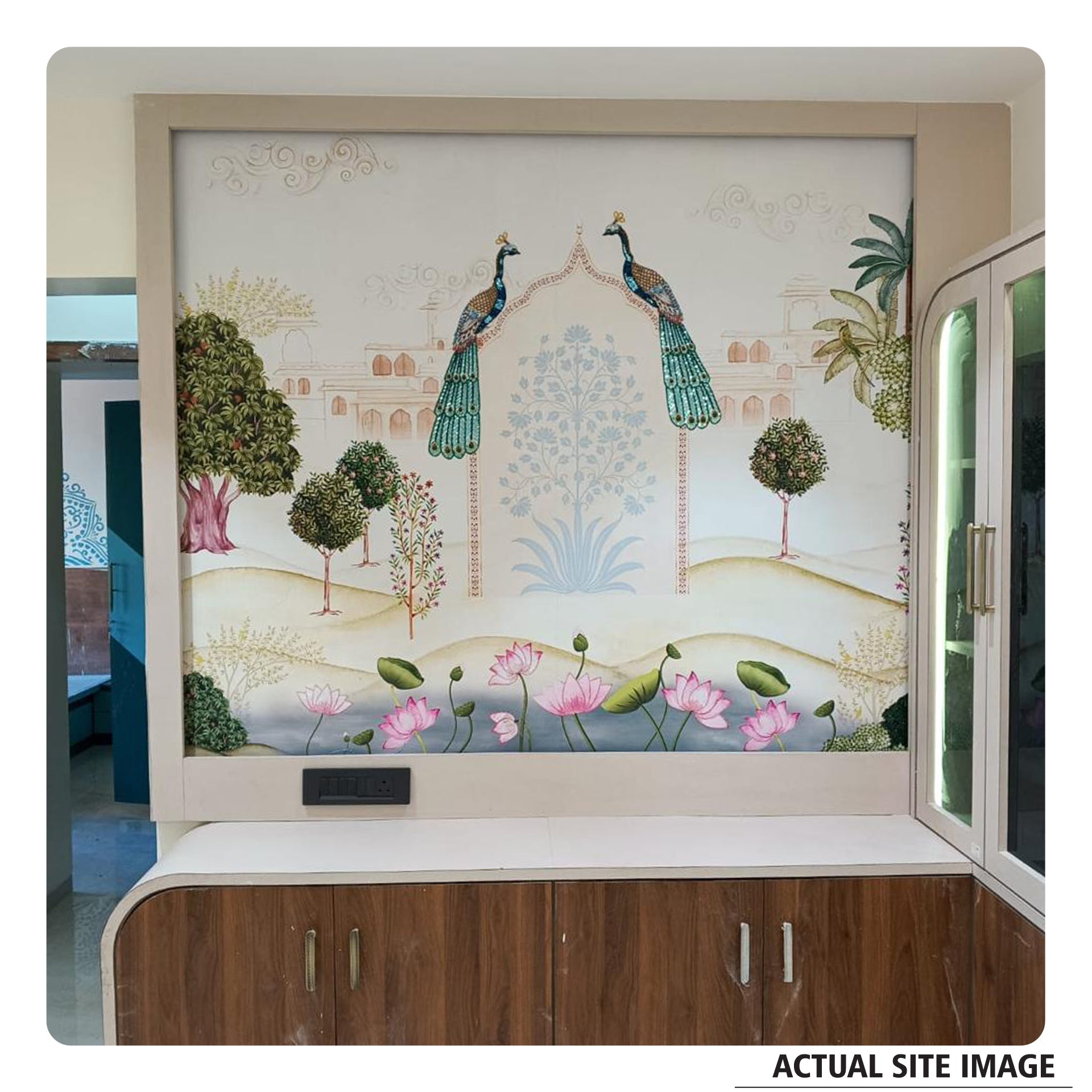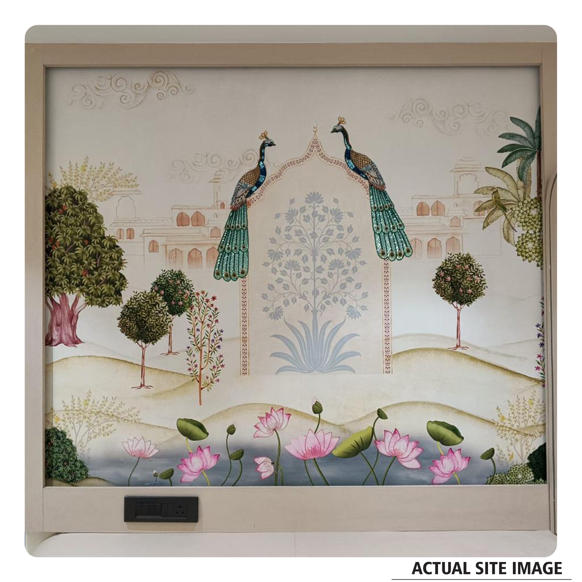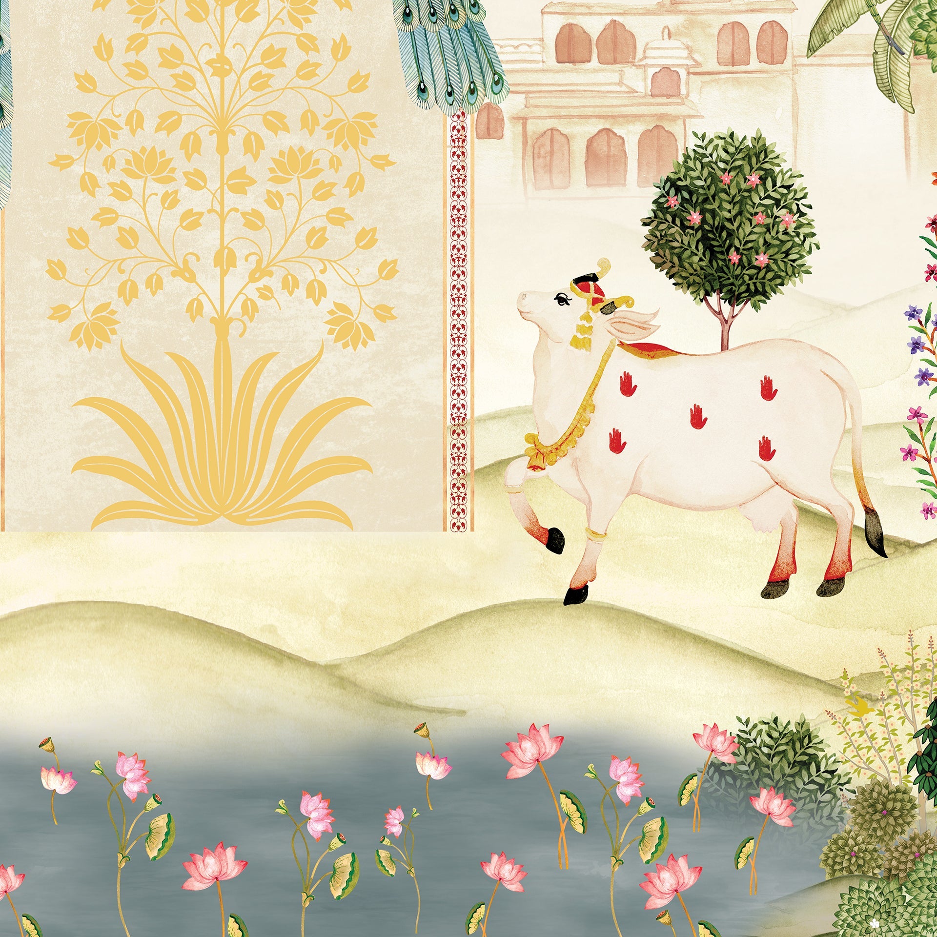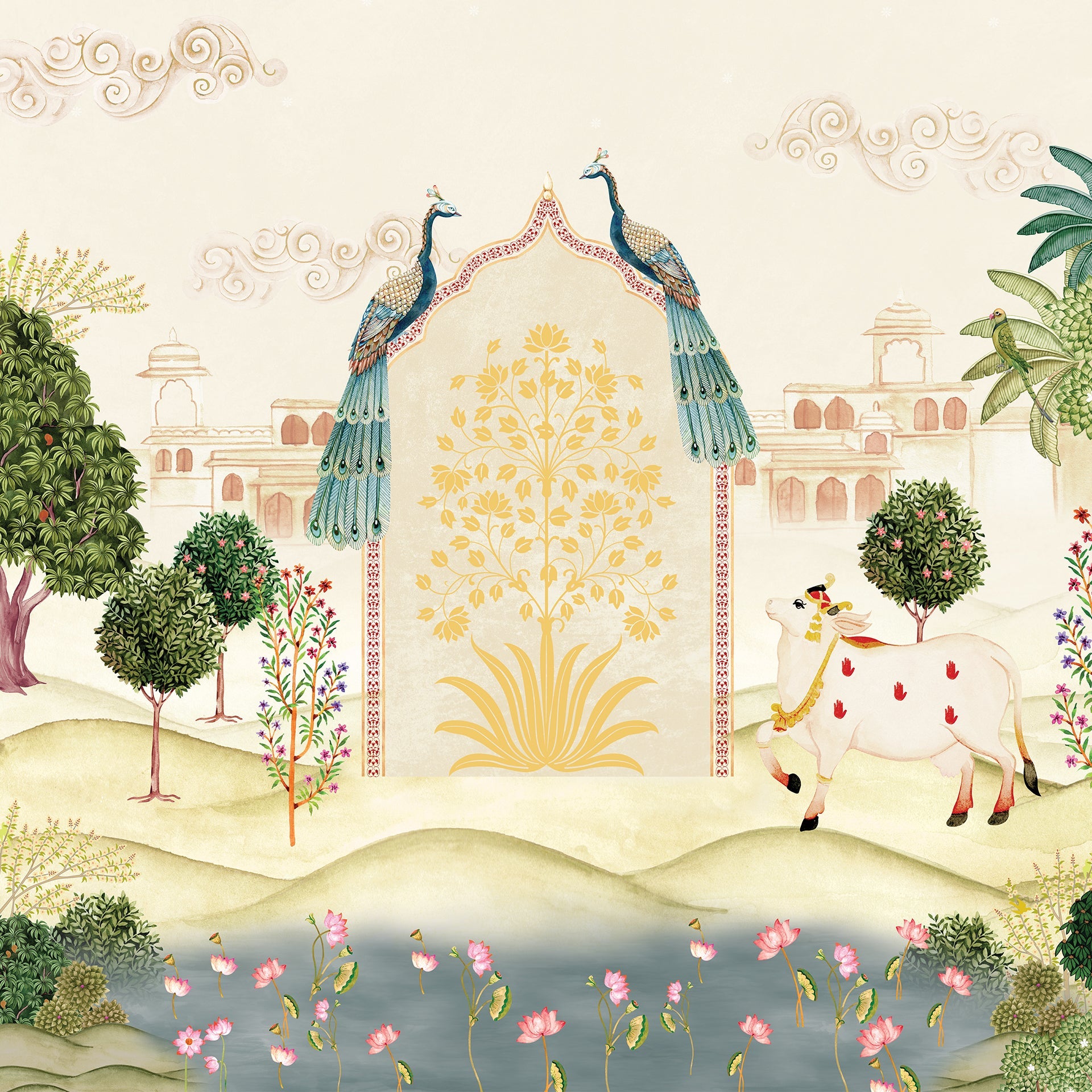 Pichwai peacock and cow wallpaper with domes for living room, guest room, clothing showrooms or office spaces