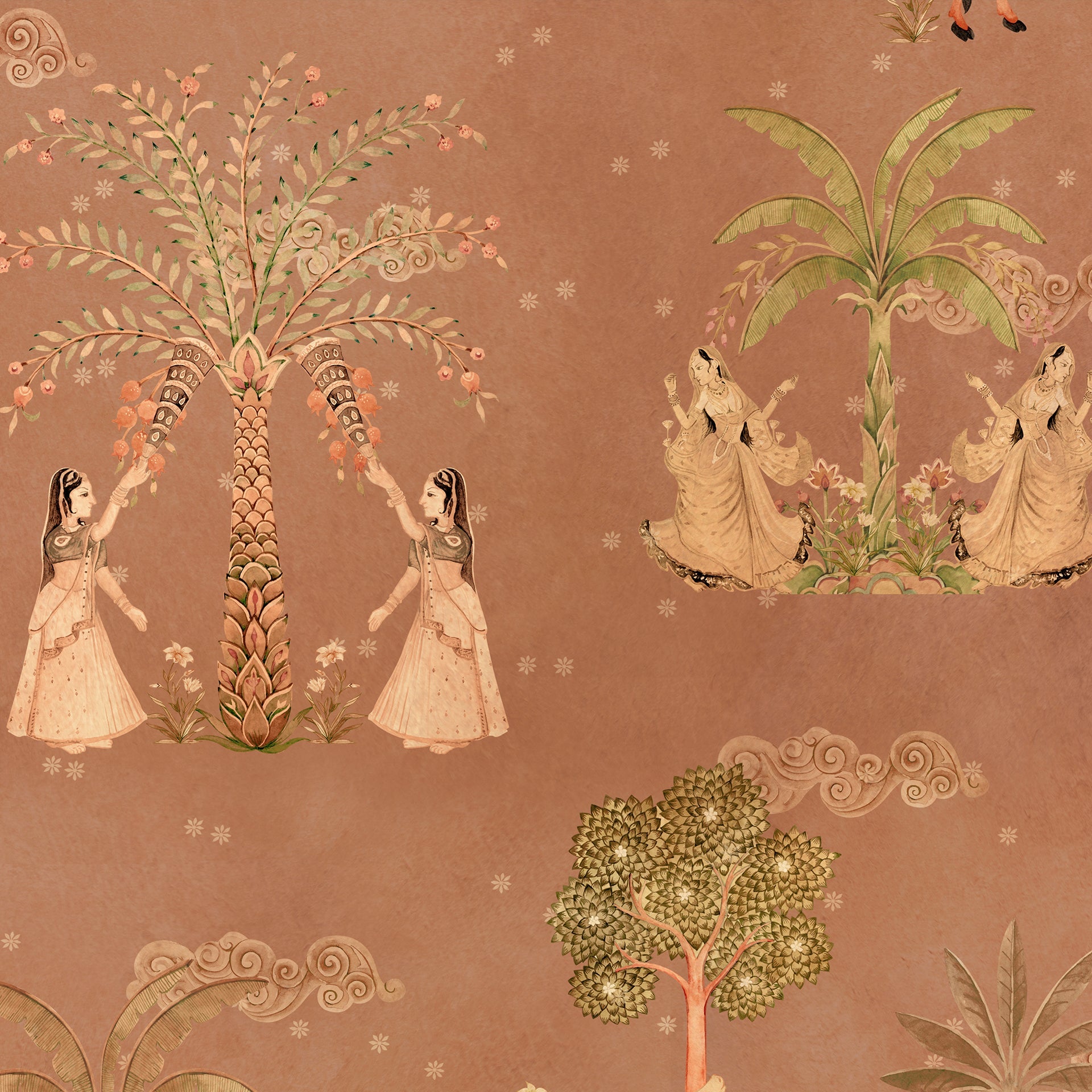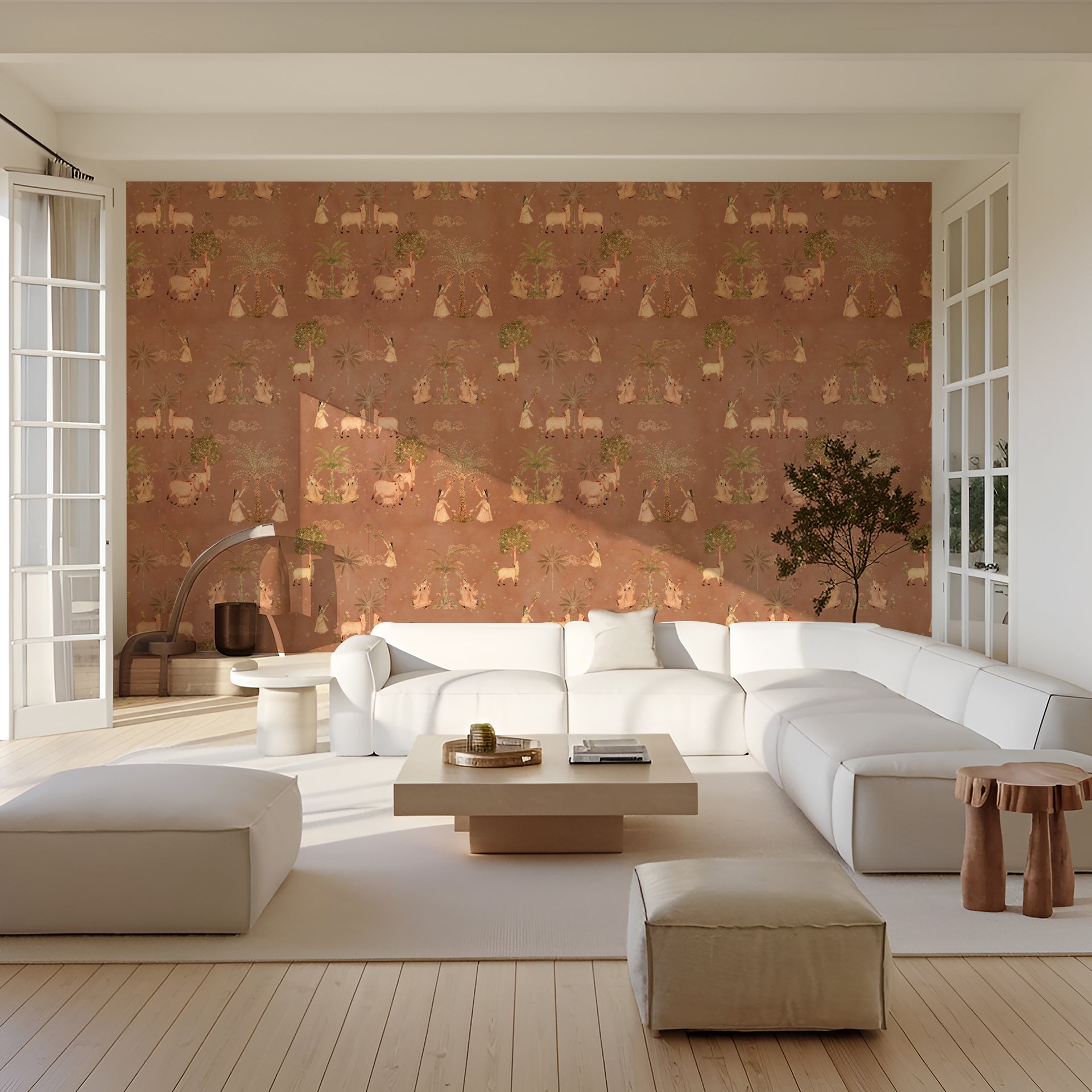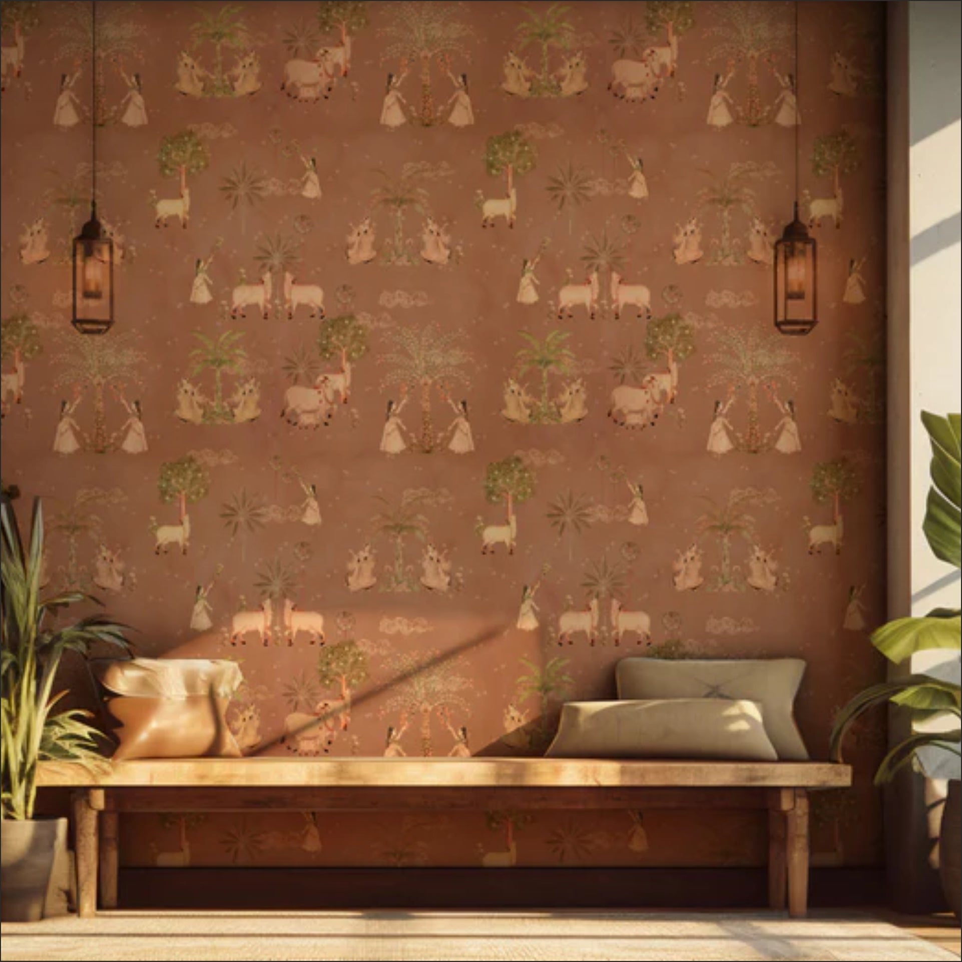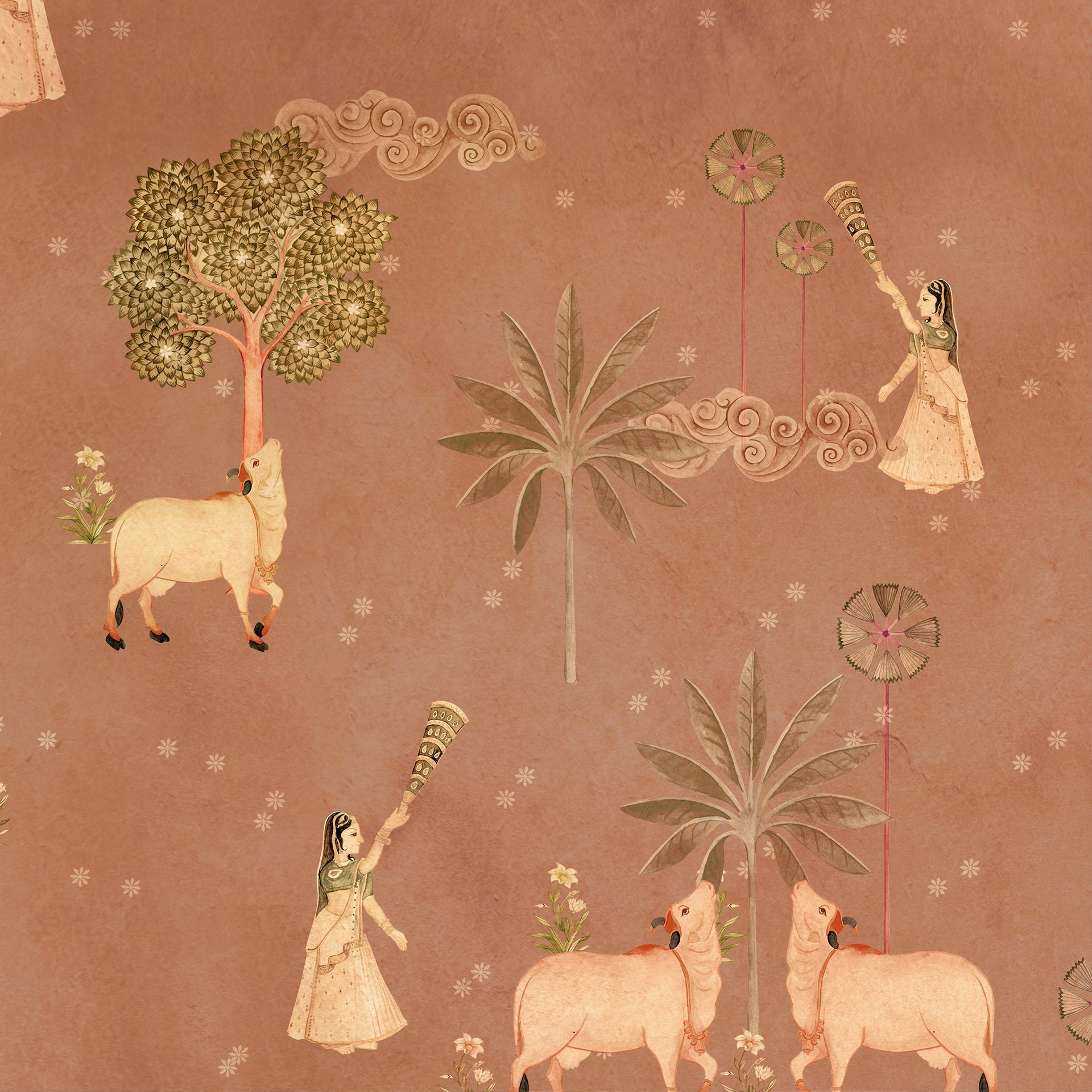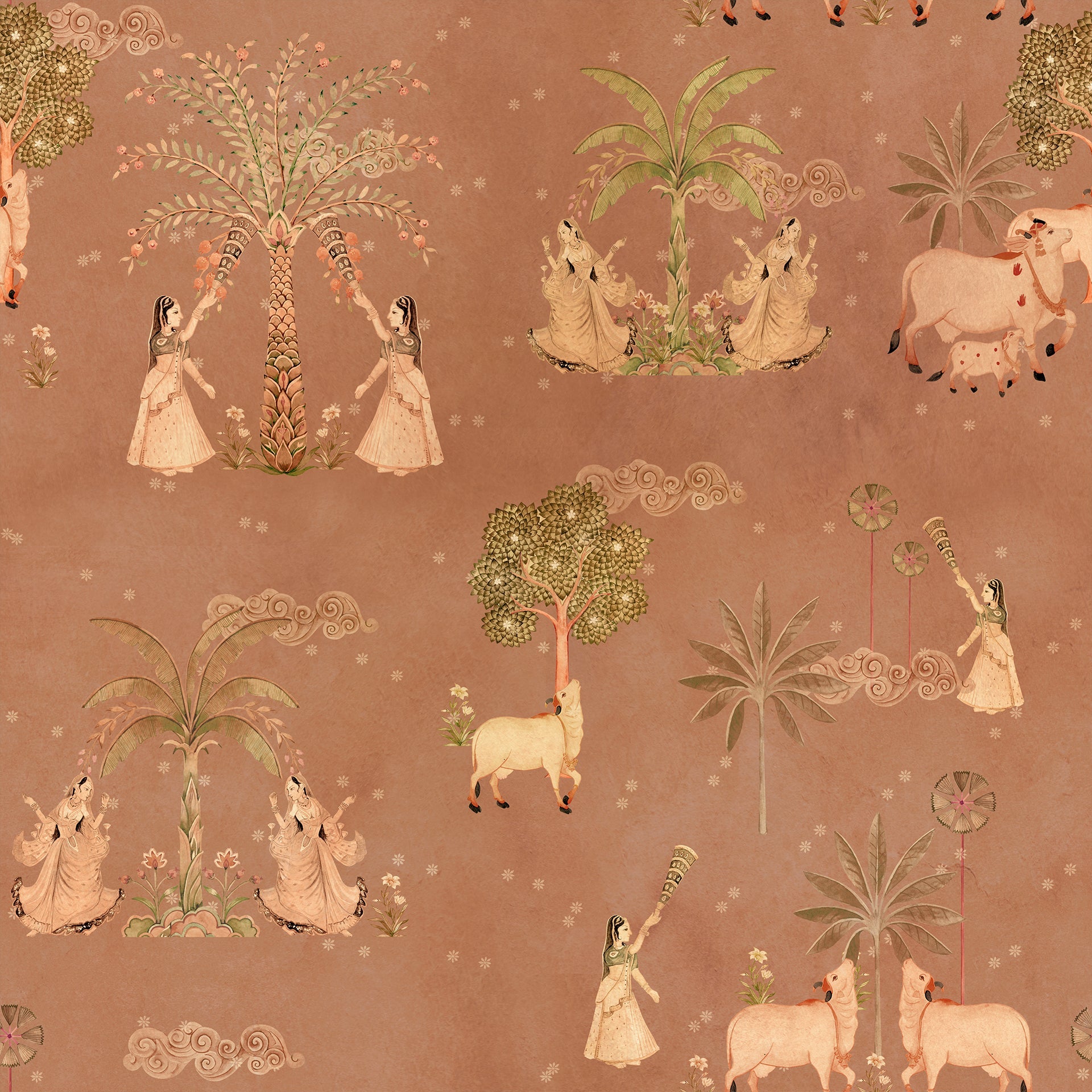 Pichwai rust orange wallpaper with small motifs of gopis and cows. This pichwai wall art design is best for foyer, lobby, passage or living room.