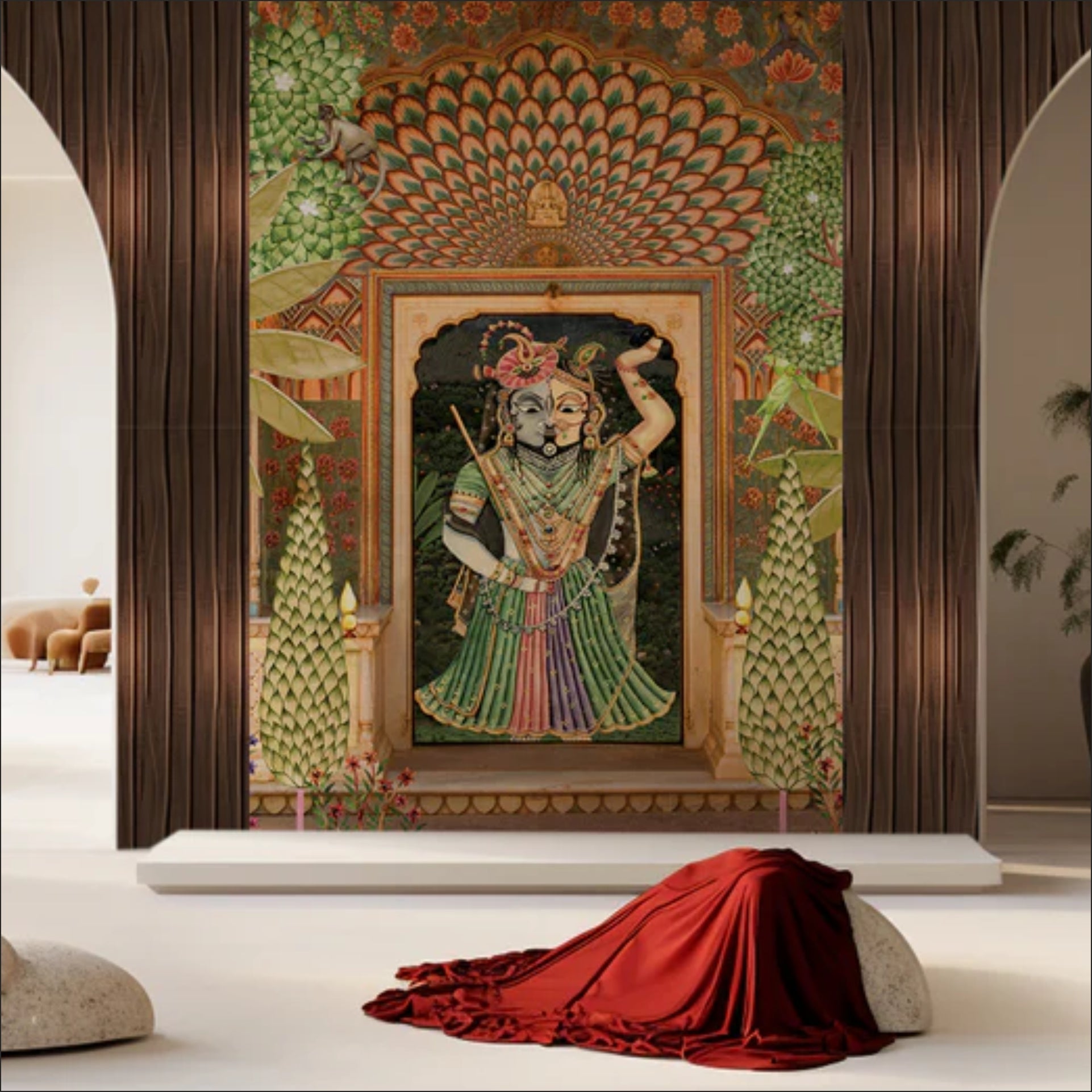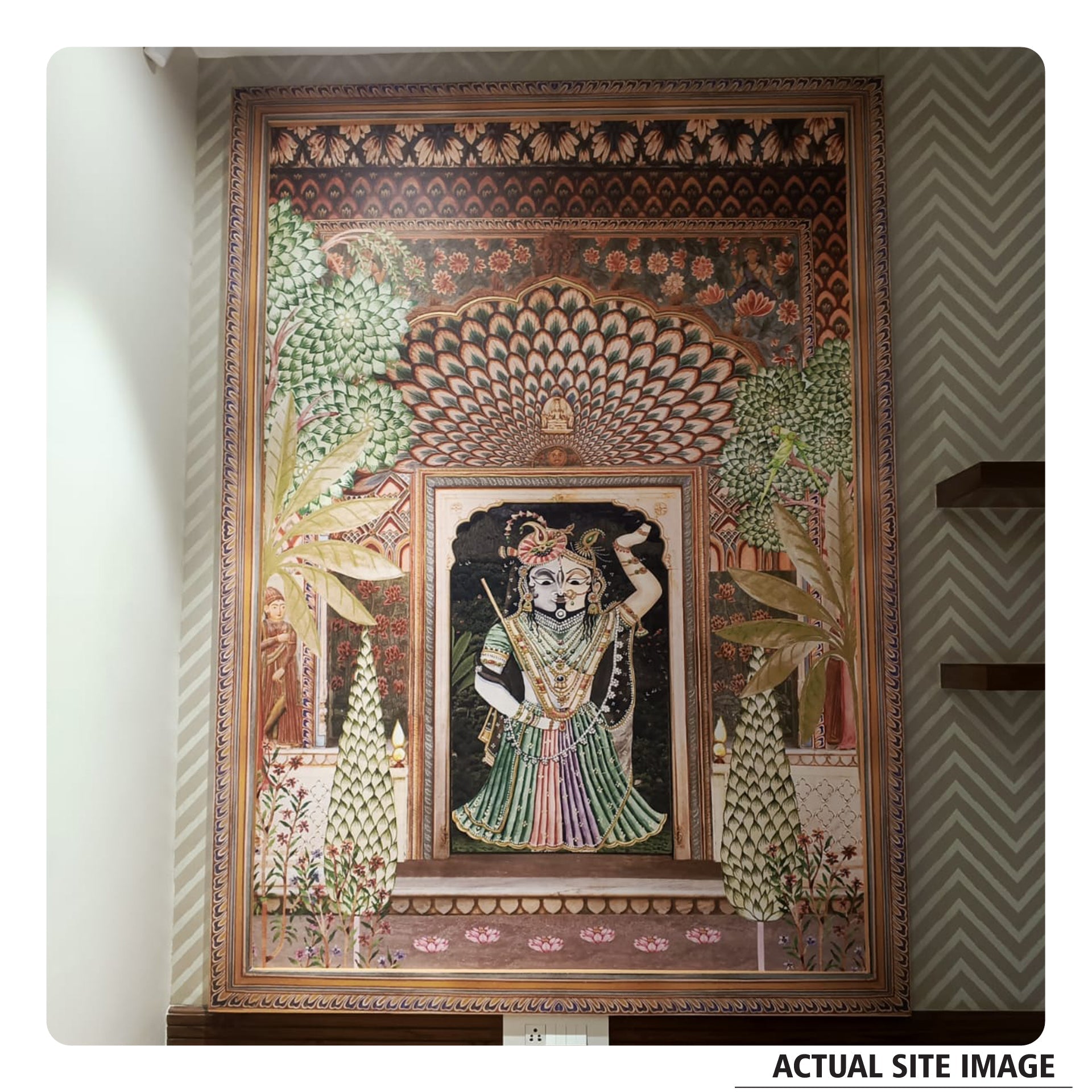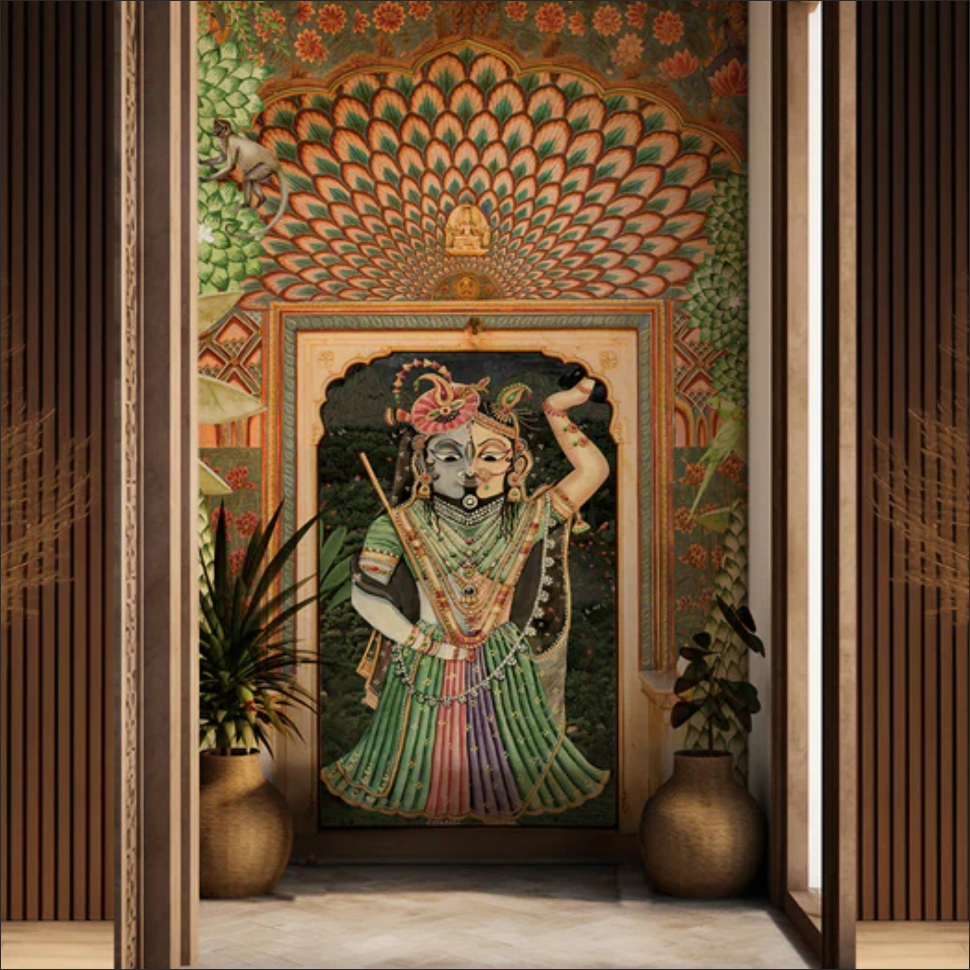Colorful Pichwai Shreenath ji and yamunaji wallpaper for temple walls or Pooja room.