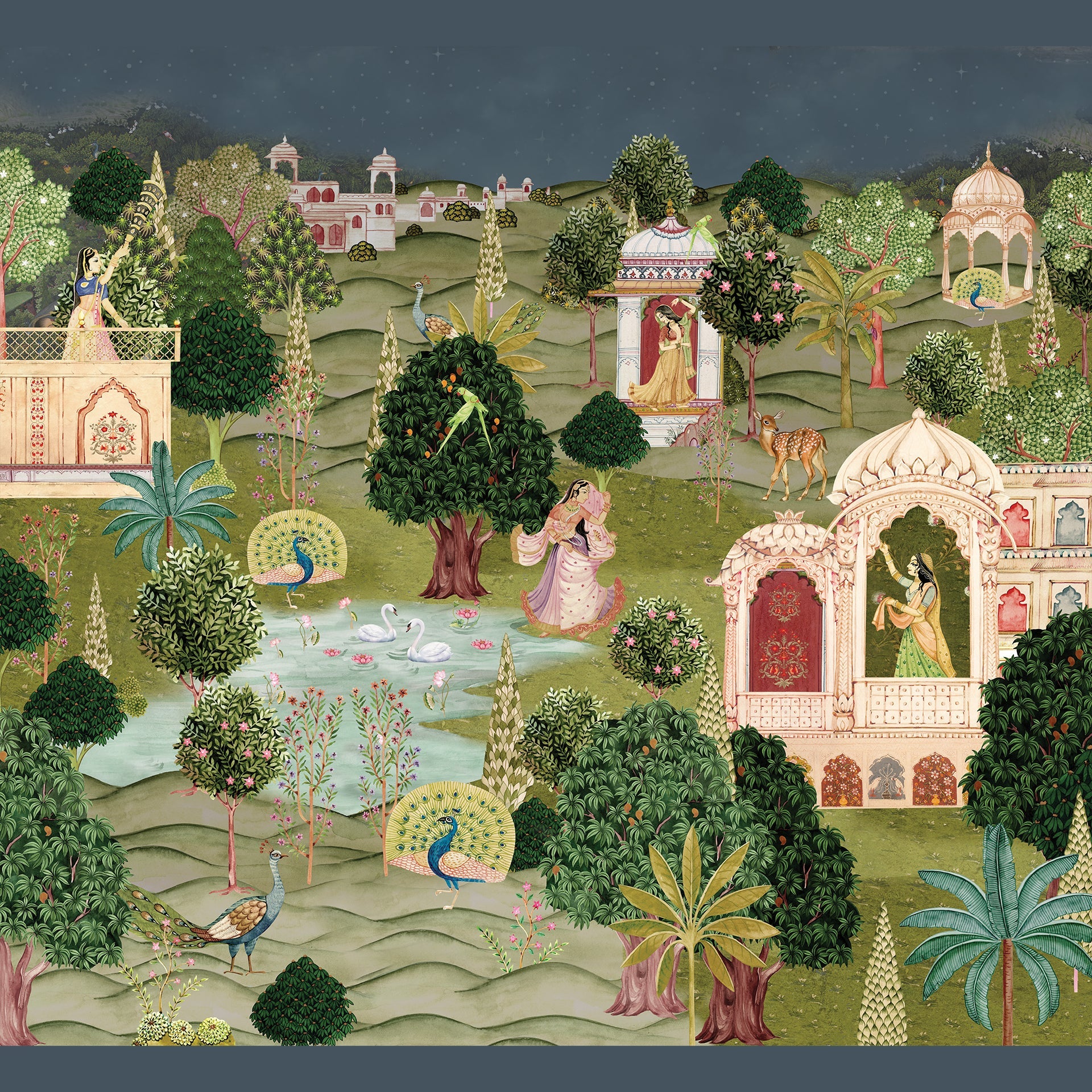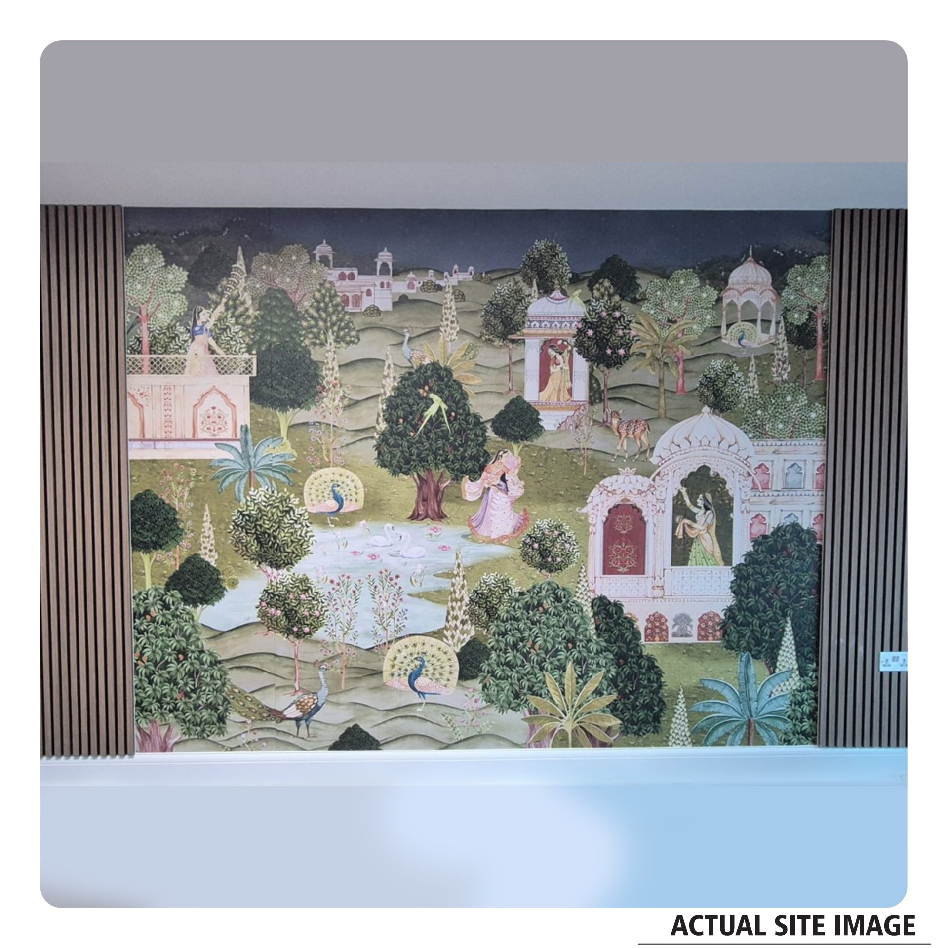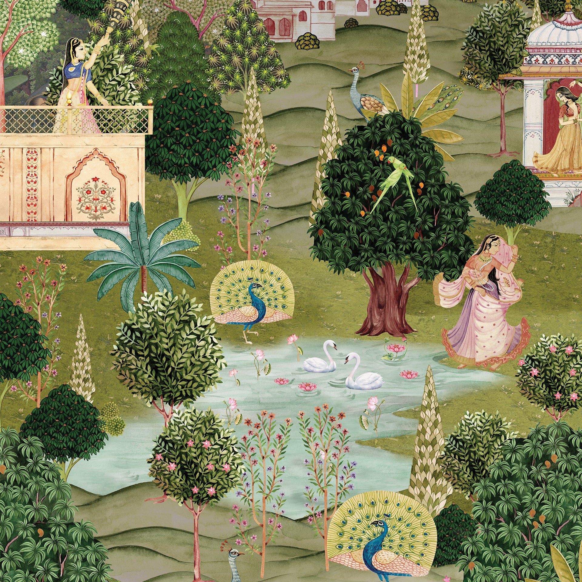 Beautifully detailed Pichwai Vridavan garden wallpaper for living room, foyer area or hallway where gopis and peacock dance joyfully, surrounded by parrouts and a calm lakeside.