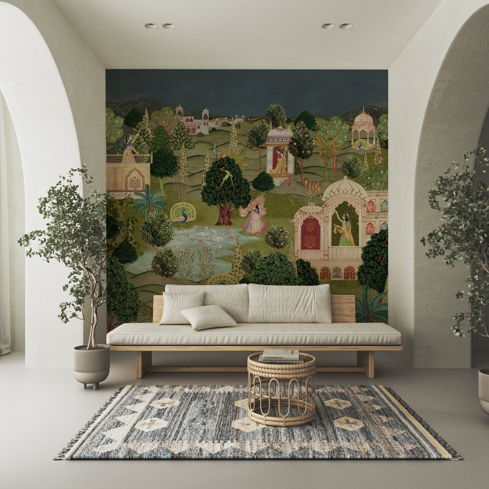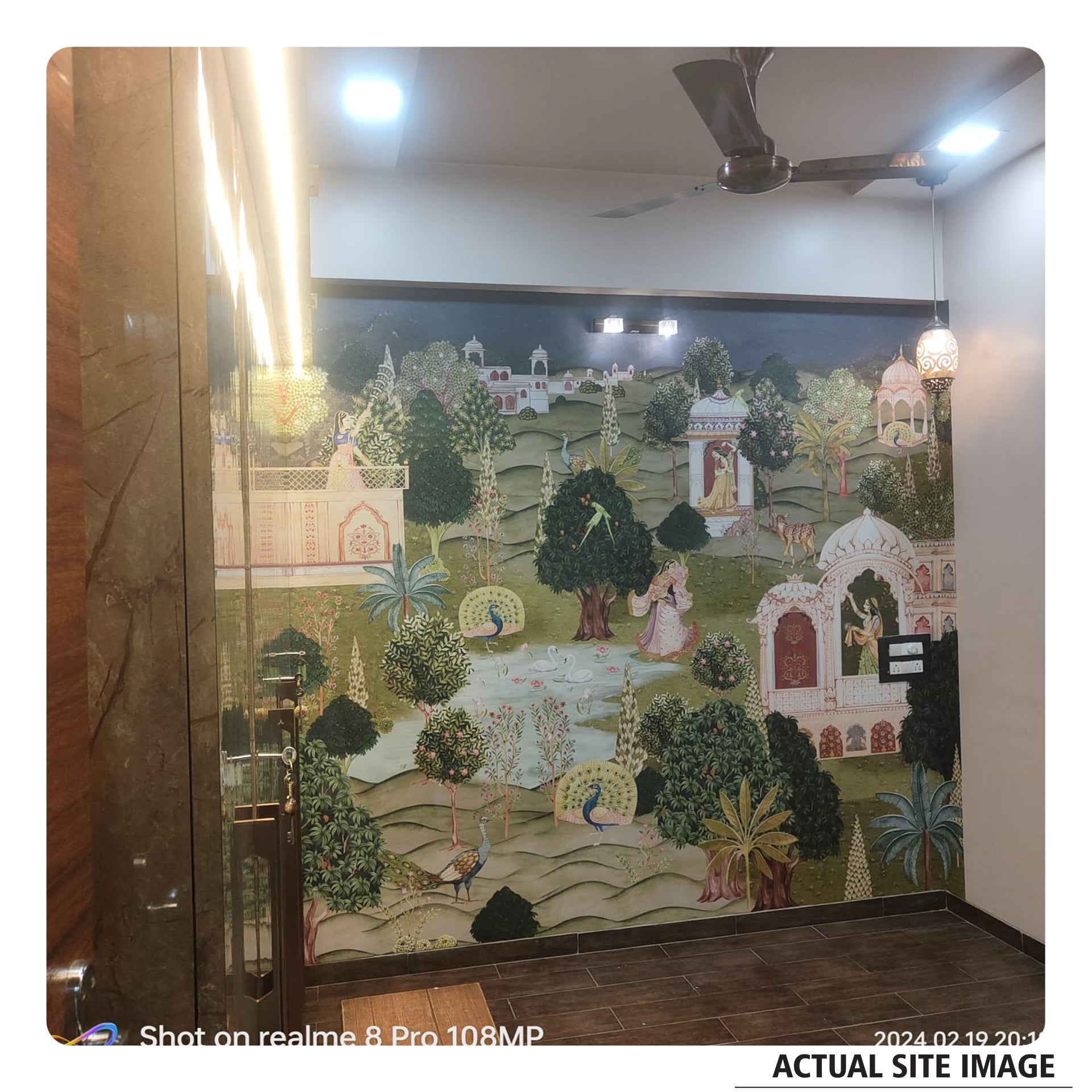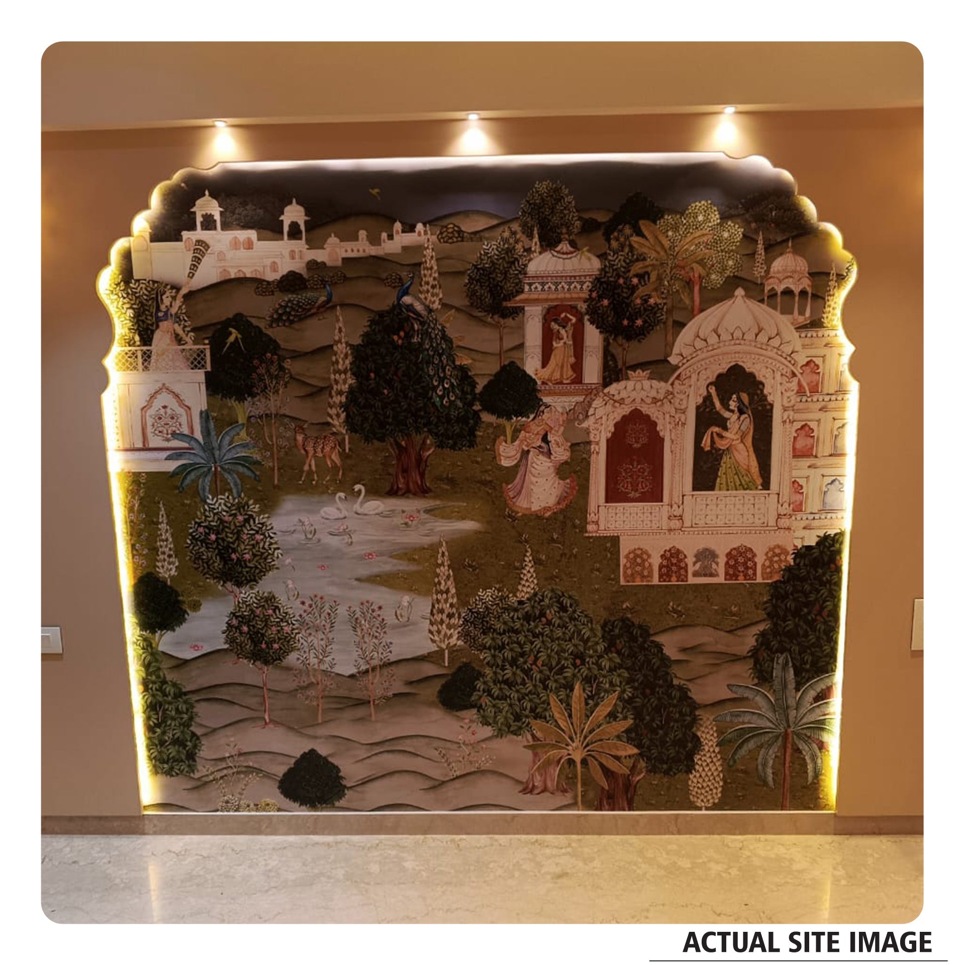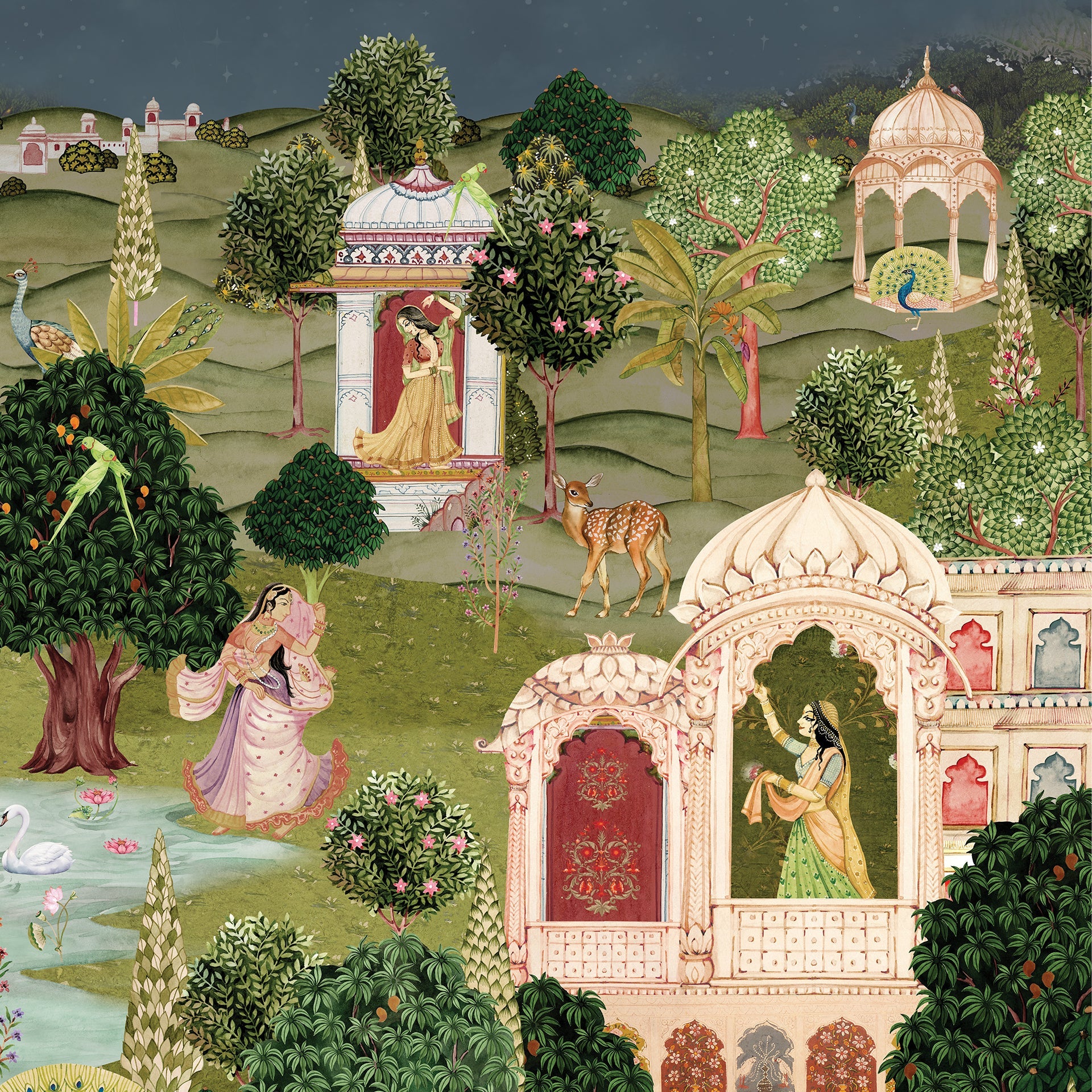 Beautifully detailed Pichwai Vridavan garden wallpaper for living room, foyer area or hallway where gopis and peacock dance joyfully, surrounded by parrouts and a calm lakeside.
