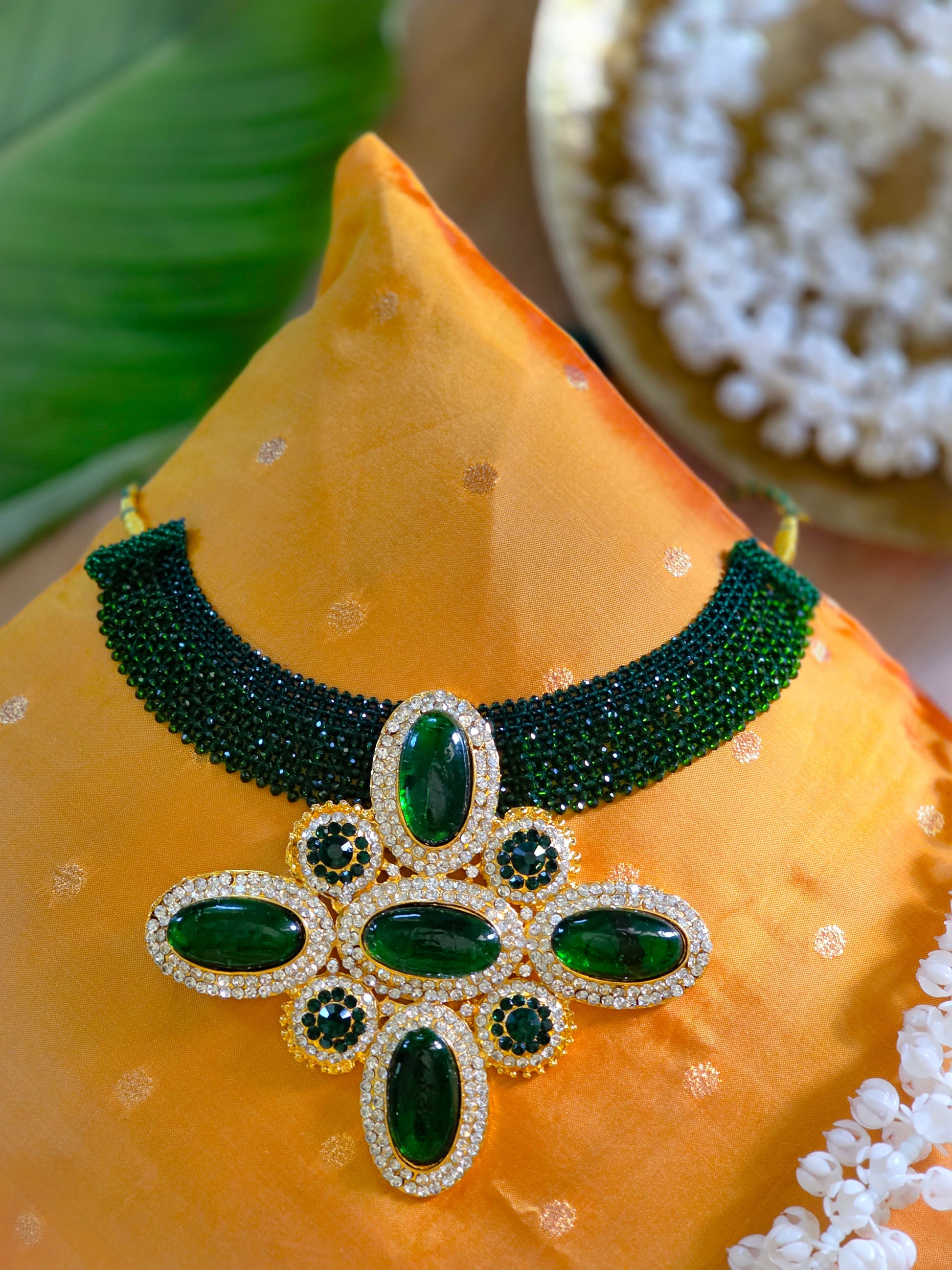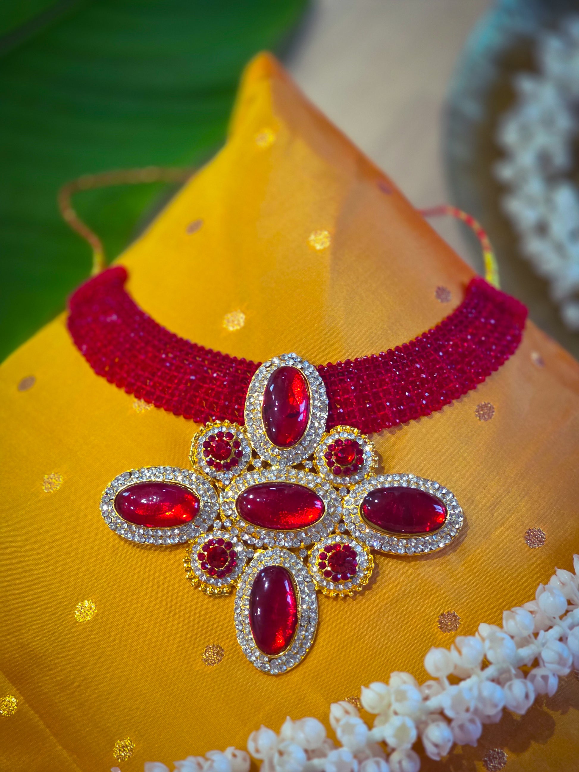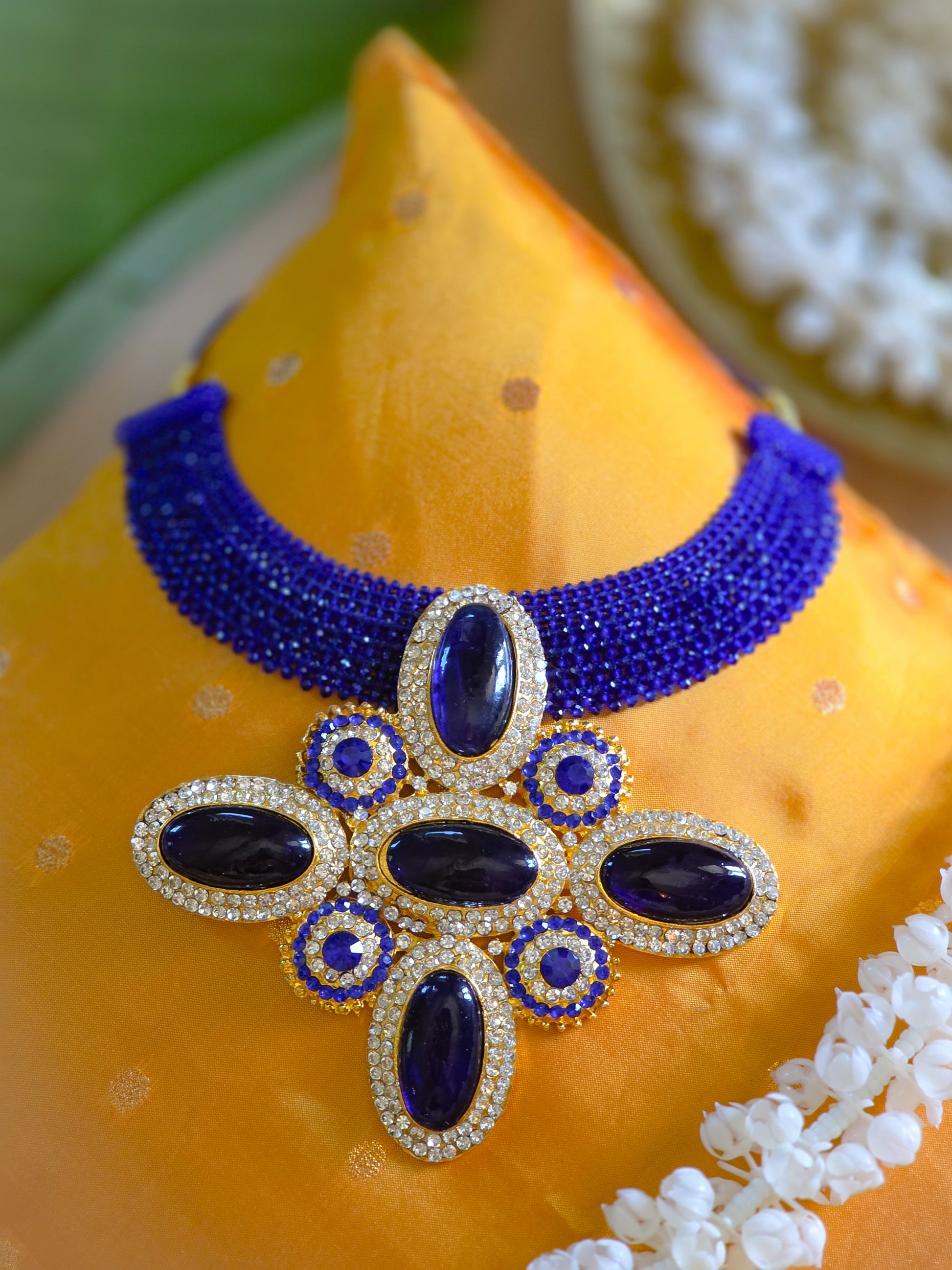 Elevate your pooja space or deity idol with the timeless elegance of Indra Neela Pathakam, a handcrafted pendant designed for divine adornment. Featuring eight lustrous, deep blue stones arranged in a floral cross pattern, each gem is bordered with shimmering CZ diamonds set in gold-finish alloy. This pendant is perfect for traditional use on deity idols during festivals, daily worship, or as a sacred gift for loved ones.